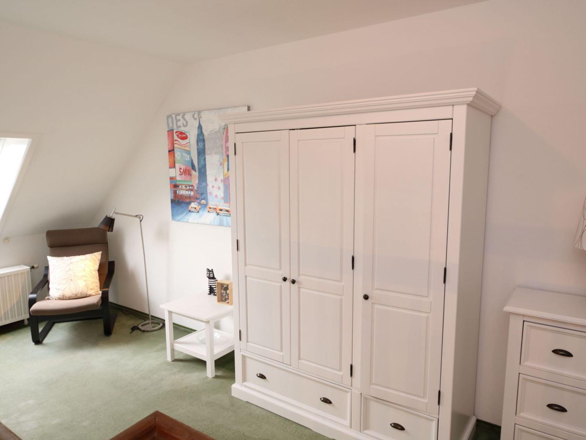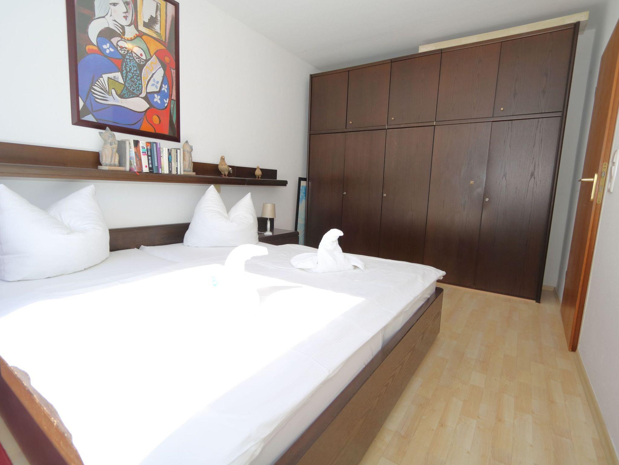 Ein Schlafzimmer mit Doppelbett sowie Kleiderschrank.