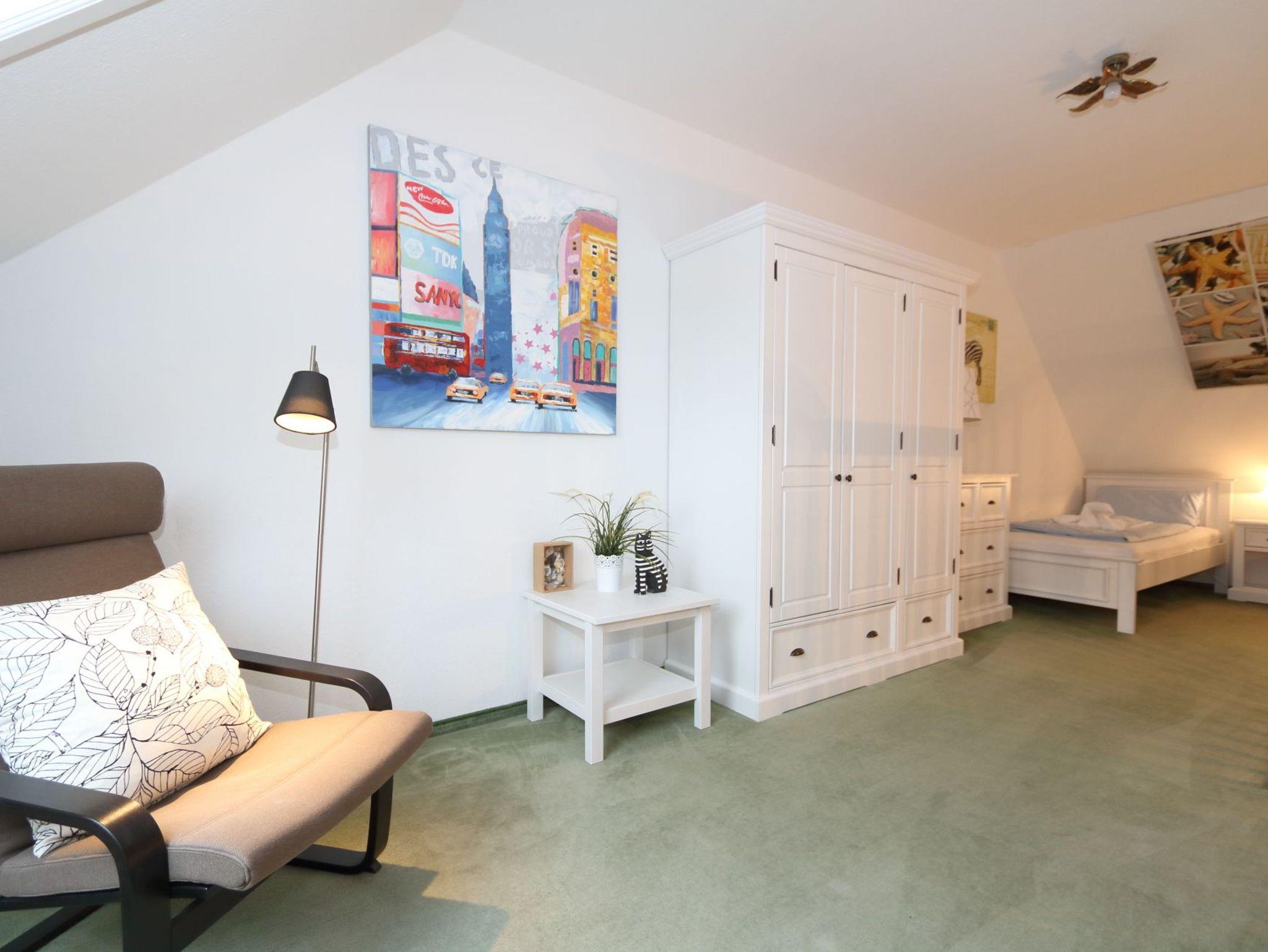 Ein Schlafzimmer mit Einzellbetten sowie Kleiderschrank.
