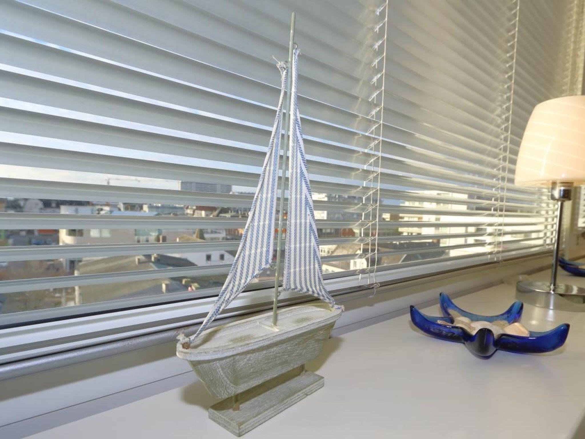 Im Wohnzimmer des Appartements stehen 2 Sessel und vor dem Fenster der Essplatz mit dem weitem Blick über die Stadt Richtung Nordsee. In einer Schrankwand sind zwei einzeln aufklappbare zusammenstehende Schrankbetten untergebracht. Die Küchenzeile ist zum Wohnzimmer hin offen. Das Bad hat eine Dusche.