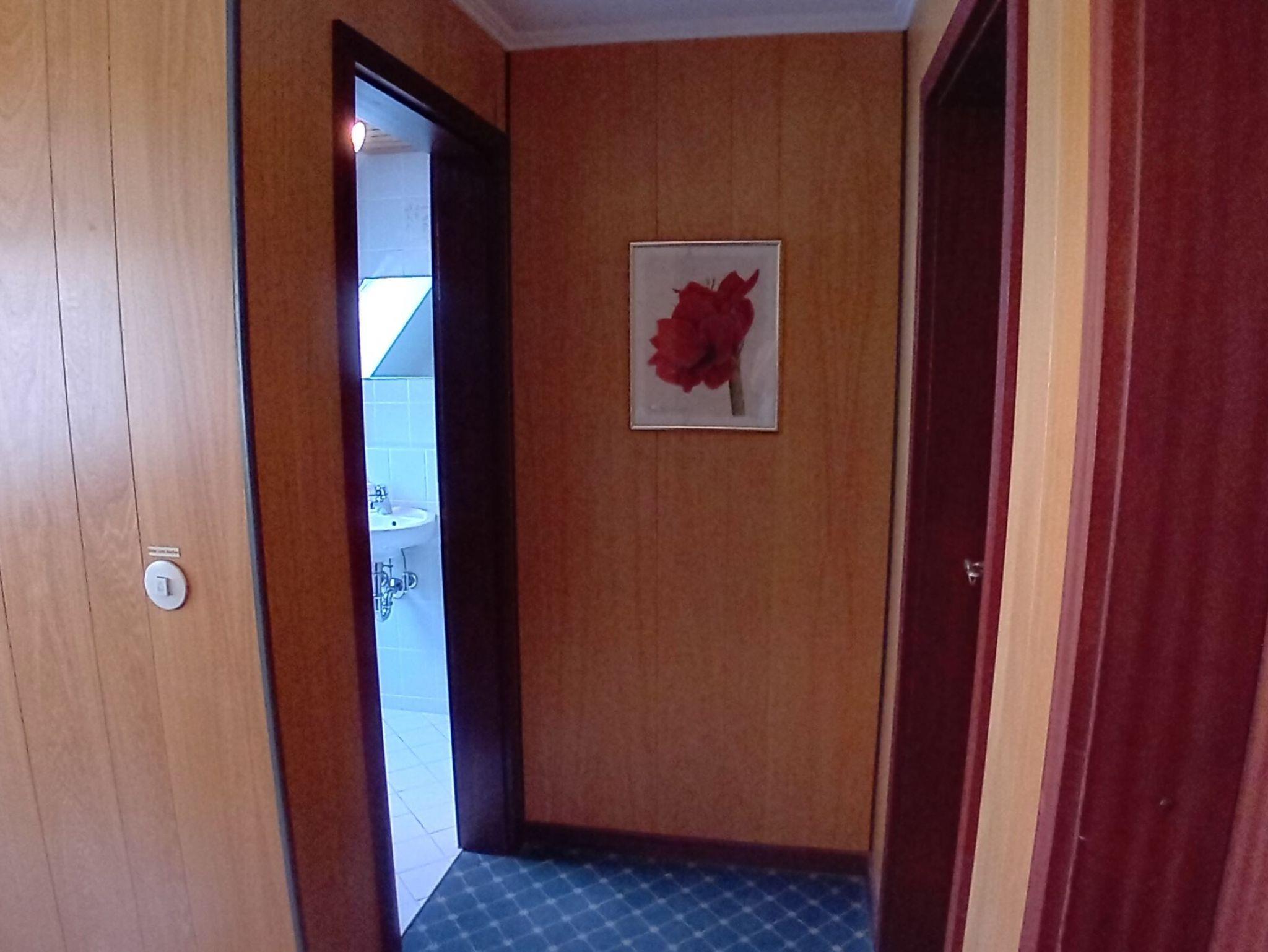 Einzelzimmer im 1.OG ist mit einem Kleiderschrank, Sessel und Tisch, Flachbild TV sowie mit einem Waschbecken ausgestattet. Das Badezimmer befindet sich nur wenige Schritte vom Zimmer auf der Etage entfernt, Sie nutzen es mit einer weiteren Person aus dem 2. Einzelzimmer.
