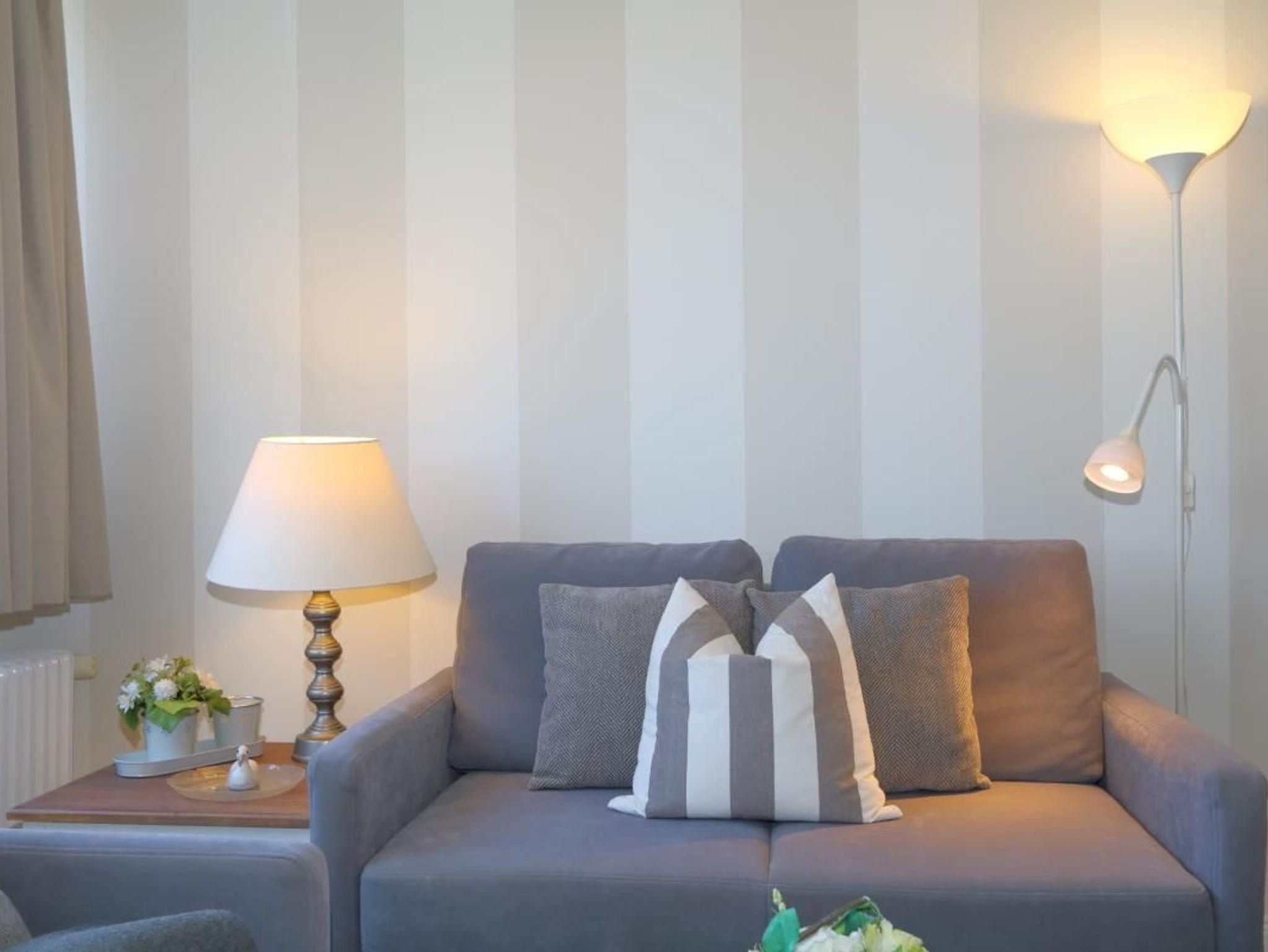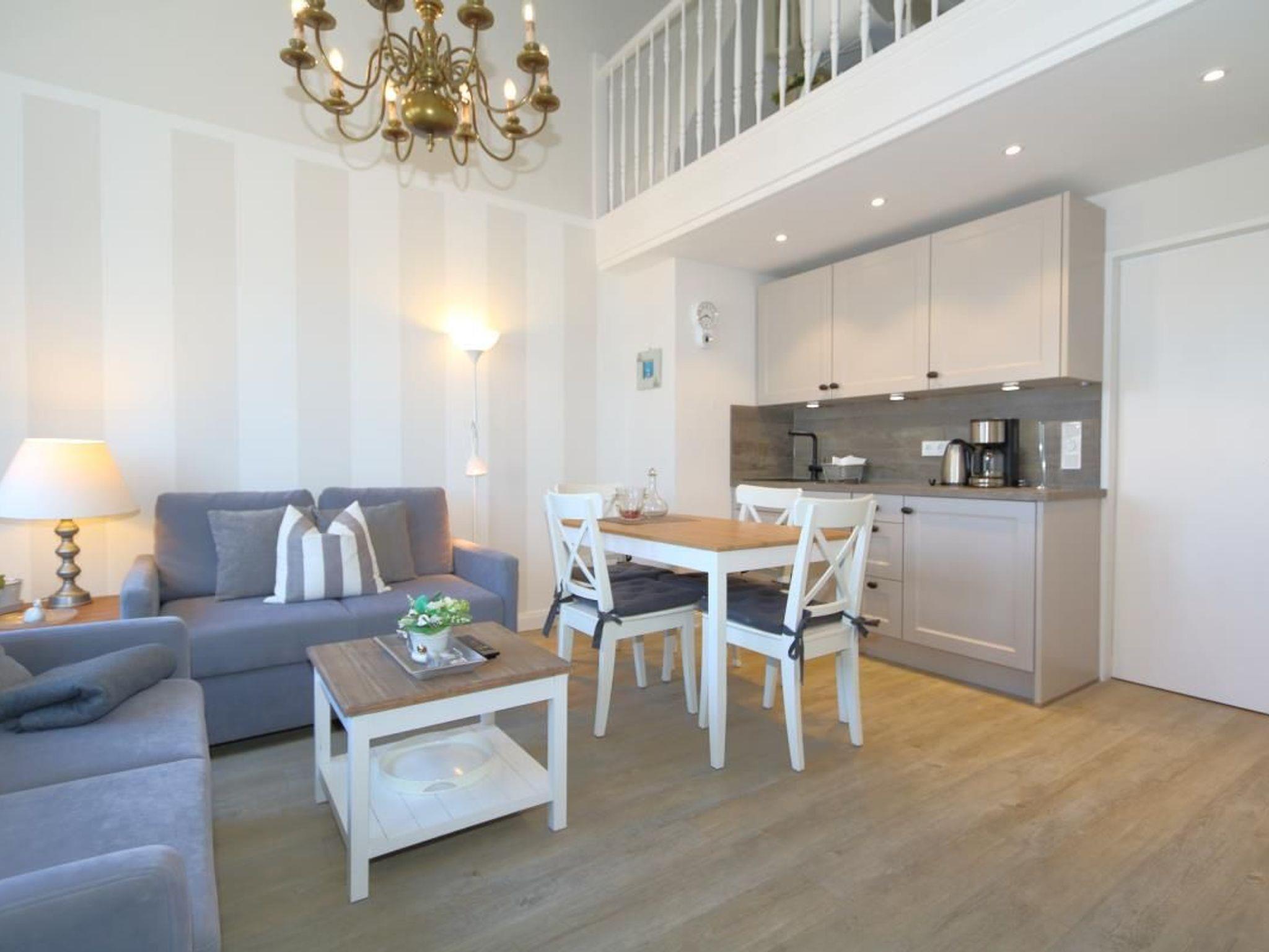 Ein moderner Einrichtungsstiel in hellen Farben erwartet Sie. Wohnzimmer mit bequemer Sitzgarnitur und gemütlichem Esstresen. Flachbildschirm und Radio sowie W'Lan