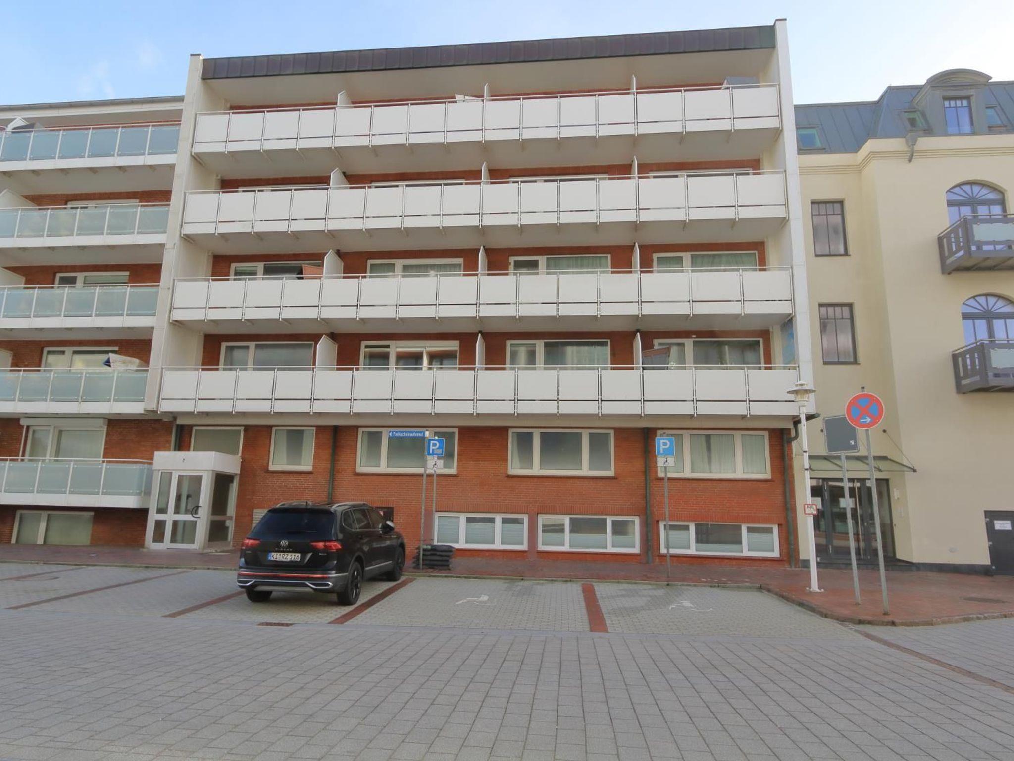 Das Appartementhaus steht gegenüber dem Kurzentrum in unmittelbarer Nähe der Fußgängerzone Friedrichstraße. Zum Strand sind es keine 100 m. Das Appartement befindet sich in der 4. Etage (Aufzug über einige Stufen zu erreichen) und hat einen Westbalkon.