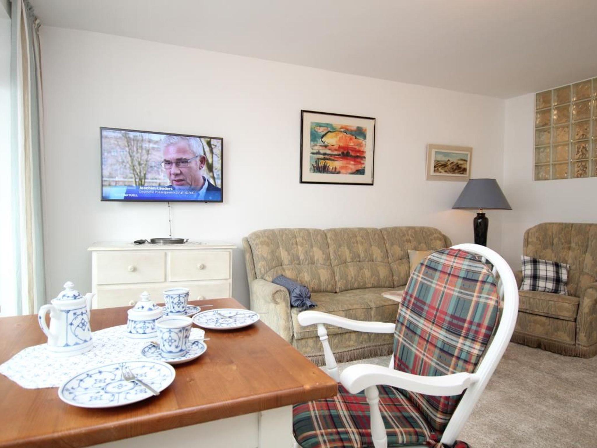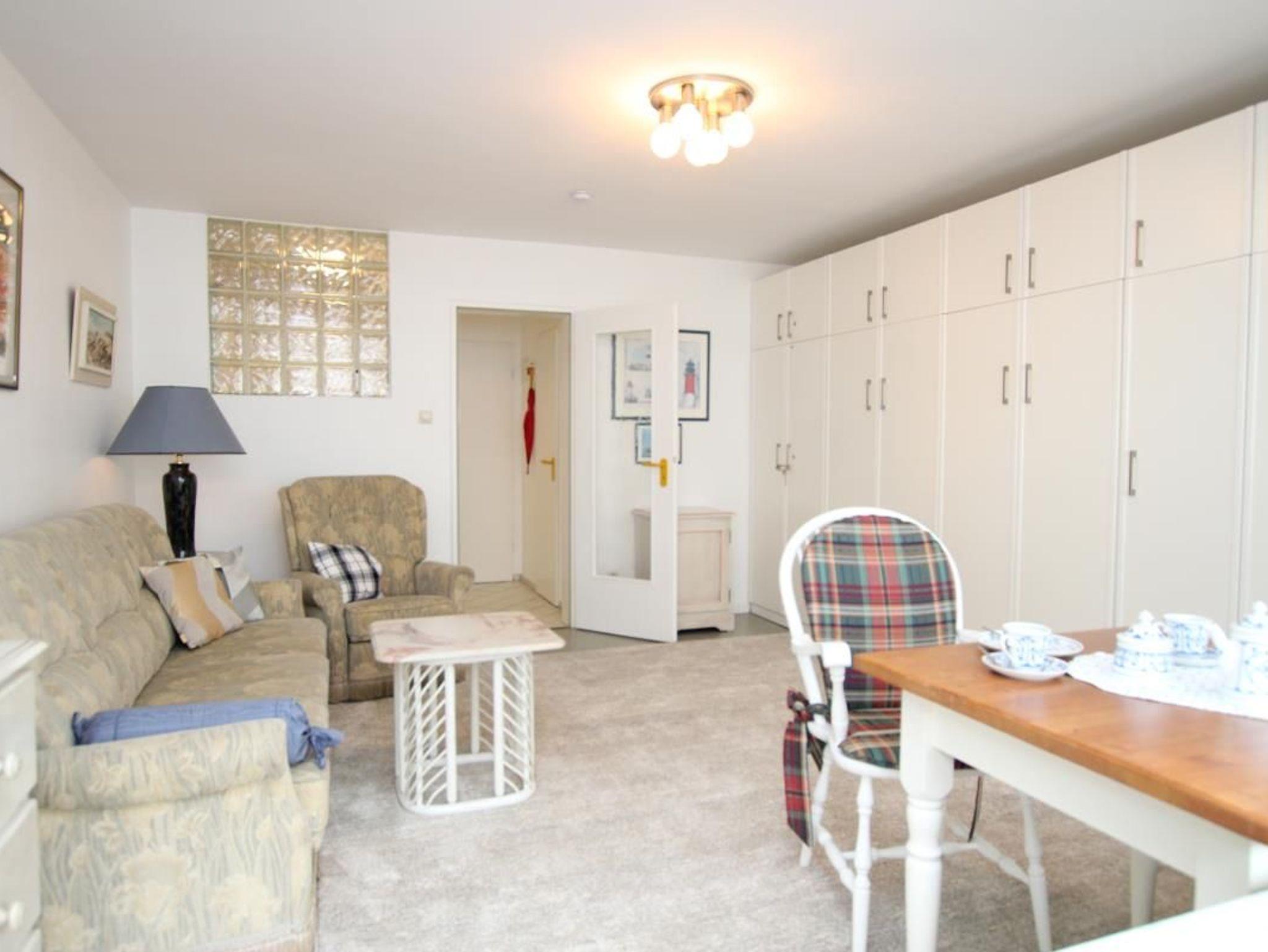 Im Wohnzimmer stehen eine Couchgarnitur und vor dem Fenster der Essplatz. In einer weißen Schrankwand sind zwei nebeneinander stehende einzeln aufklappbare Schrankbetten untergebracht. Die kleine Küche ist vom Wohnzimmer getrennt. Vom Balkon kann man seitlich das Meer hinter der Sylter Welle sehen. Das Bad hat eine Dusche. Das Appartement ist mit WLan und Telefon (ins deutsche Festnetz) ausgestattet.