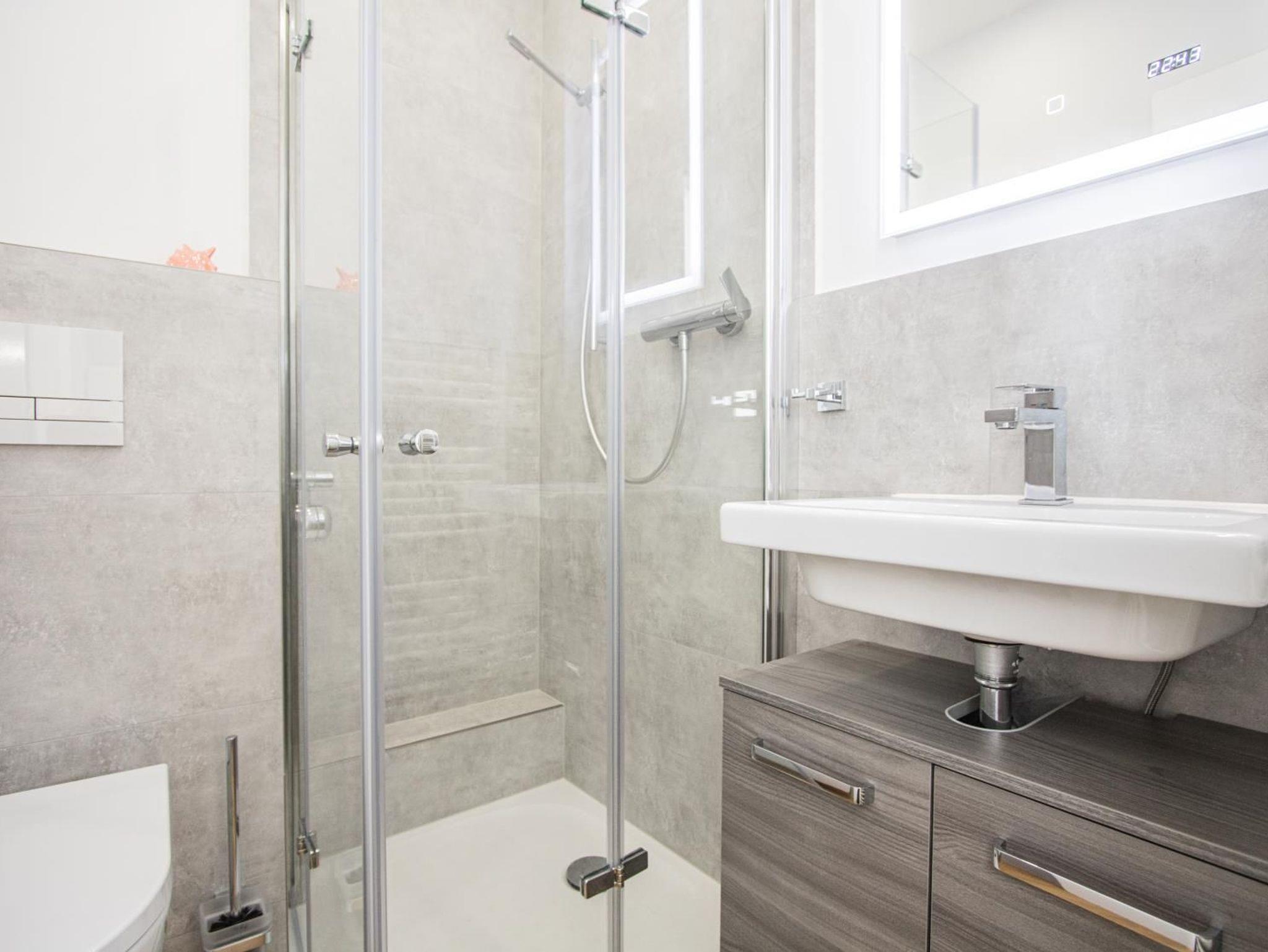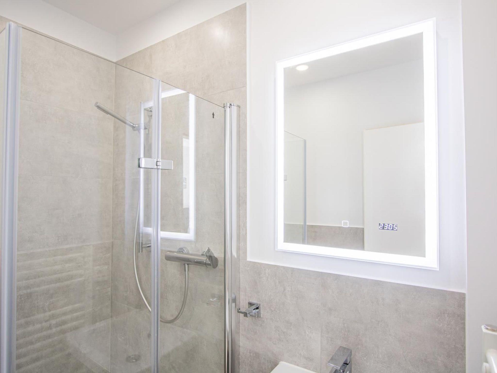 Das Wohnzimmer ist mit einem Sofa, einer Essecke mit 2 Stühlen und einem schönem Boxspringbett ausgestattet. Neben dem großen Spiegel der an dem Einbauschrank angebracht ist, befindet sich die kleine Pantryküche. Das moderne Badezimmer ist mit einem LED Badspiegel ausgestattet. Kostenloses W'Lan.