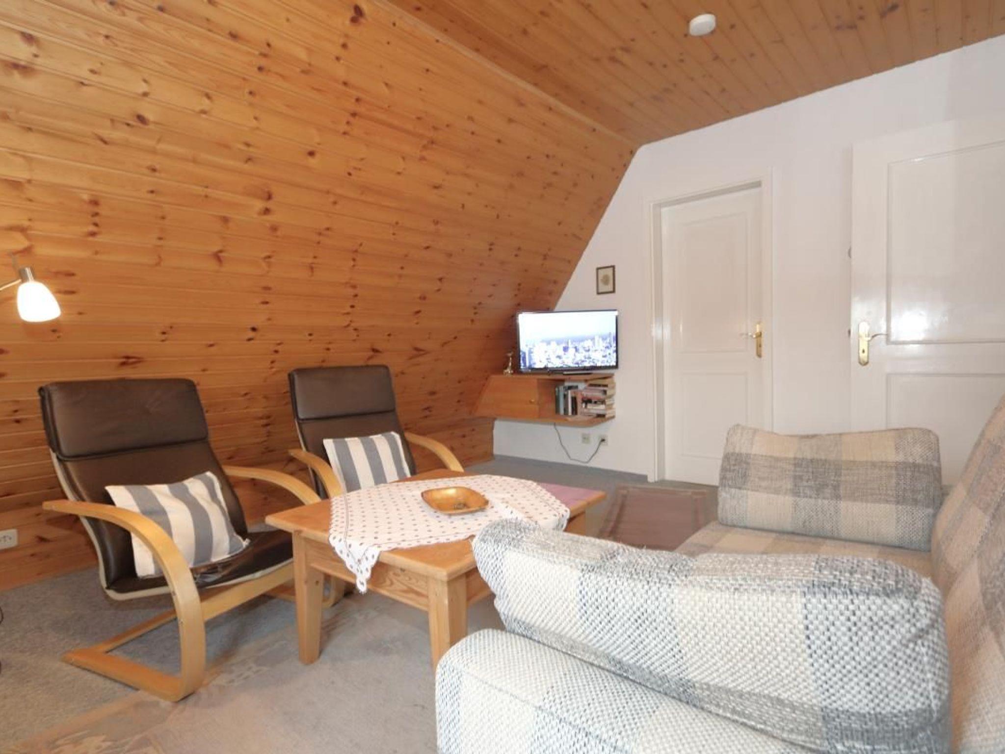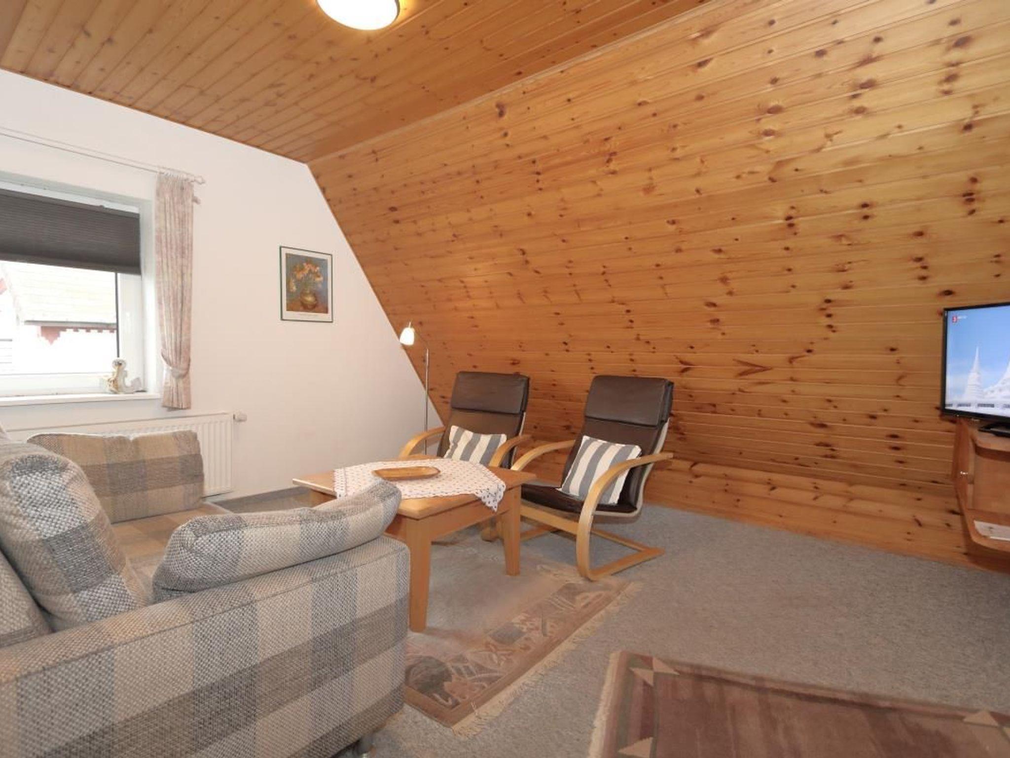 Das Appartement Fenja für bis zu 2 Personen liegt im Obergeschoß. Im Wohnbereich finden Sie eine Couchgarnitur mit Sessel und