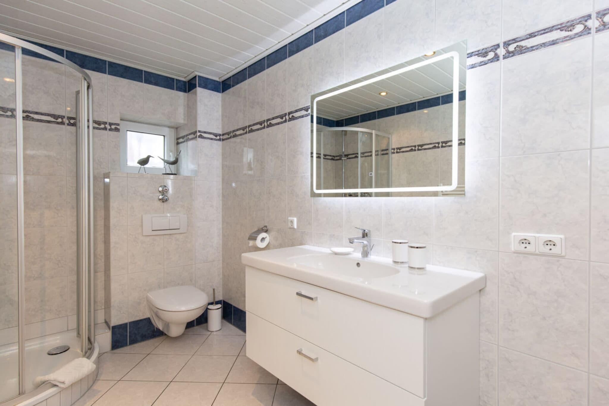 På 1. etage: (Køkken(mikrobølgeovn), stue / spisestue(, , , bibliotek, Fjernsyn, Fjernsyn, spisebord), badeværelse(, toilet, bruser, håndvask, varme)) , , , soveværelse(, , king size-seng), Internetadgang, telefon,