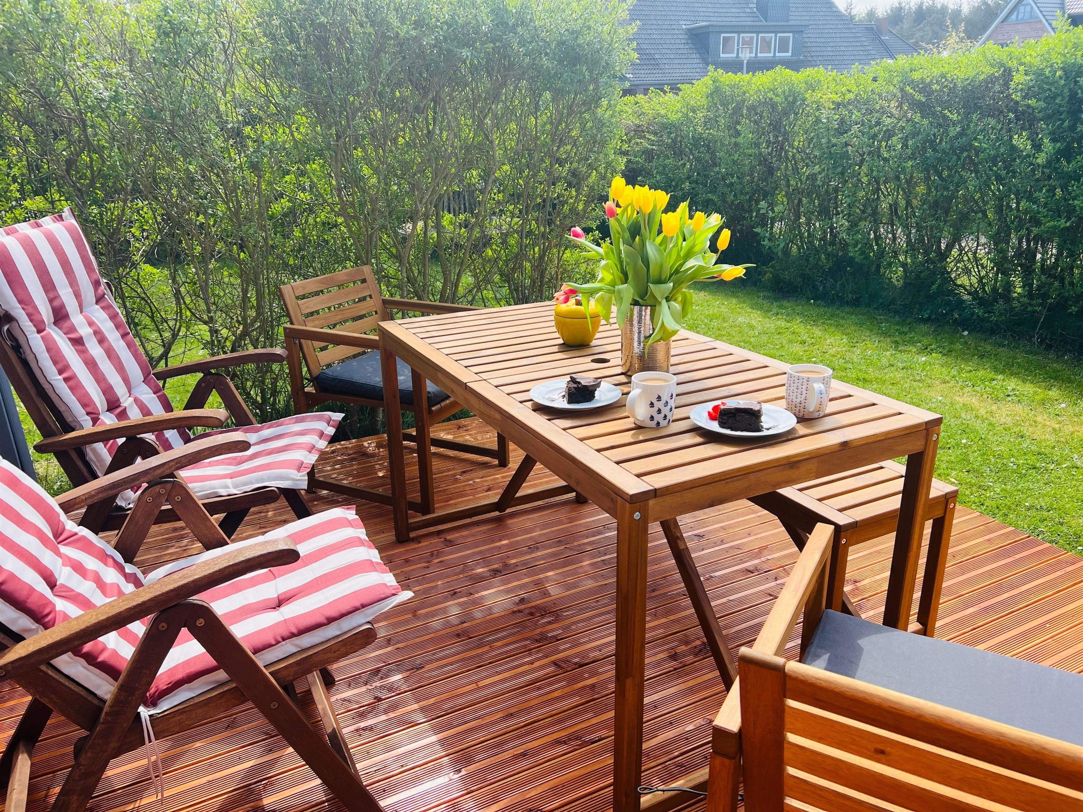 Die Gartenmöbel auf der Terrasse sowie der typisch blau weiße Sylt Strandkorb stehen von Mai bis Ende September zur Verfügung.