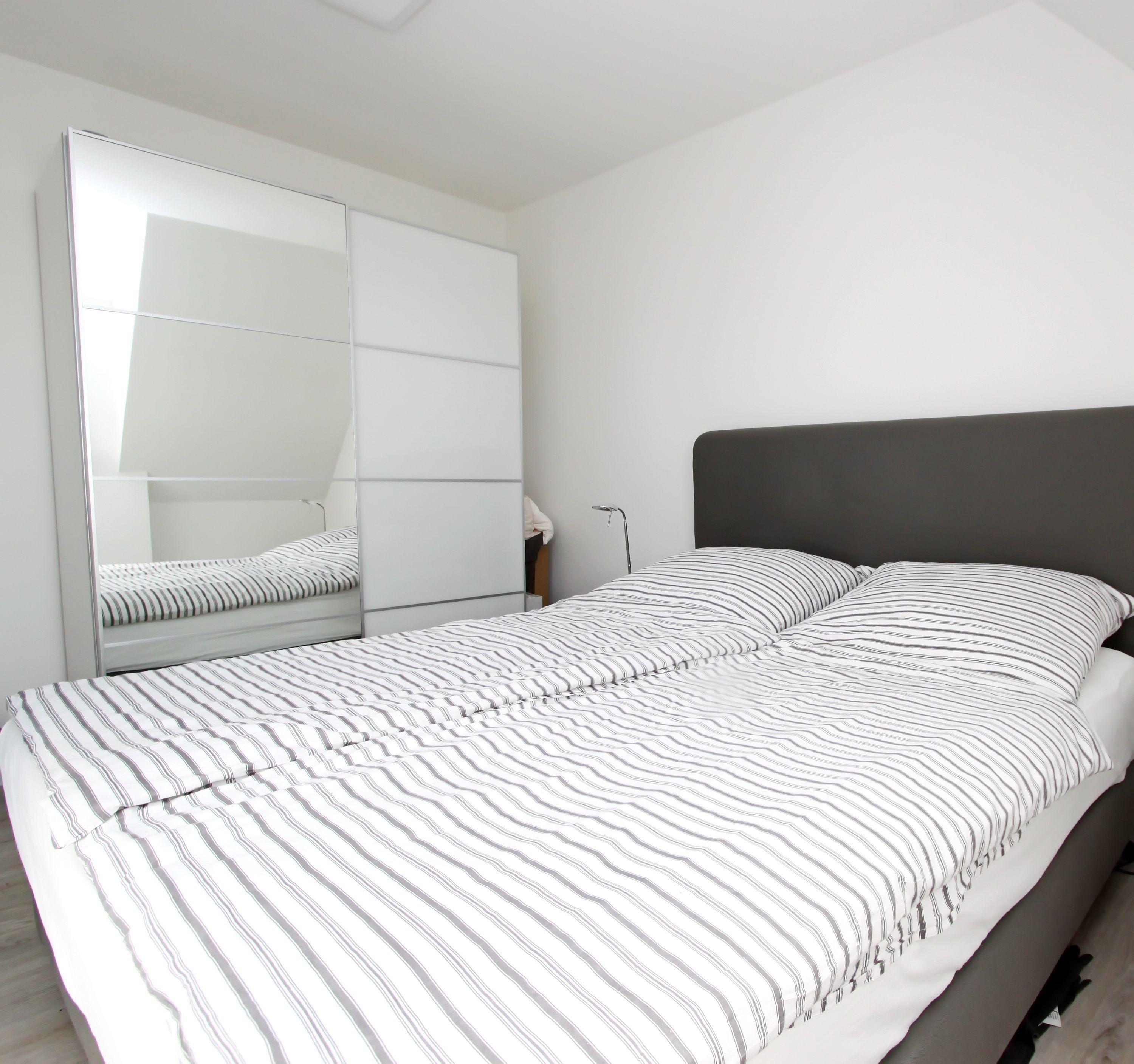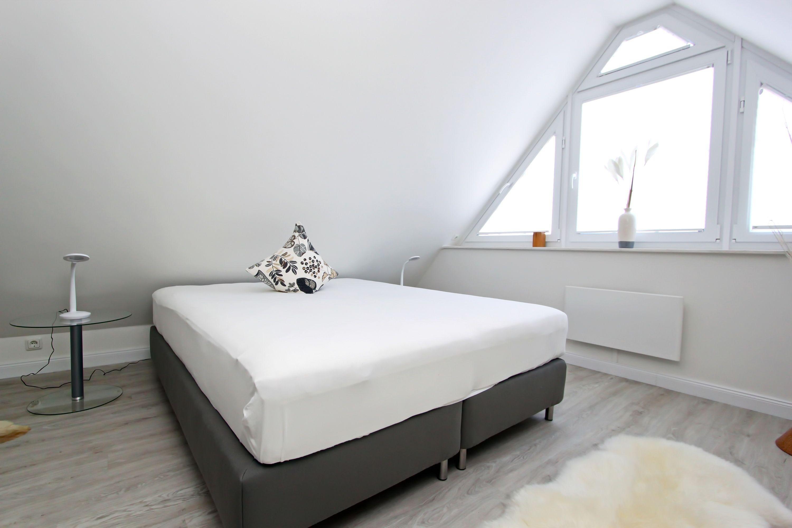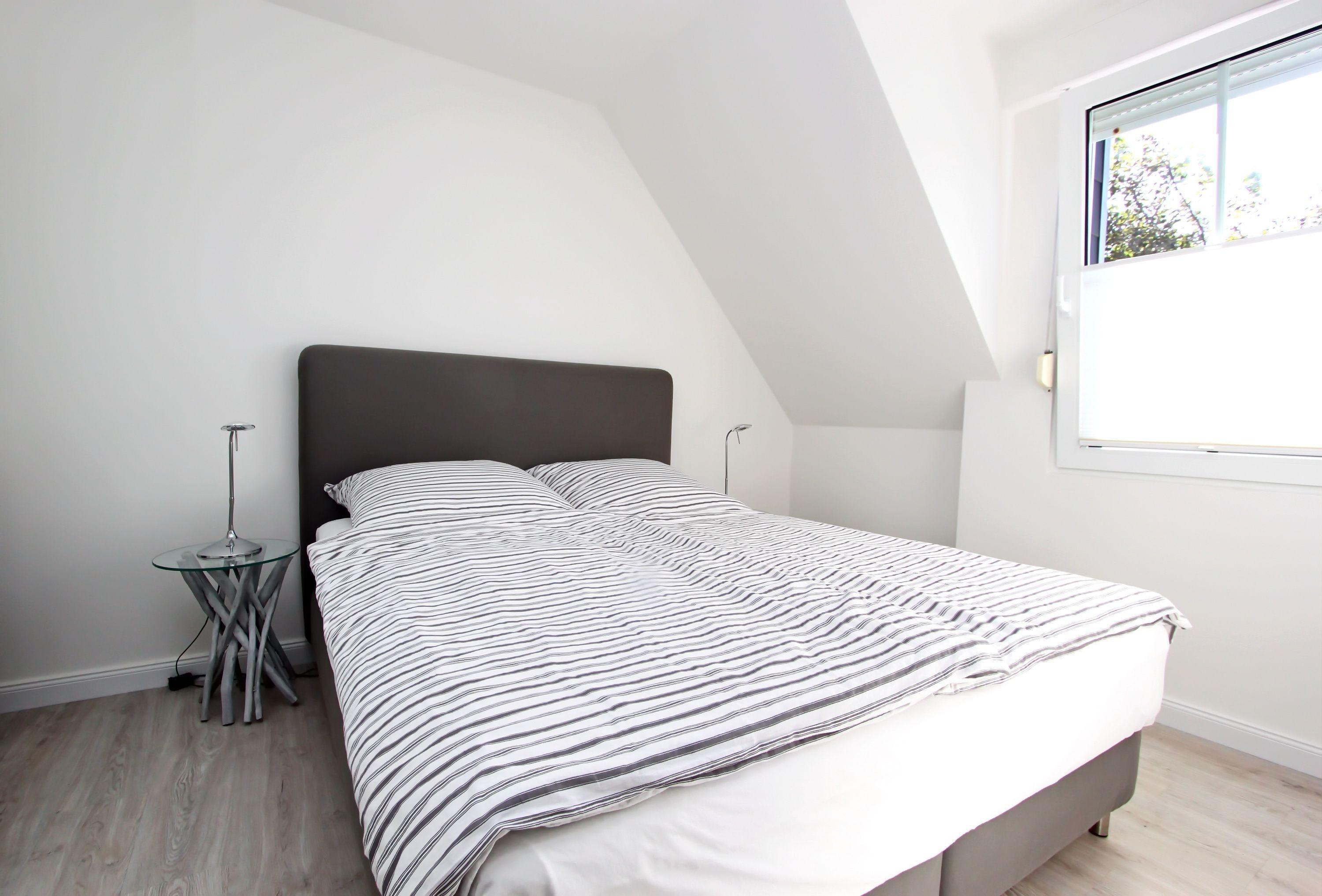 Die zweite Etage lässt sich über eine Treppe erreichen. Hier befindet sich das zweite Schlafzimmer der Unterkunft. Ebenfalls mit einem Boxspringbett und einem Fernseher möbliert, bleiben auch hier keine Wünsche offen.