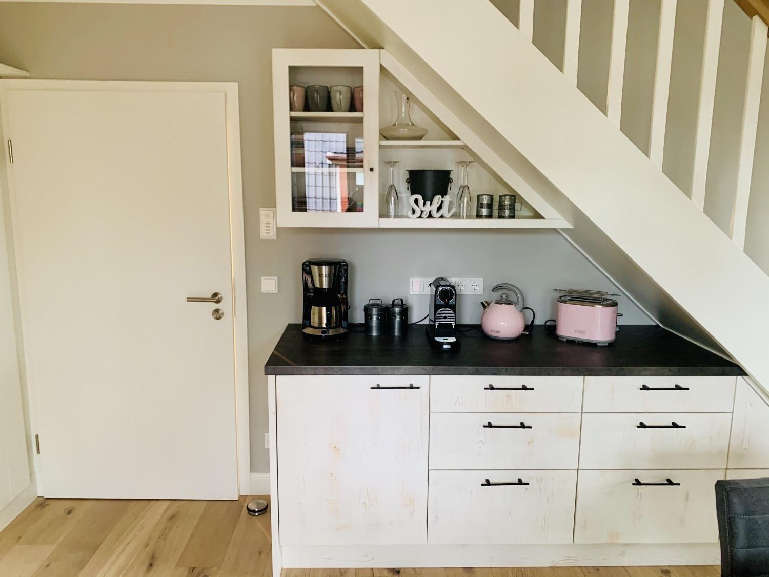 Die Küche ist schlicht gestaltet bietet aber dennoch alles was man braucht. Neben einem Kühl-/ Gefrierschrank bietet diese Küche eine Spülmaschine, ein großzügiges Waschbecken und weitere Küchengeräte für den täglichen Gebrauch.