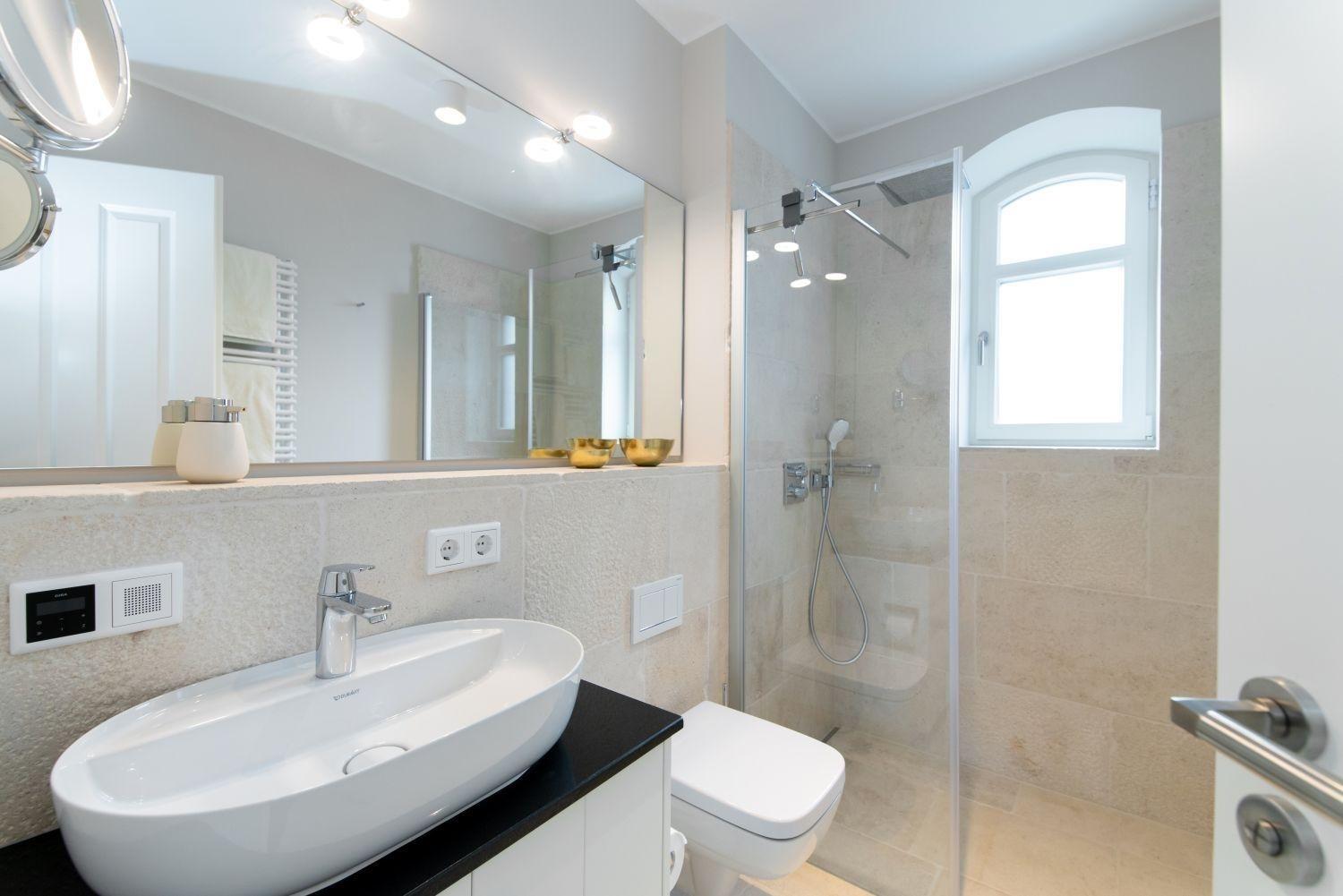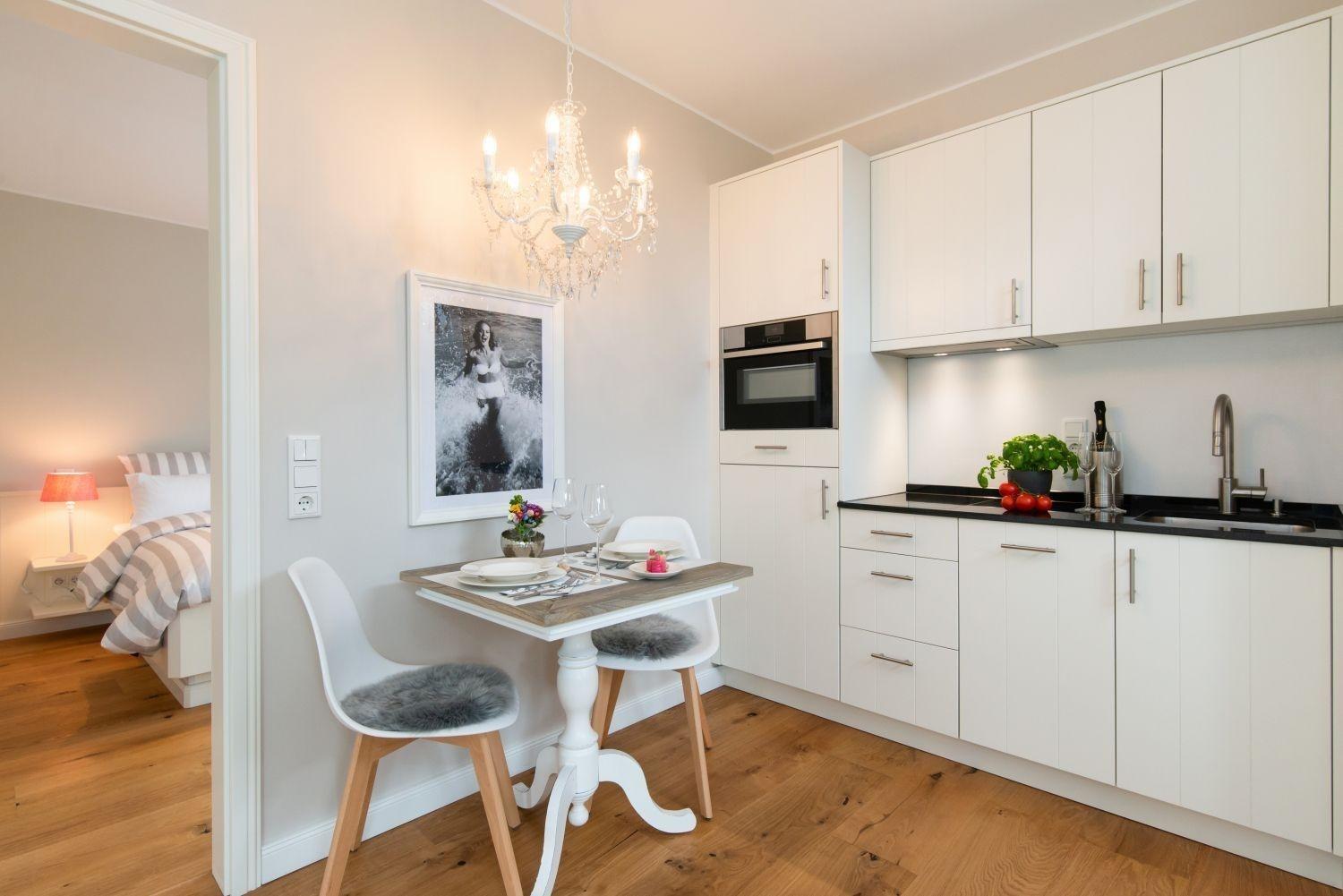 Die im nordischen Stil möblierten Wohnungen verfügen über massive Eichendielenböden, hochwertige tischlergearbeitete Küchen und Einbaumöbel sowie Bäder mit Yellow-Stone Fliesen. Eine Fußbodenheizung ist in allen Räumen vorhanden.