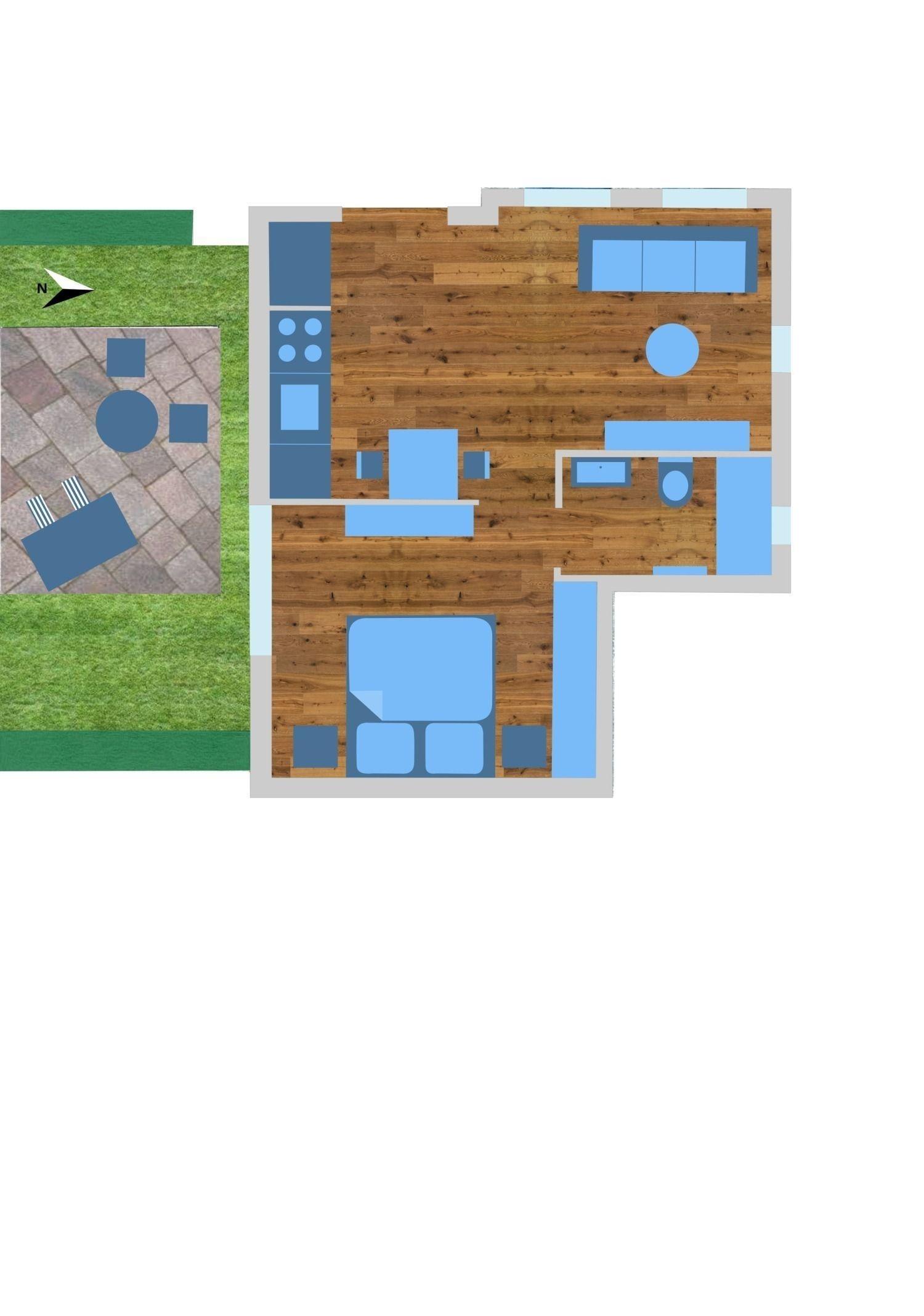 Die Wohnung „Küstendeern“ ist 38qm groß und verfügt über ein Wohnzimmer mit integrierter Küche, sowie über ein Schlafzimmer (mit Doppelbett 180x200) und ein Duschbad. Die nach Südwesten ausgerichtete 7,5qm große Terrasse befindet sich in einem 23 qm großem Gärtchen.