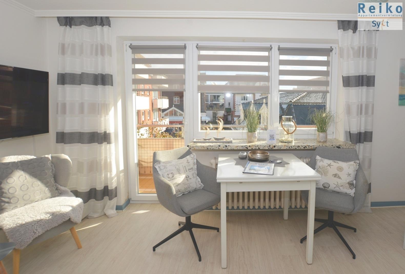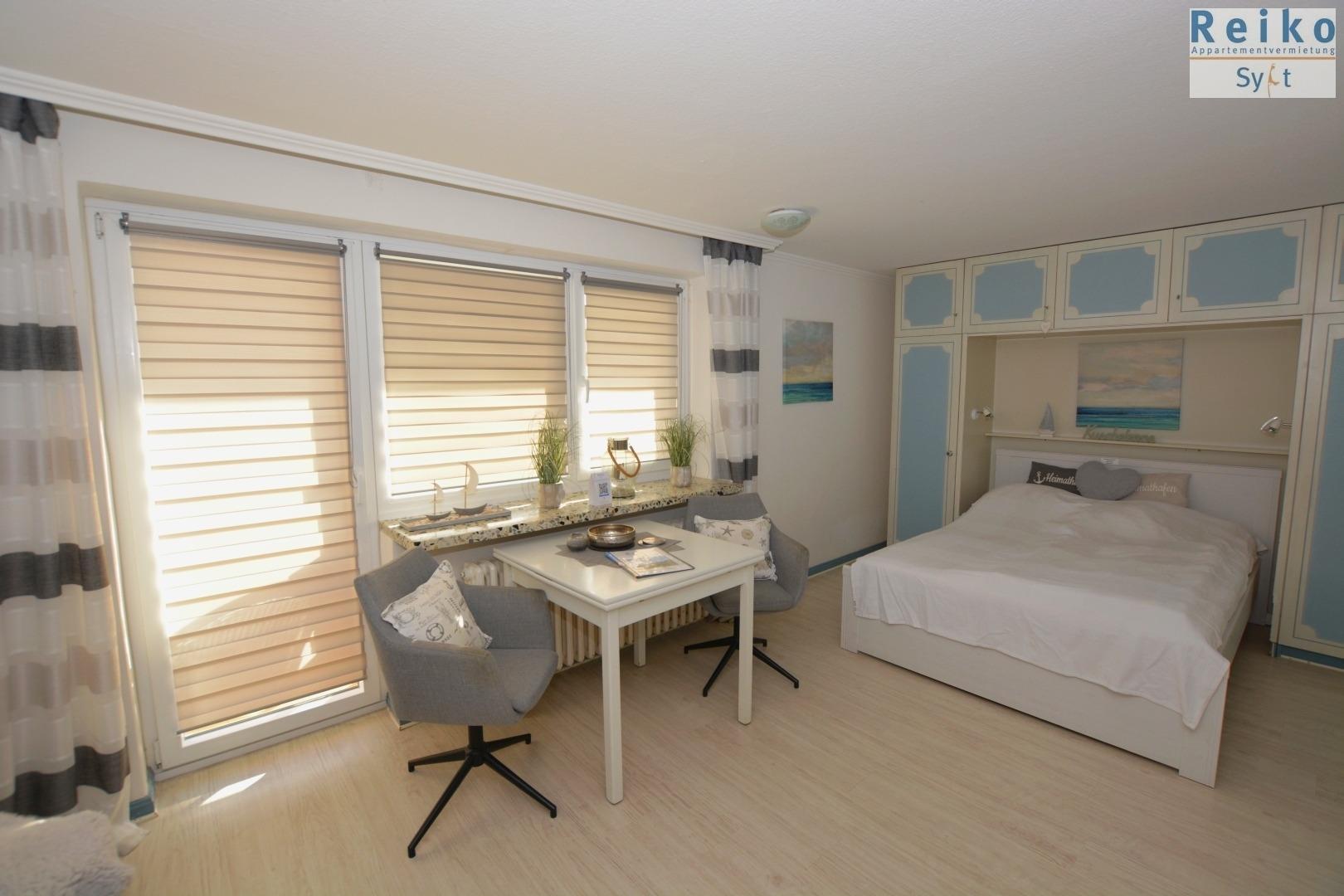 Geschmackvolles, helles 1-Raum-Nichtraucherappartement, ca. 29 qm, 1. OG., mit großem Ostbalkon in erster Straßenreihe am Meer.