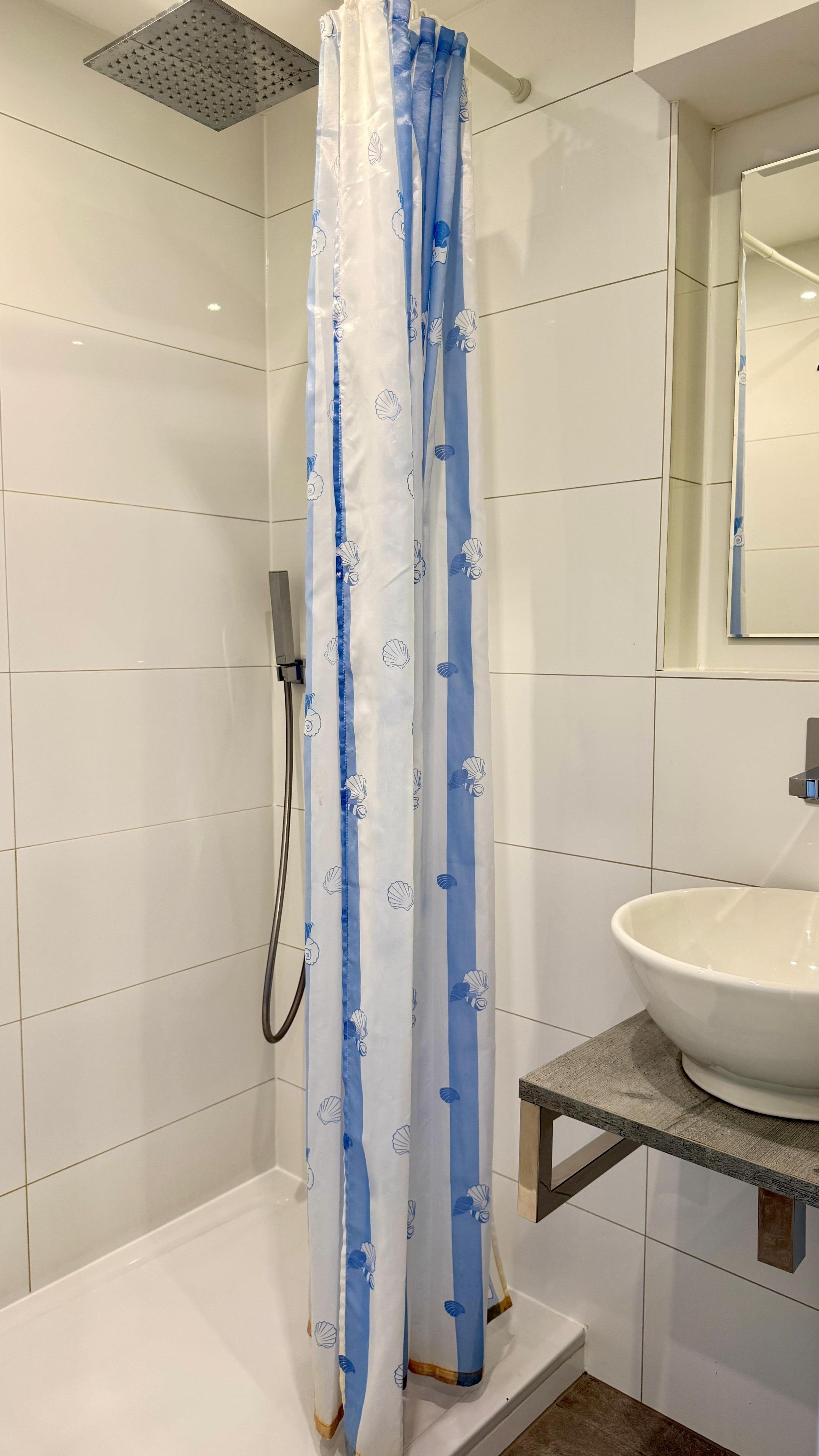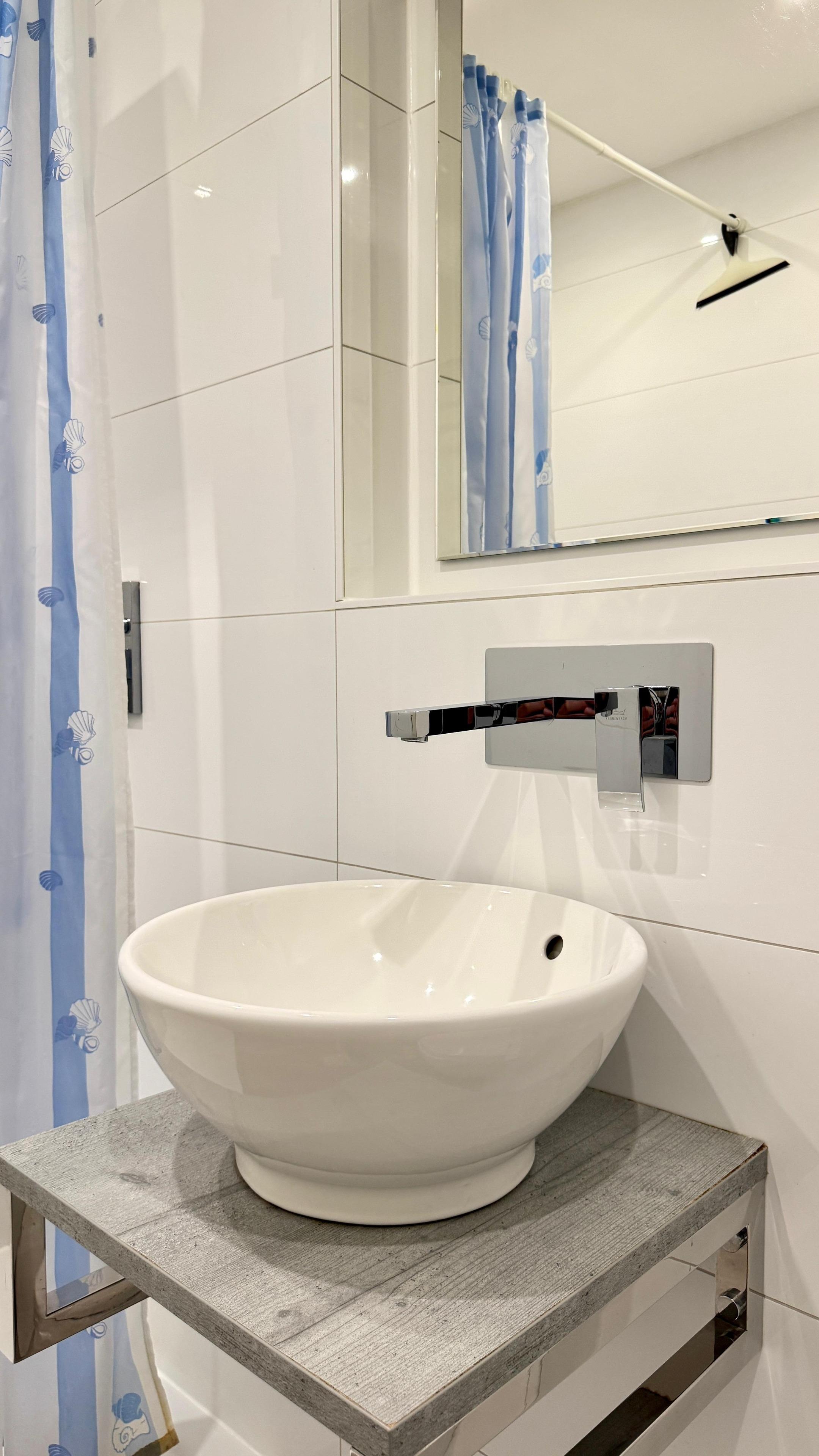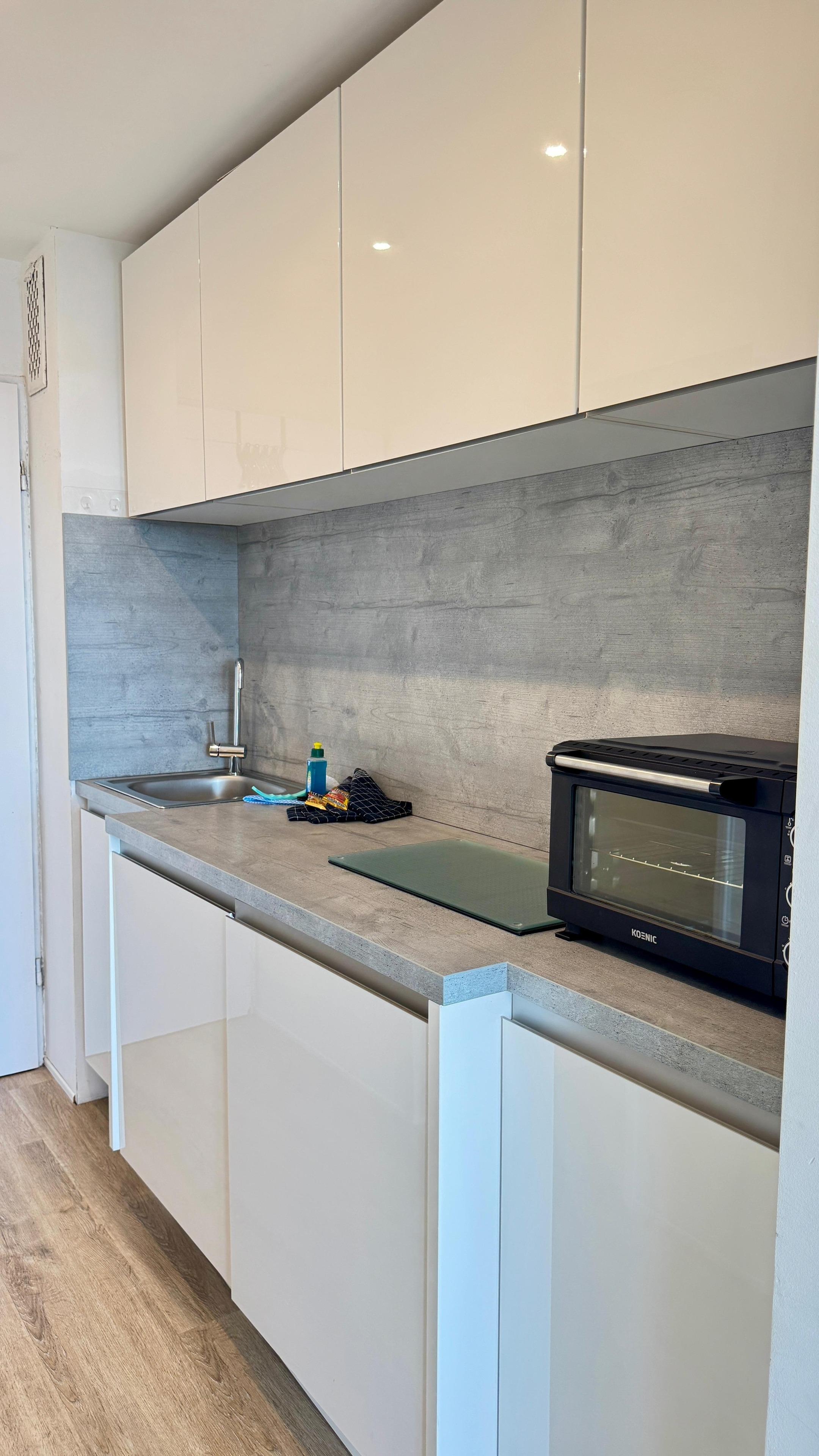 Der Ost-Balkon bietet einen herrlichen Blick über die Stadt und darüber hinaus. Im Flurbereich befindet sich eine helle Einbauküche mit einem Ceran Kochfeld und Kühlschrank. Das moderne Duschbad ist weiß gefliest. Die Dusche verfügt über einen Flacheinstieg und eine Regenwaldbrause, Handtuchheizung und Ablageflächen sind ebenfalls vorhanden. Es wurde ein hochwertiger Vinyl-Boden im Wohn- und Flurbereich verlegt. Neben einem Kleiderschrank, einer kleinen Kommode, einem Flachbild-TV (hängend) finden Sie im Wohnbereich eine Schlafcouch mit einer Breite von 160 cm. Diese sehr hochwertige Schlafcouch wird zum Bett, wie mit einem Lattenrost und Matratze, sehr einfach in der Handhabung und wirklich bequem.