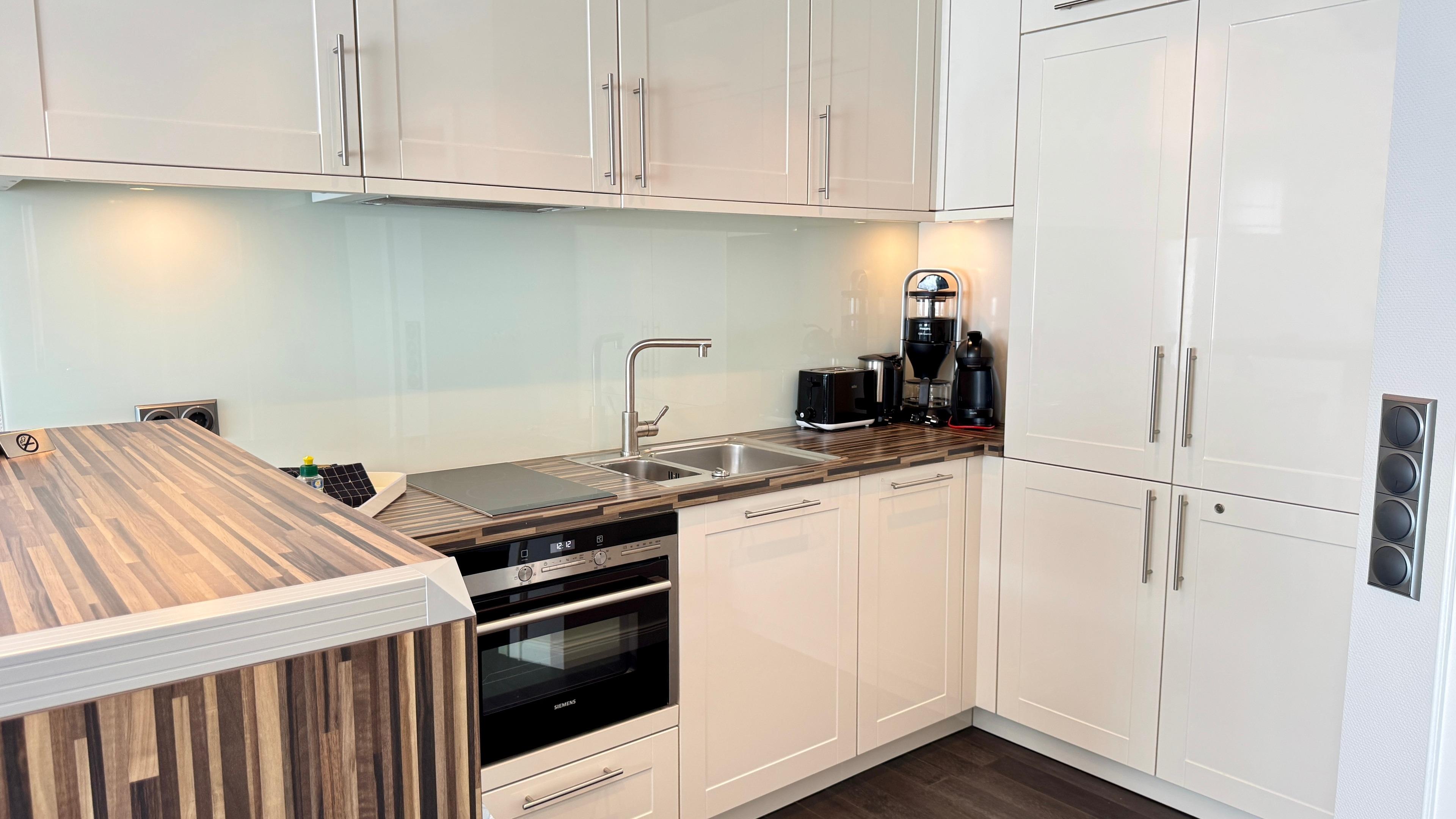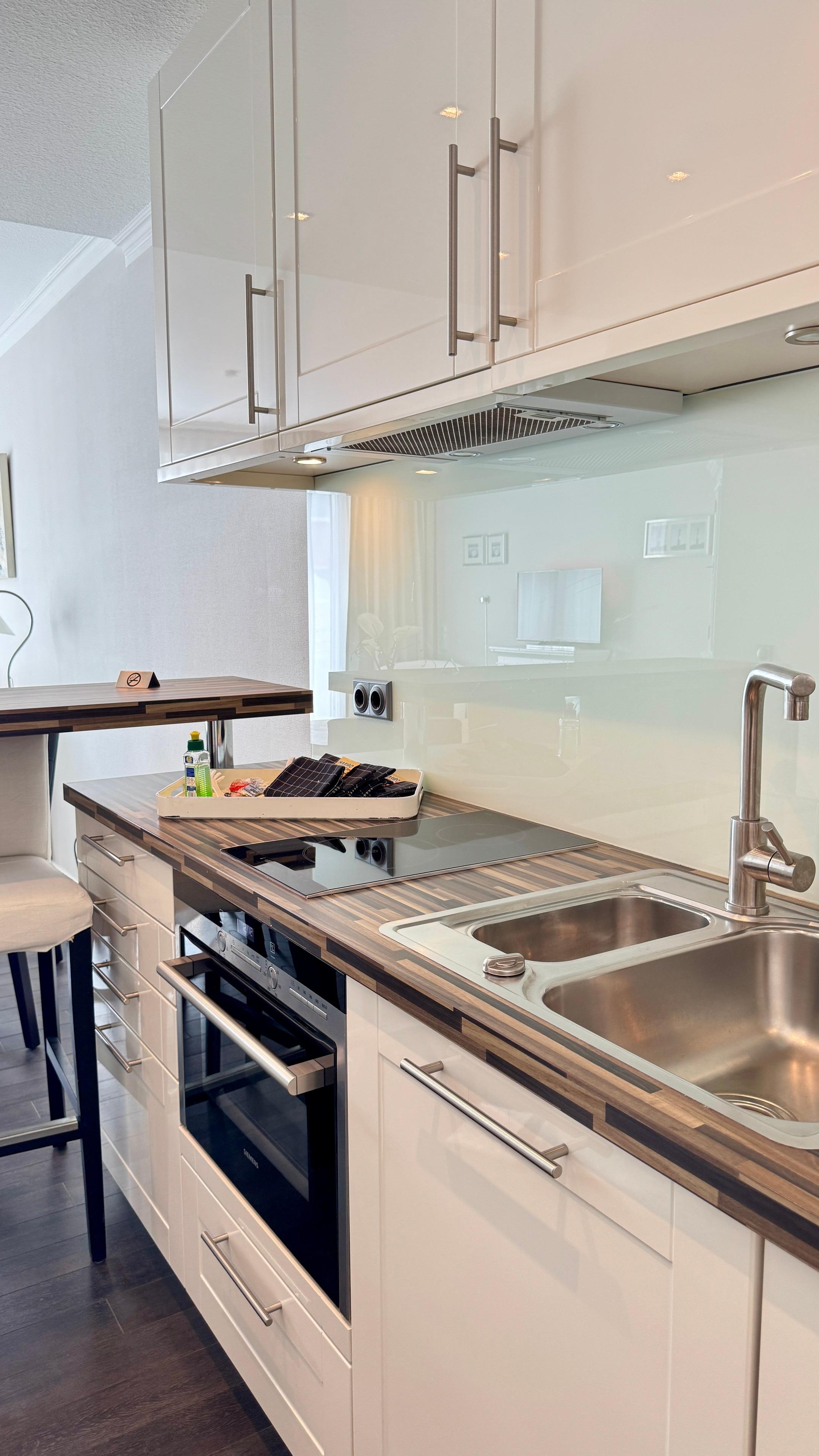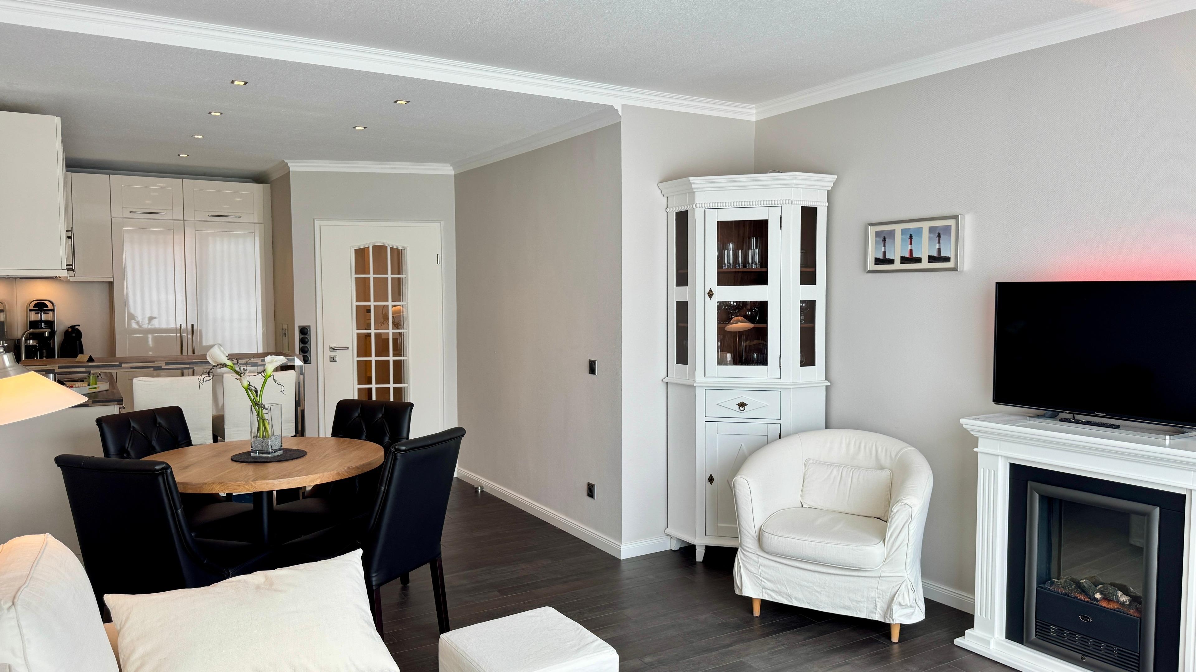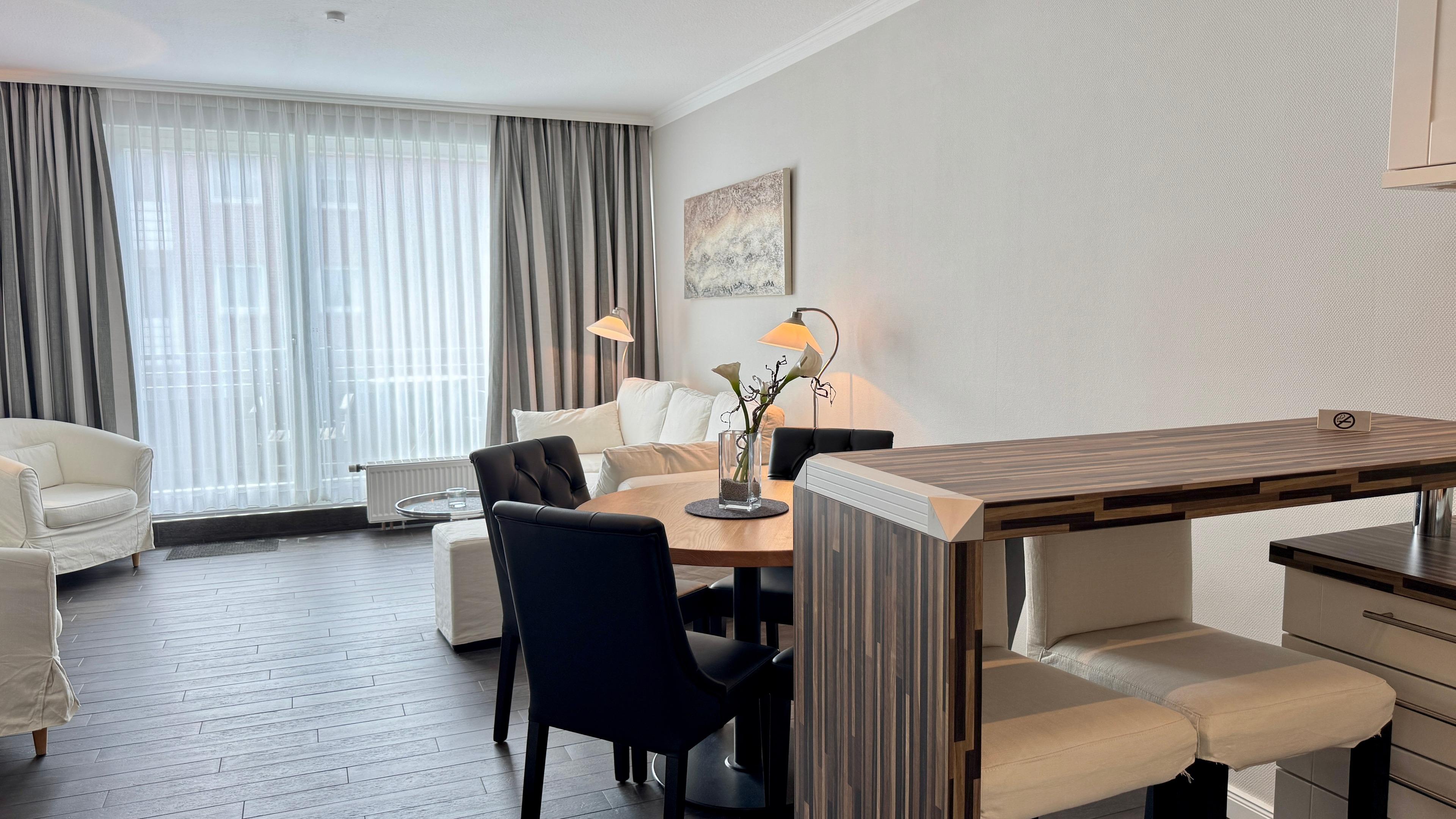 Das Appartement für maximal zwei Personen verfügt über ein großzügiges Wohnzimmer mit Essecke. Die offene Wohnküche ist durch einen verschiebbaren Frühstückstresen optisch abgeteilt. Neben einem modernen Touch-Control-Induktions-Kochfeld und einem kompakten Kombibackofen gehört ein superleiser Geschirrspüler zu ihrer Grundausstattung. Sowohl im Wohnzimmer, in dem ein Elektrokamin in der stürmischen Jahreszeit für Wohlbehagen sorgt, als auch im Schlafzimmer befindet sich jeweils ein LCD-Fernseher. Internet ist via WLAN (ohne Gewähr) vorhanden. Das Doppelbett entspricht ebenso der gängigen Comforthöhe wie die Toilette im Bad. Die großzügige Vollglasdusche ist dort der optische Blickfang, das Touch-Control-Wandradio einer der vielfältigen technischen Raffinessen im Appartement. Probieren Sie es aus - Sie werden sich verlieben.