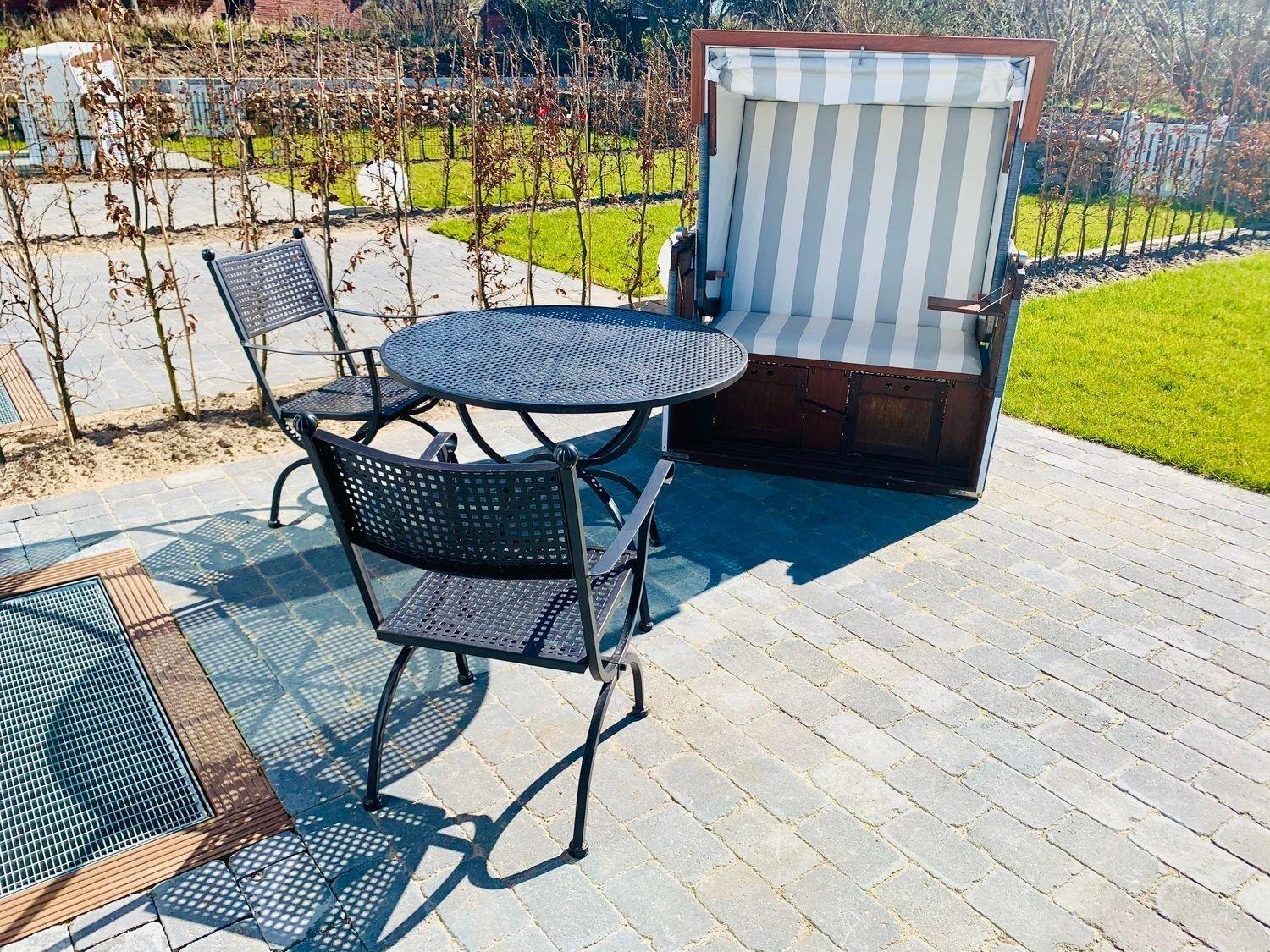 Vom Wohnbereich aus erreichen Sie die Südterrasse mit großem Garten, Gartenmöbeln und Strandkorb (April-Oktober).