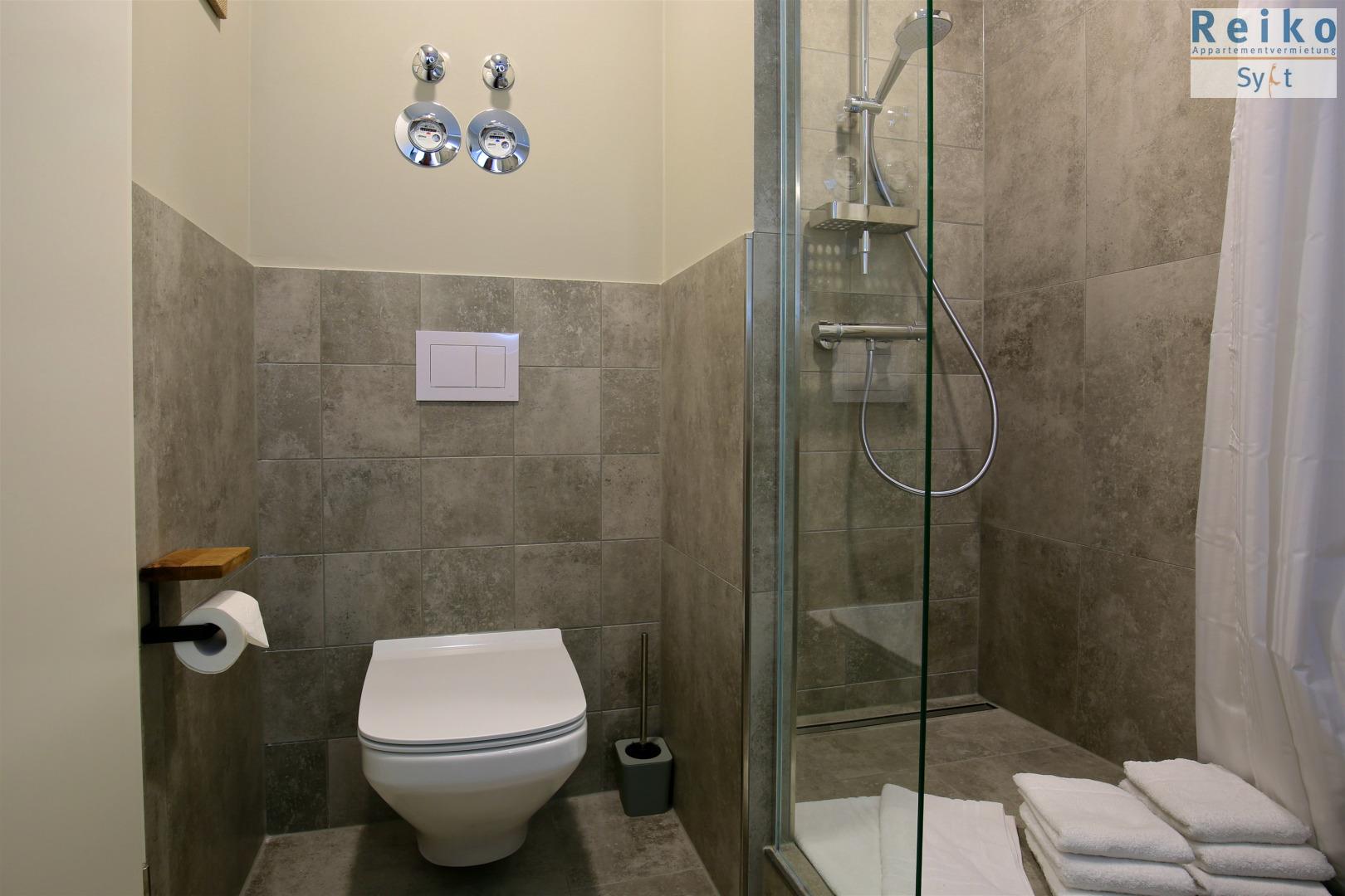 Im Wohn/Schlafraum befindet sich eine Sofa-Schlafkombination mit einzeln ausklappbaren Betten mit je 80x200 cm großen Matratzen sowie ein angeschlossener Essbreich mit zwei bequemen Sesseln am Fenster mit Nordseeblick. Ein Interentanschluss mit WLAN (ohne Gewähr) steht Ihnen zur Verfügung und ein 48 Zoll Flachbild-TV rundet das Bild ab. Die offene Wohnküche ist optisch durch einen Tresen vom Wohnbereich abgetrennt und sehr gut ausgestattet mit einer Mikrowelle, Geschirrspüler und einem 2-Platten-Cerankochfeld. Das Duschbad ist eine Kombination aus Holzelementen, grauen Fliesen und weißen Sanitärobjekten und sorgen für eine moderne Atmosphäre.
