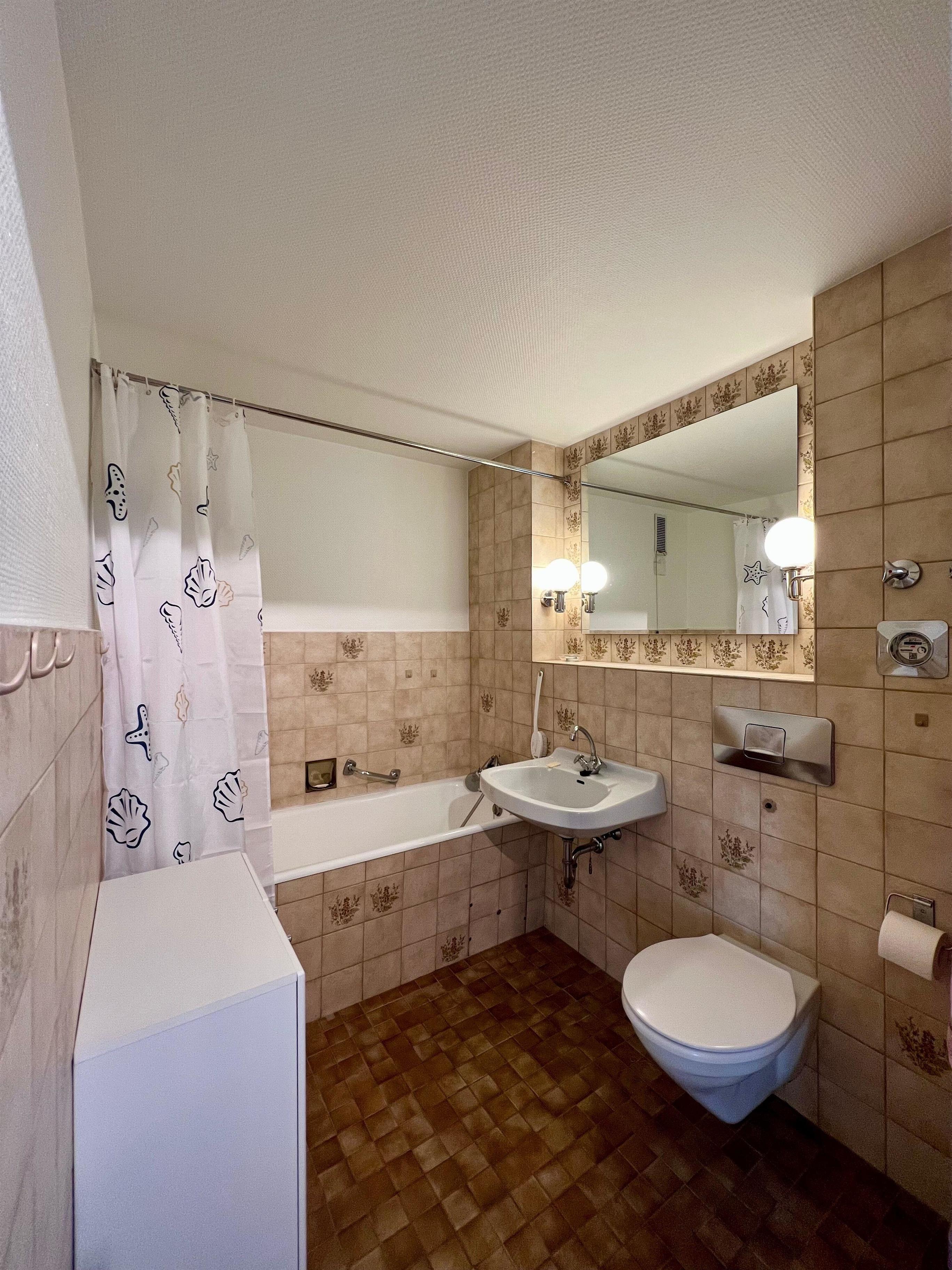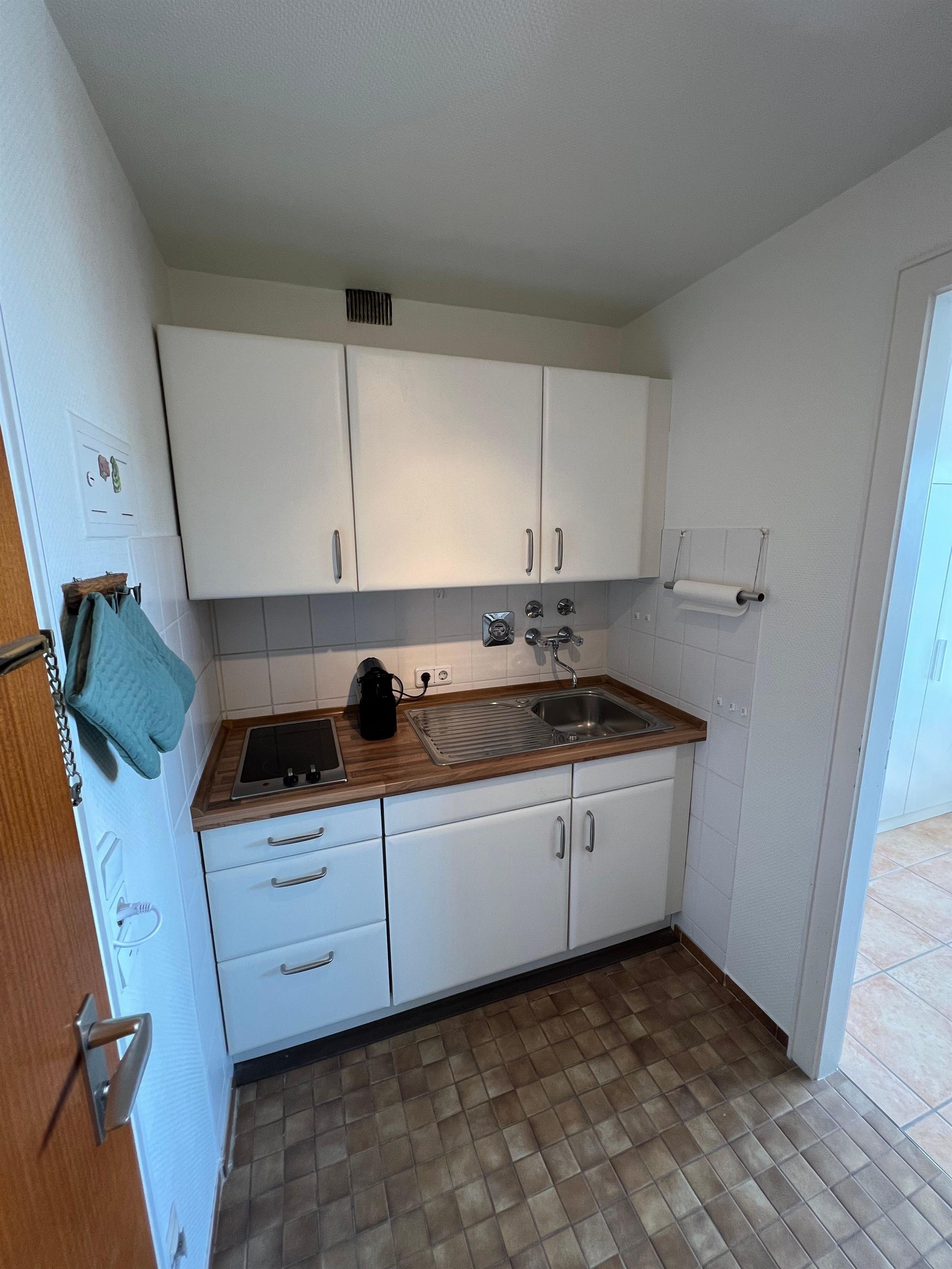 Die Küchenzeile im Flur hat ein neues Ceranfeld mit 2 Platten. Ebenfalls ist eine Nespresso Maschine, Toaster und ein Wasserkocher vorhanden. Im Badezimmer gibt es eine Dusch-Badewanne, einen Handtuchhalter sowie ein Badezimmerschrank mit Stauraum.