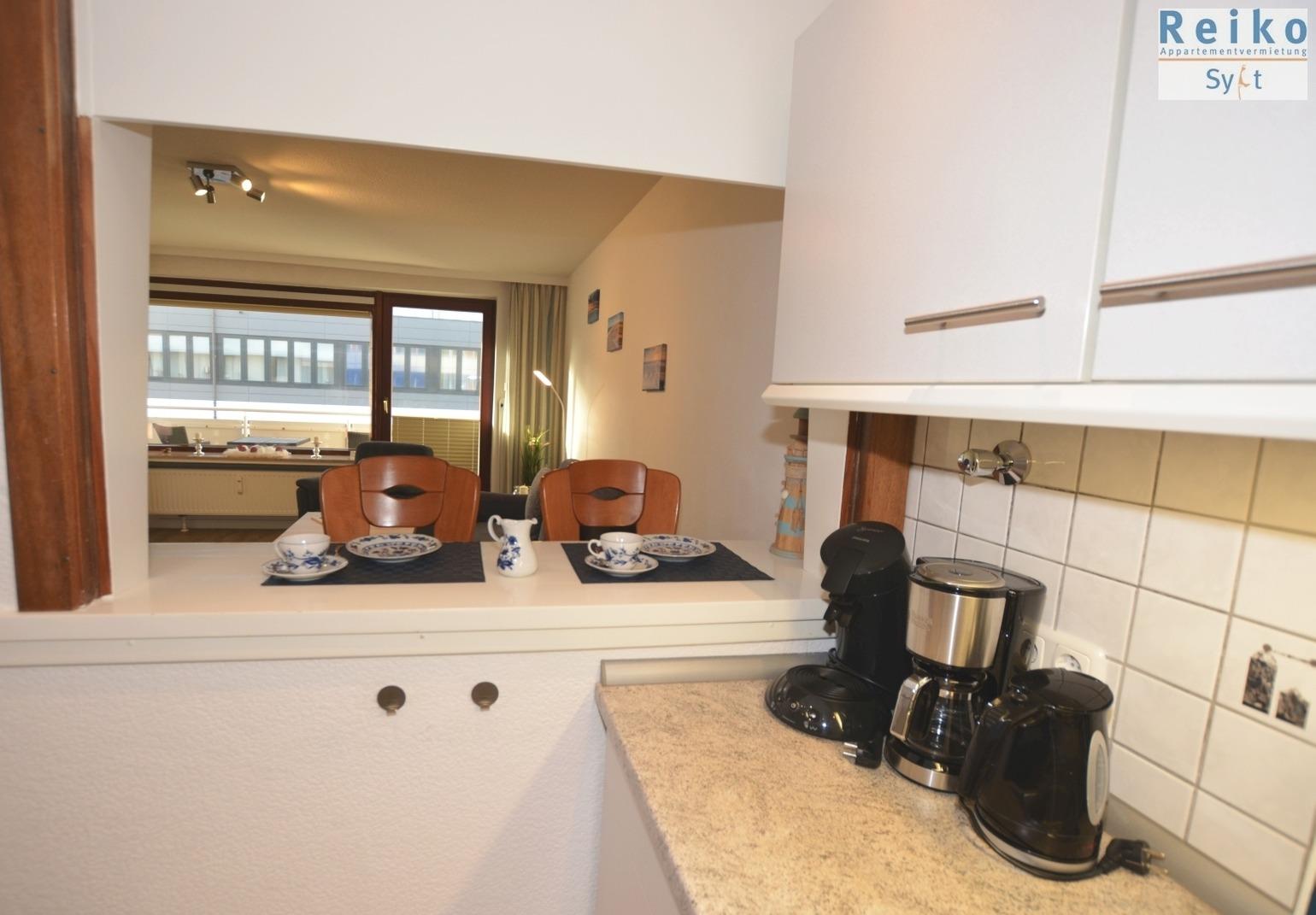 Die Küchenzeile verfügt über ein 2er-Ceran-Kochfeld, Kaffeemaschine, Wasser- und Eierkocher, Toaster, Bügelbrett und Bügeleisen