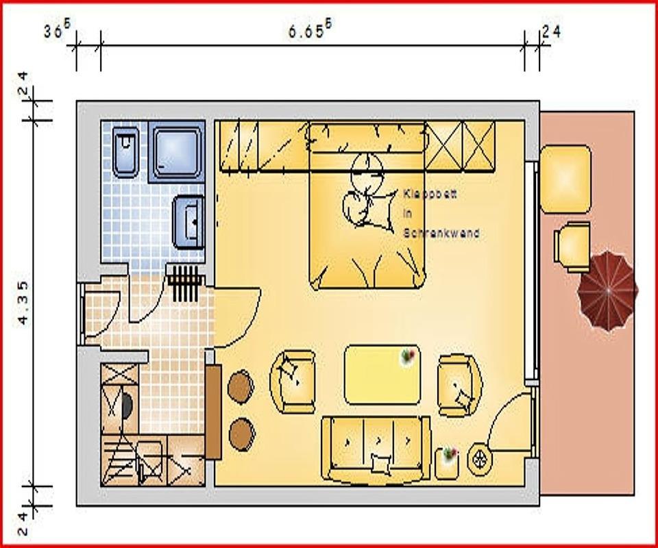 Das gemütlich ausgestattete Appartement im 1. Geschoss ist ca. 34 m² und bietet Platz für 2 Personen. Das Wohnzimmer ist mit TV, Blu-Ray-Player und Radiowecker ausgestattet, TV-Empfang erfolgt via Magenta-TV. Hier befindet sich auch das Kompfort-Schrankbett für 2 Personen. Vom Wohnzimmer aus erreichen Sie den sonnigen Balkon, die Küche und das moderne Bad mit Walk-In Dusche.