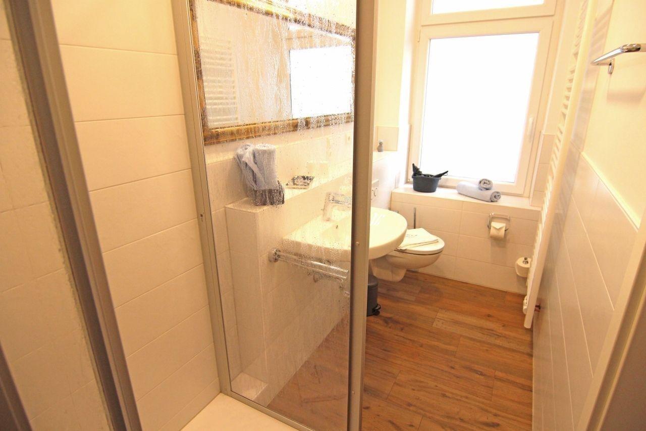 Das Duschbad verfügt über ein Fenster und Fön.