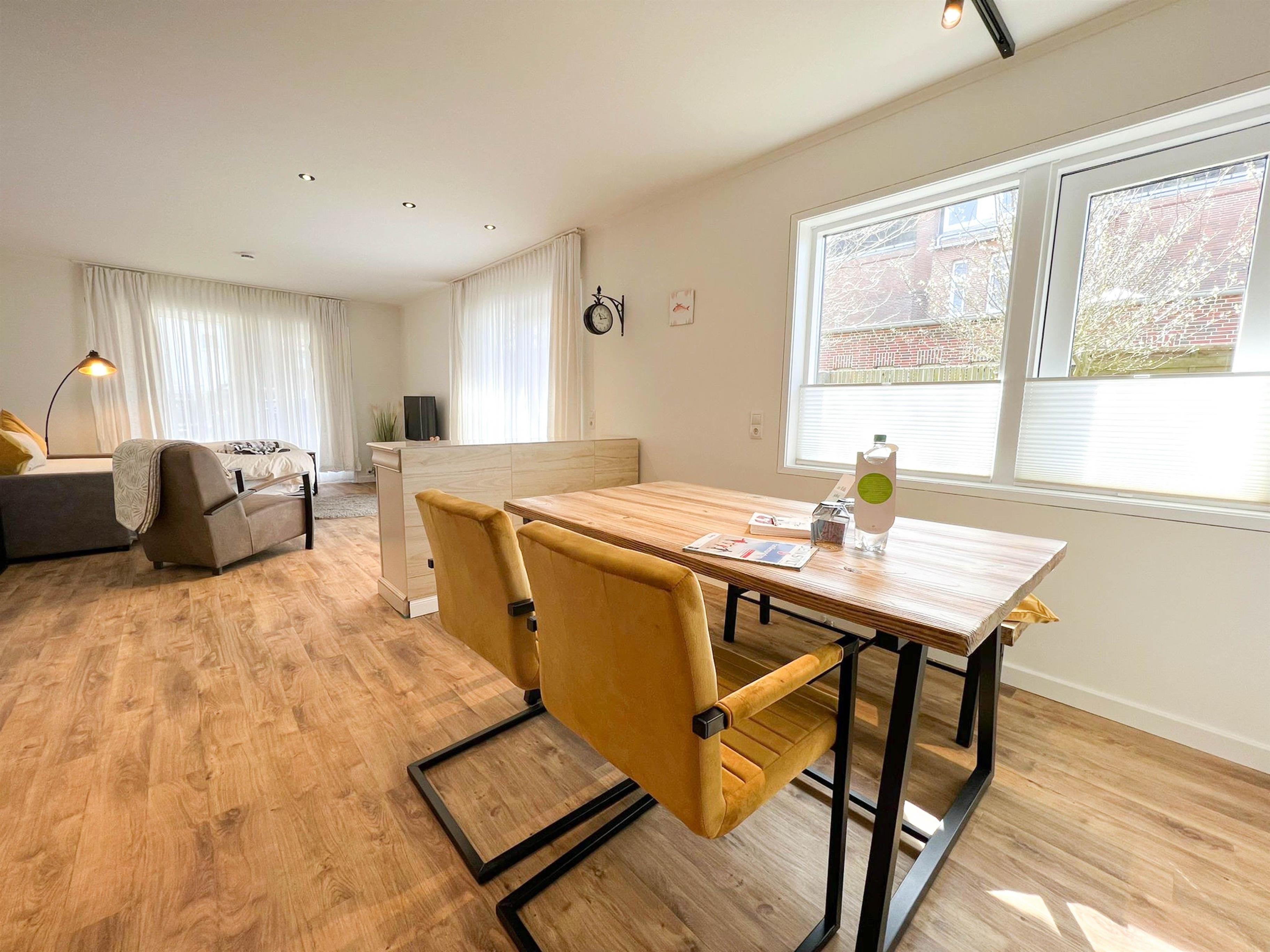 Ein großer Esstisch mit 4 Stühlen ist vorhanden.
