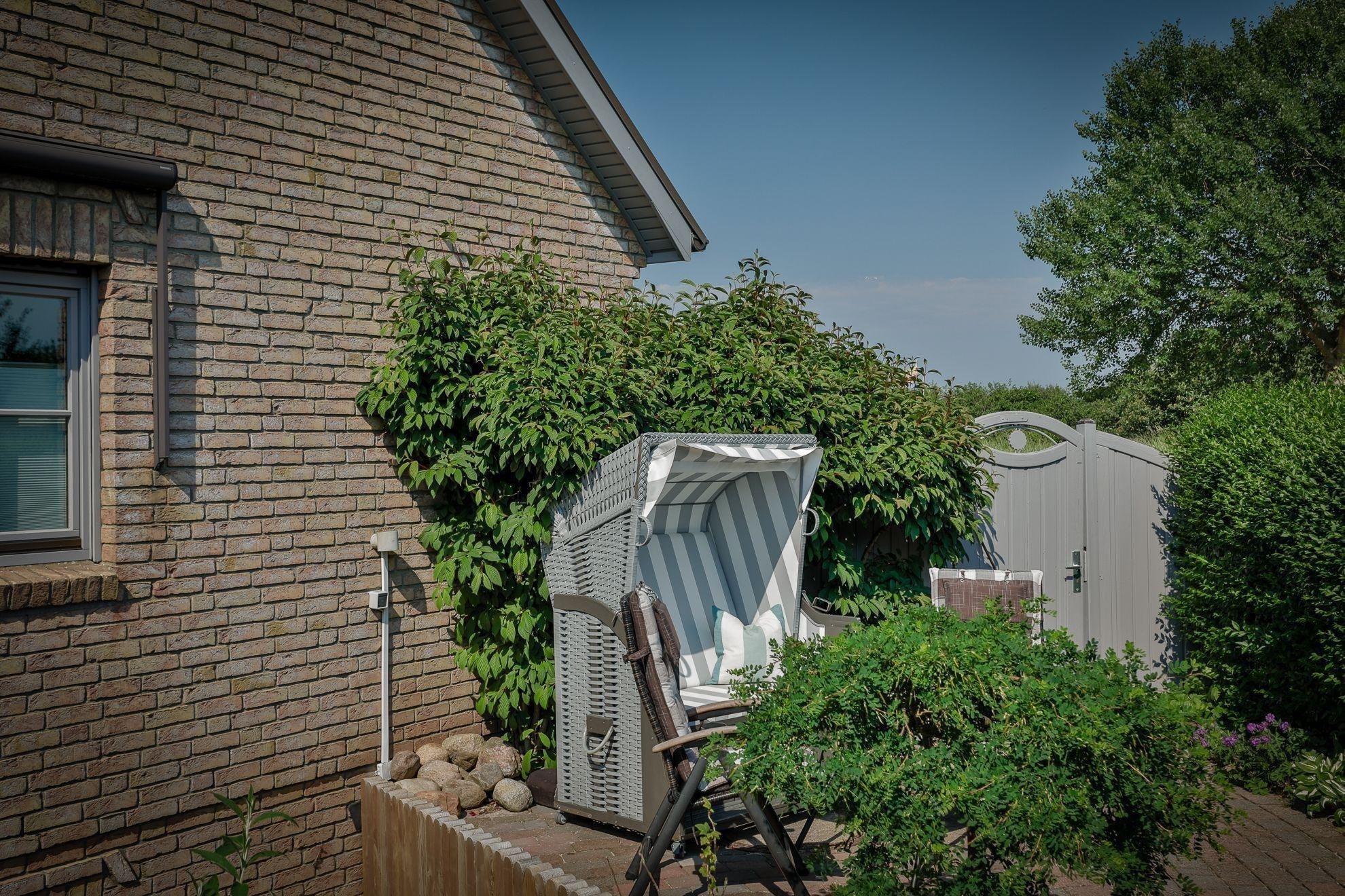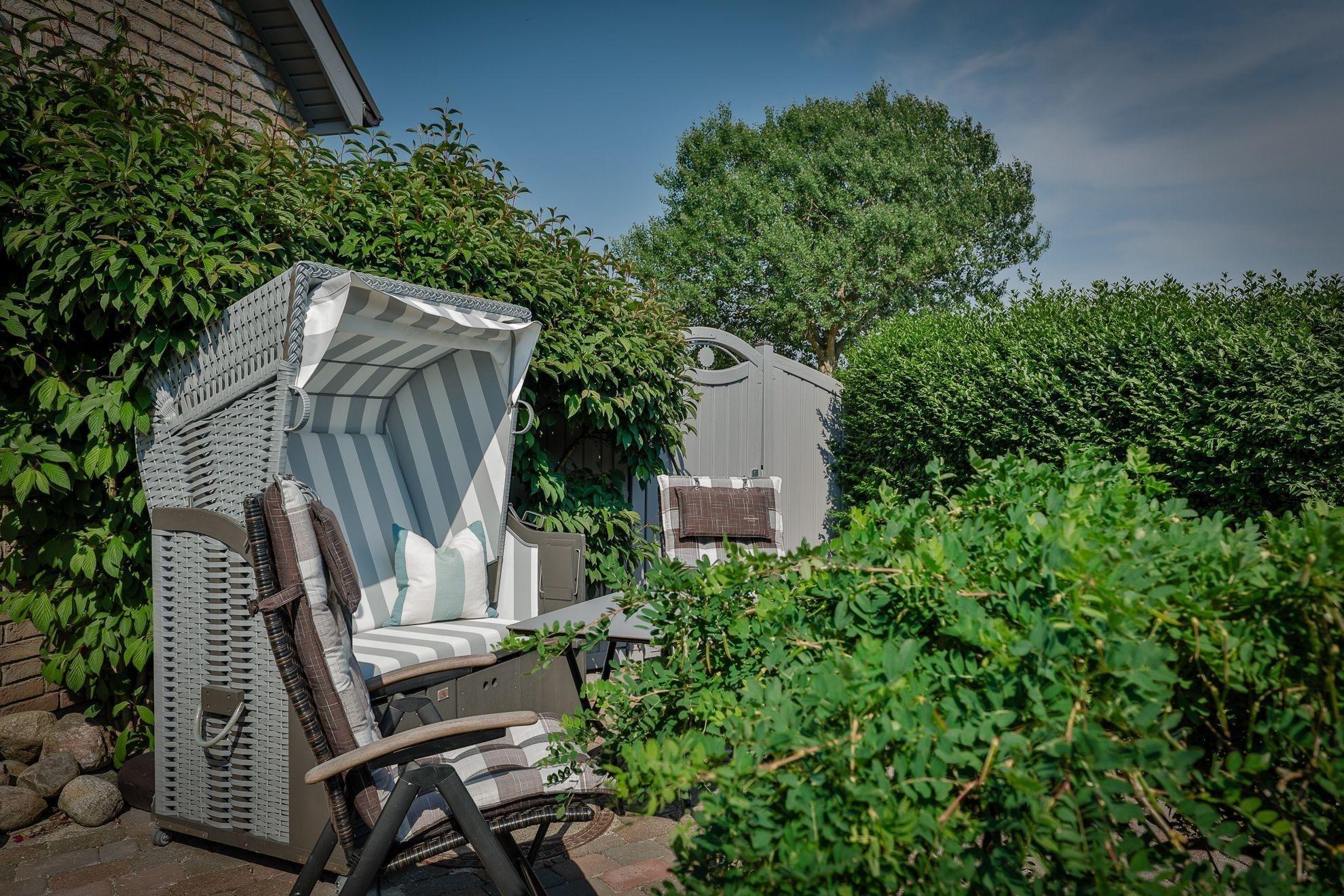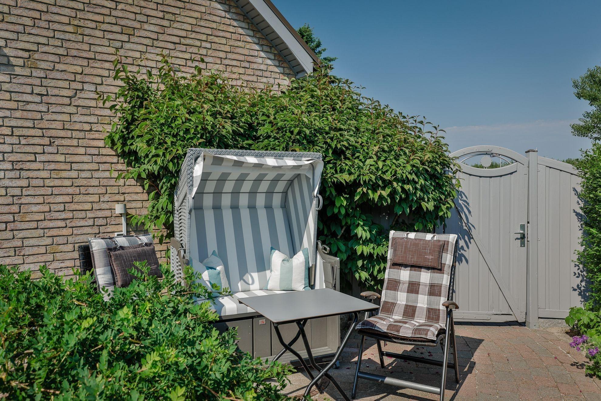 Eine sonnige Südterrasse mit Strandkorb und Gartenmöbeln lädt zum Erholen und Entspannen ein.