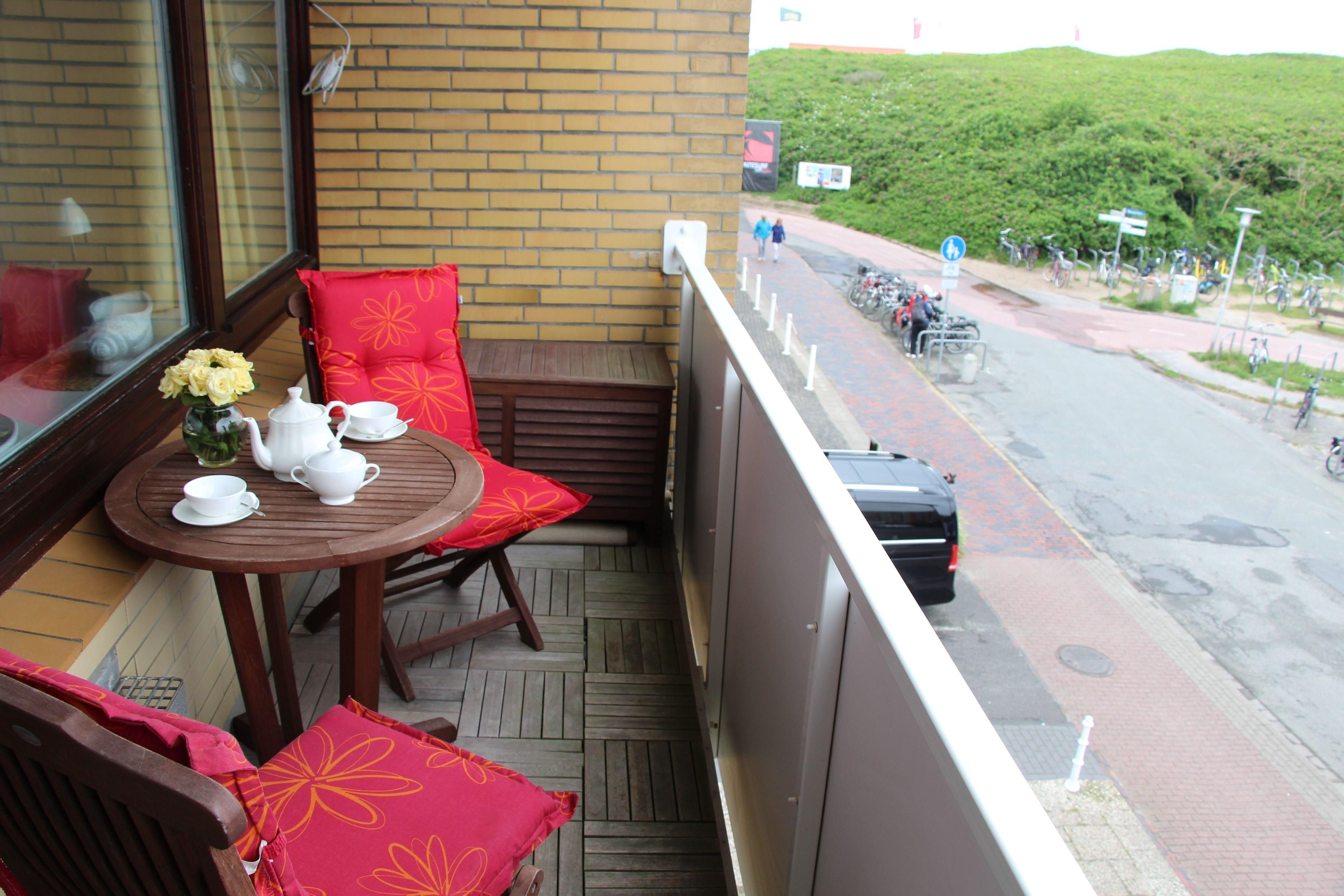 Der große Balkon ist mit Sitzgelegenheiten und einem kleinen Tisch möbliert. Auflagen sind vorhanden. Zu der Wohnung gehört ein kostenpflichtiger Parkplatz hinter dem Haus. Dort sind ebenso Abstellmöglickeiten für Fahrräder der Gäste des Hauses vorhanden.