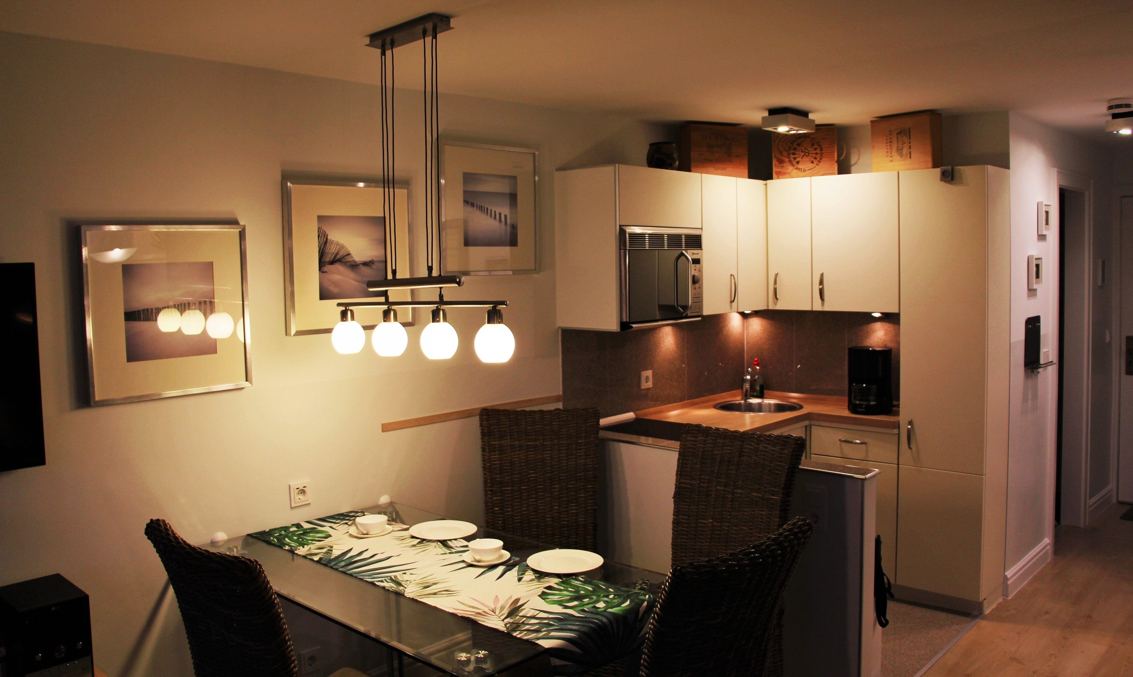 Die kleine, offene Küche ist mit einem Elektroherd mit Ceranfeld (für 2 Töpfe), Kühlschrank, Mikrowelle, Kaffemaschine, Wasserkocher und Toaster ausgestattet.