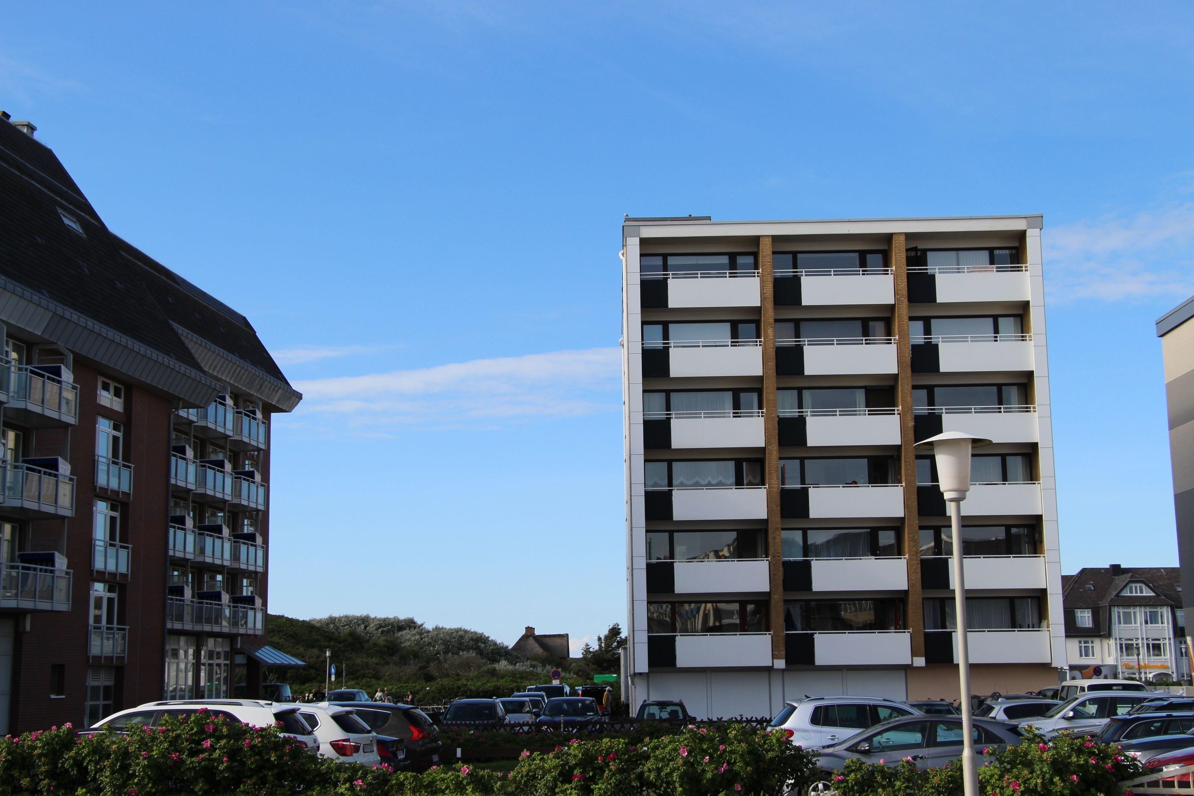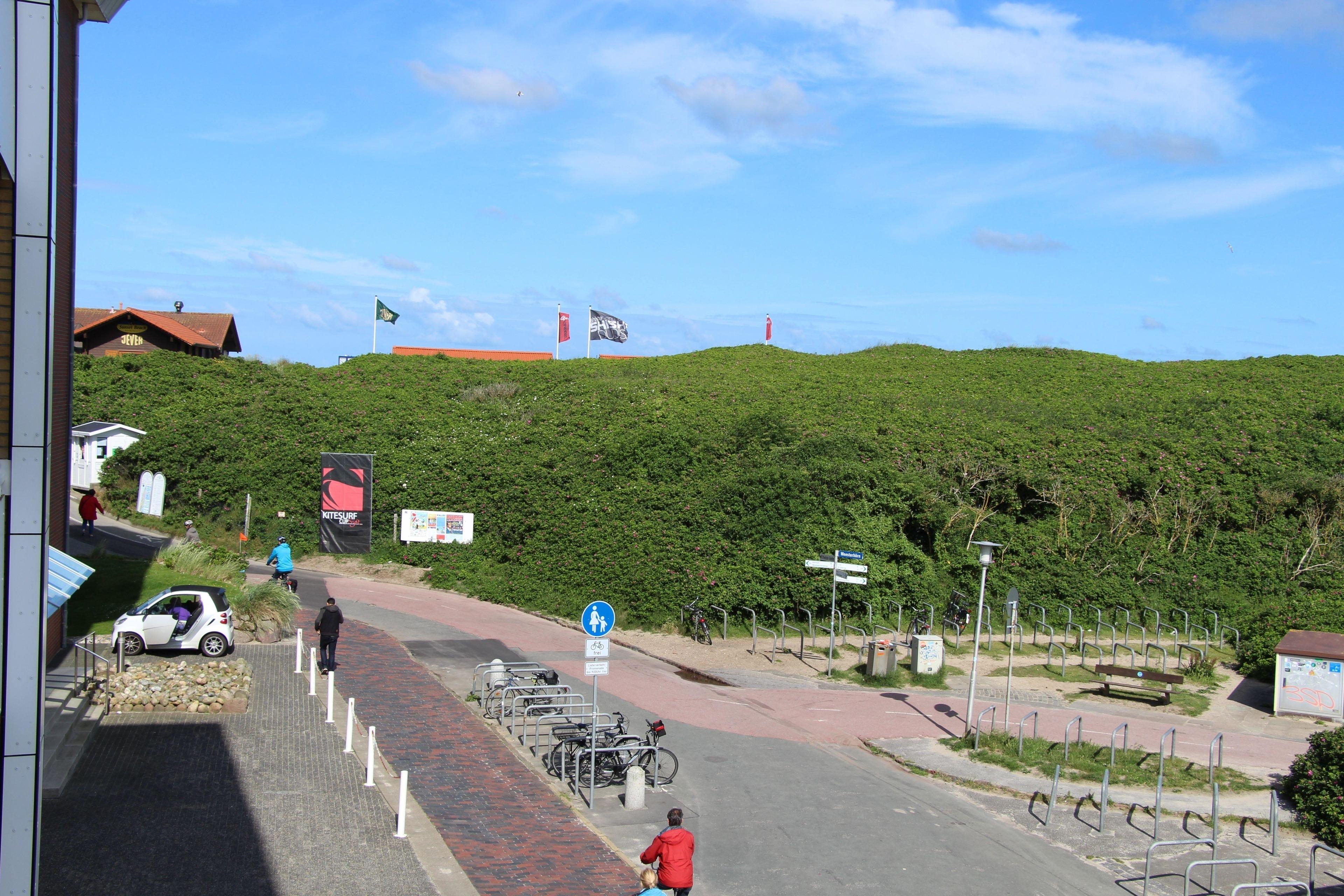 Vom großen Balkon hat man einen tollen Blick auf die Dünen und einen freien Blick über den Brandenburger Platz. Der Parkplatz ist kostenpflichtig.