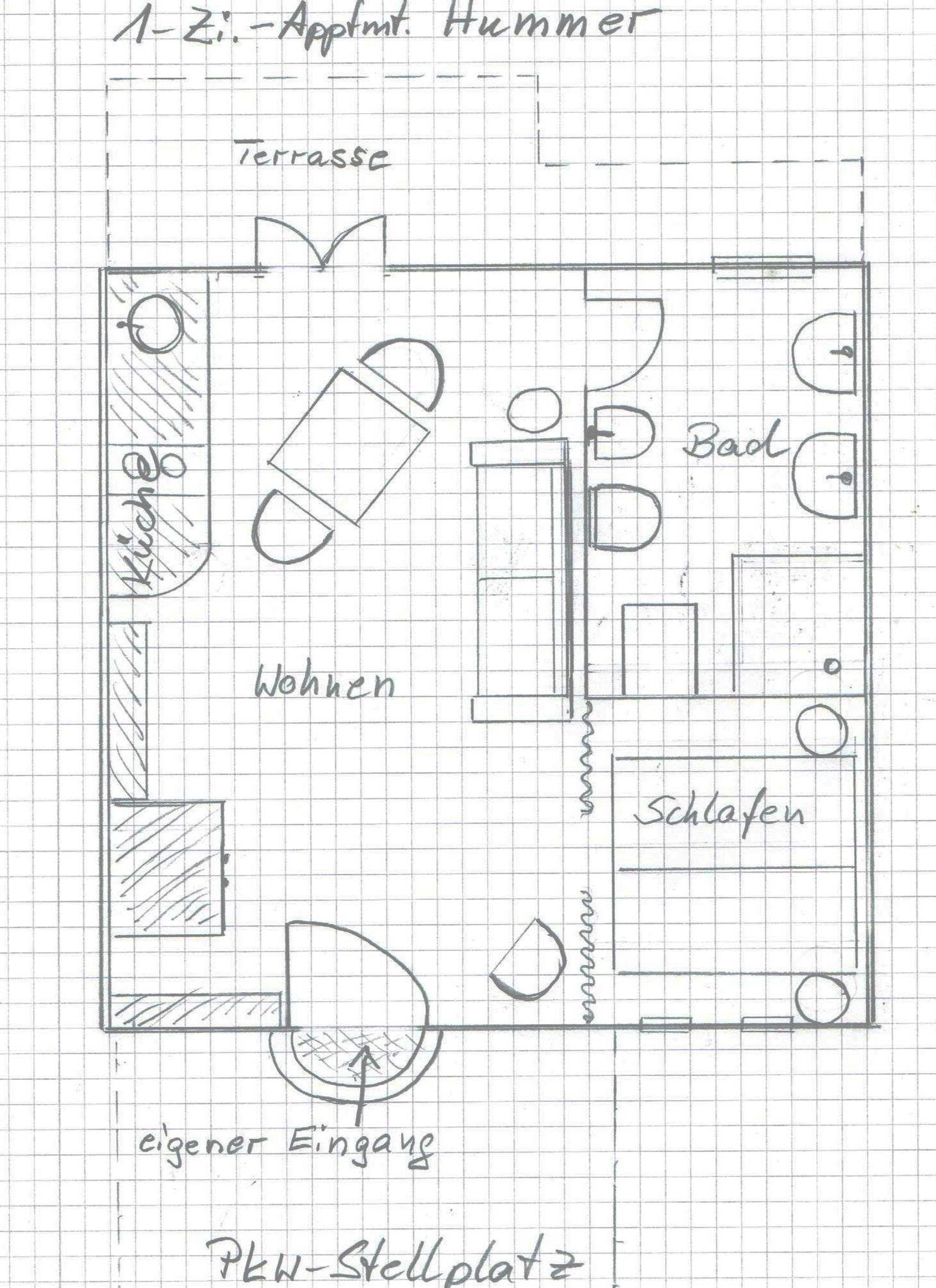 Kuscheliges 1-Zi.- Appartement für 1-2 Personen im EG mit Terrasse, eigenem Eingang, eigenem Pkw-Stellplatz