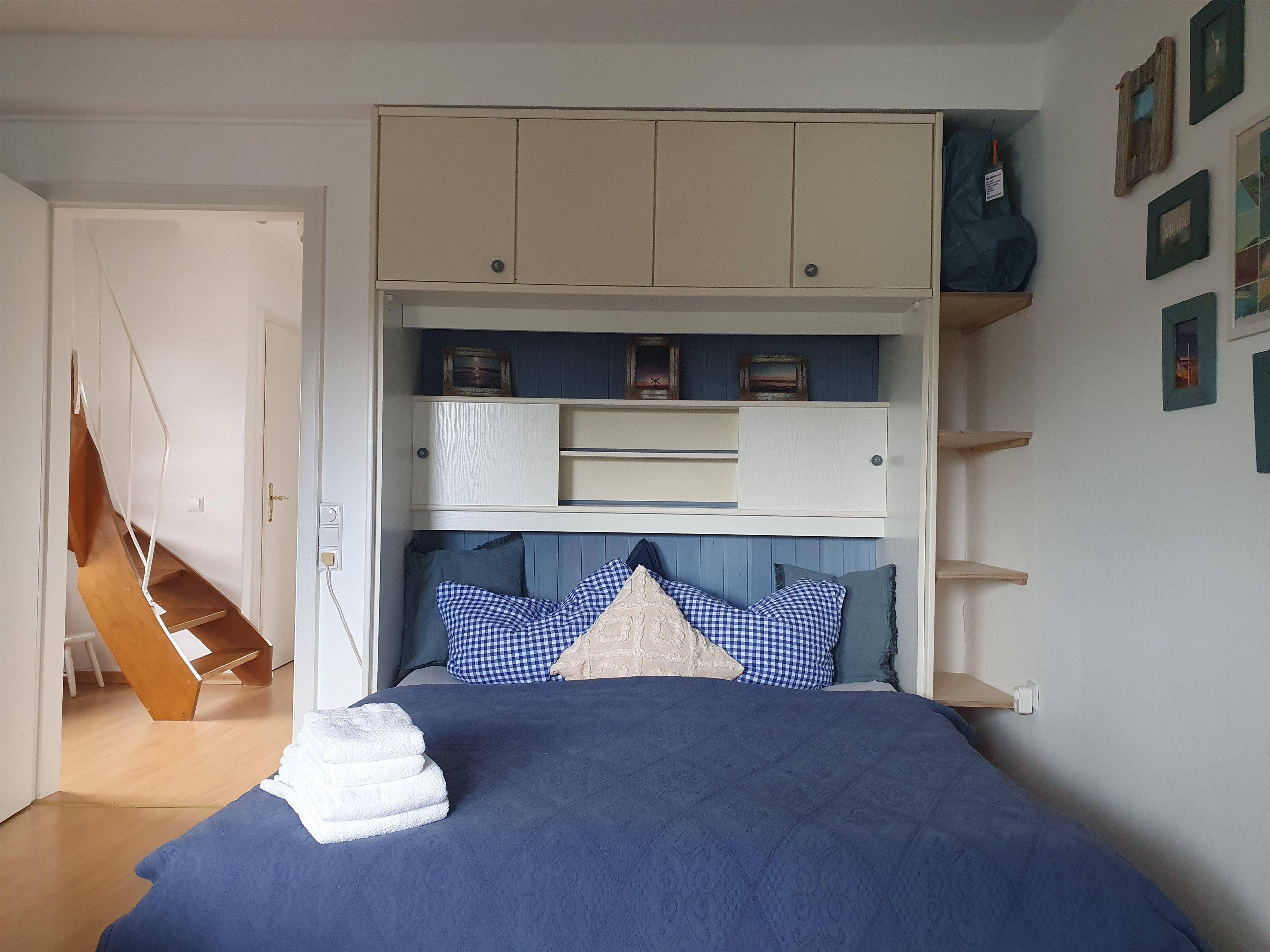 Im Dachgeschoss liegt ein weiteres Schlafzimmer mit Doppelbett, Schrank, Sessel und TV.