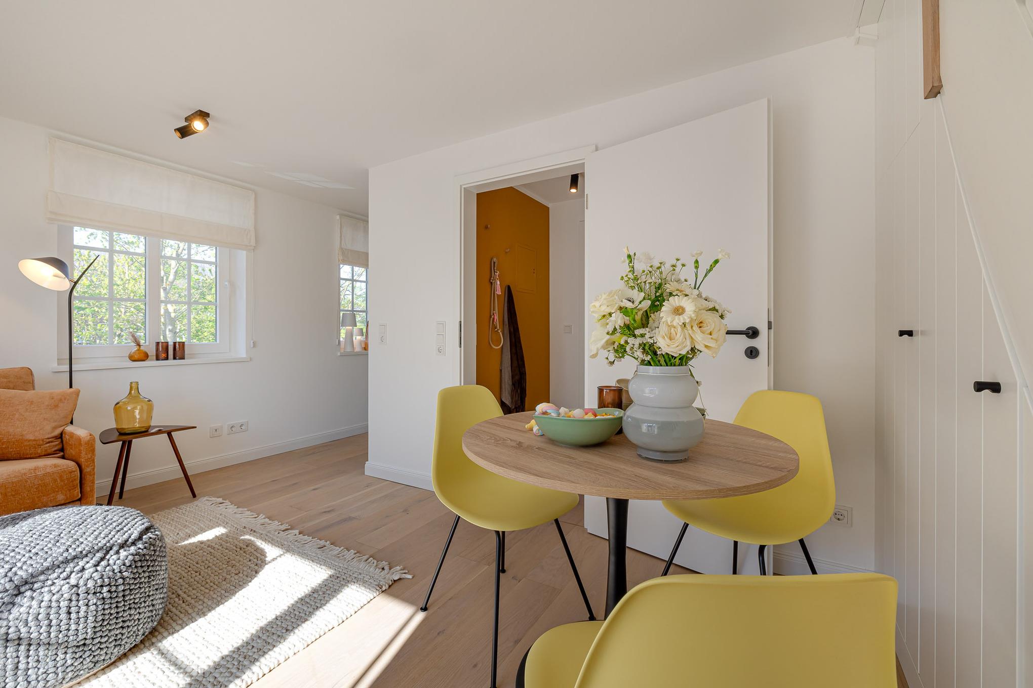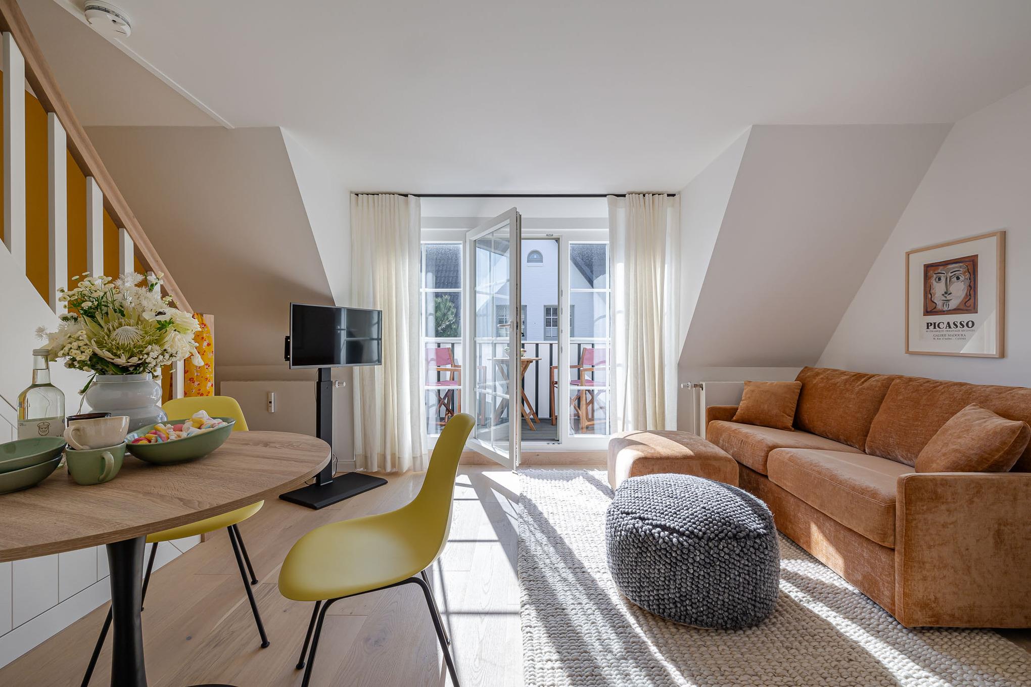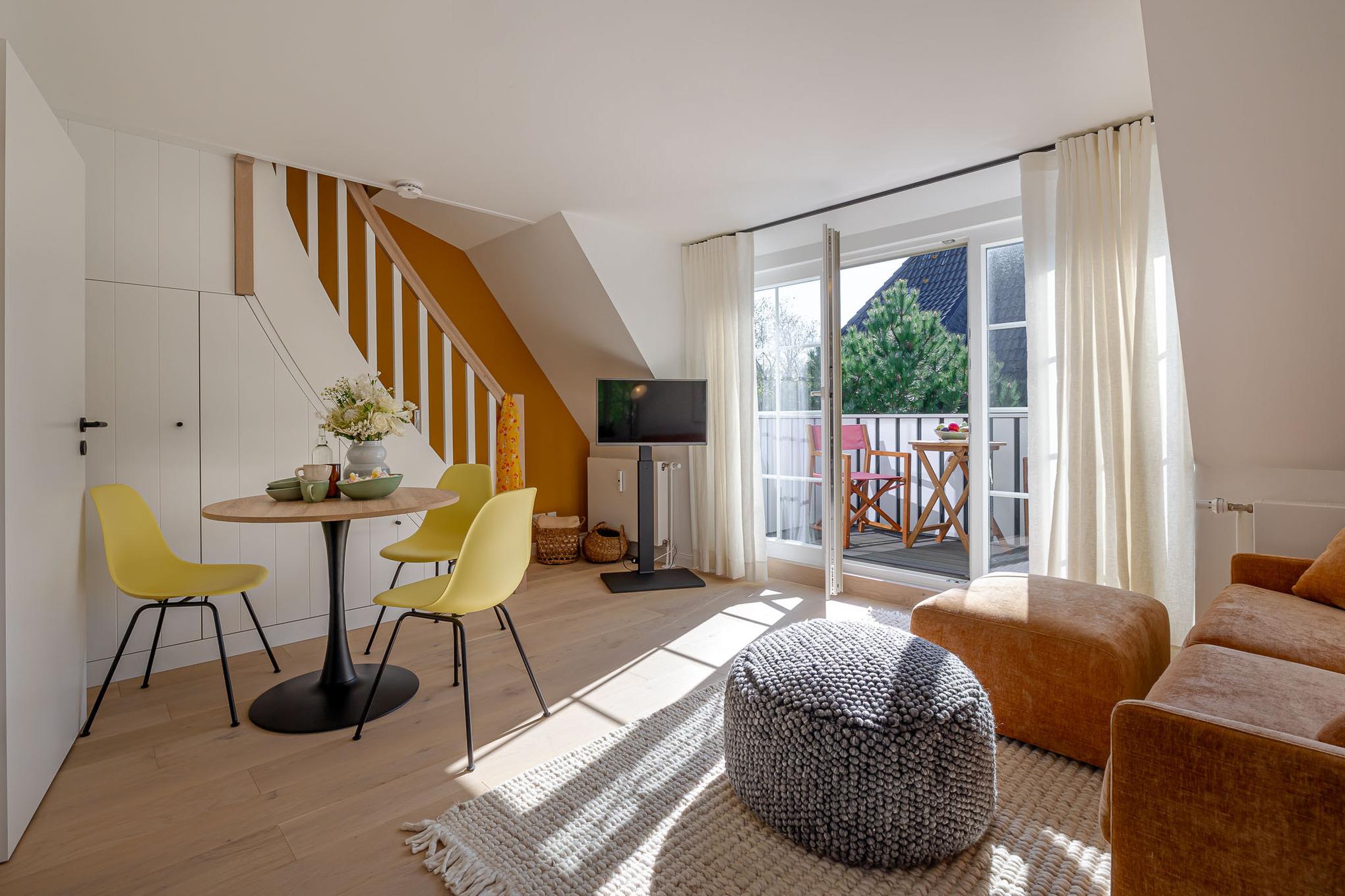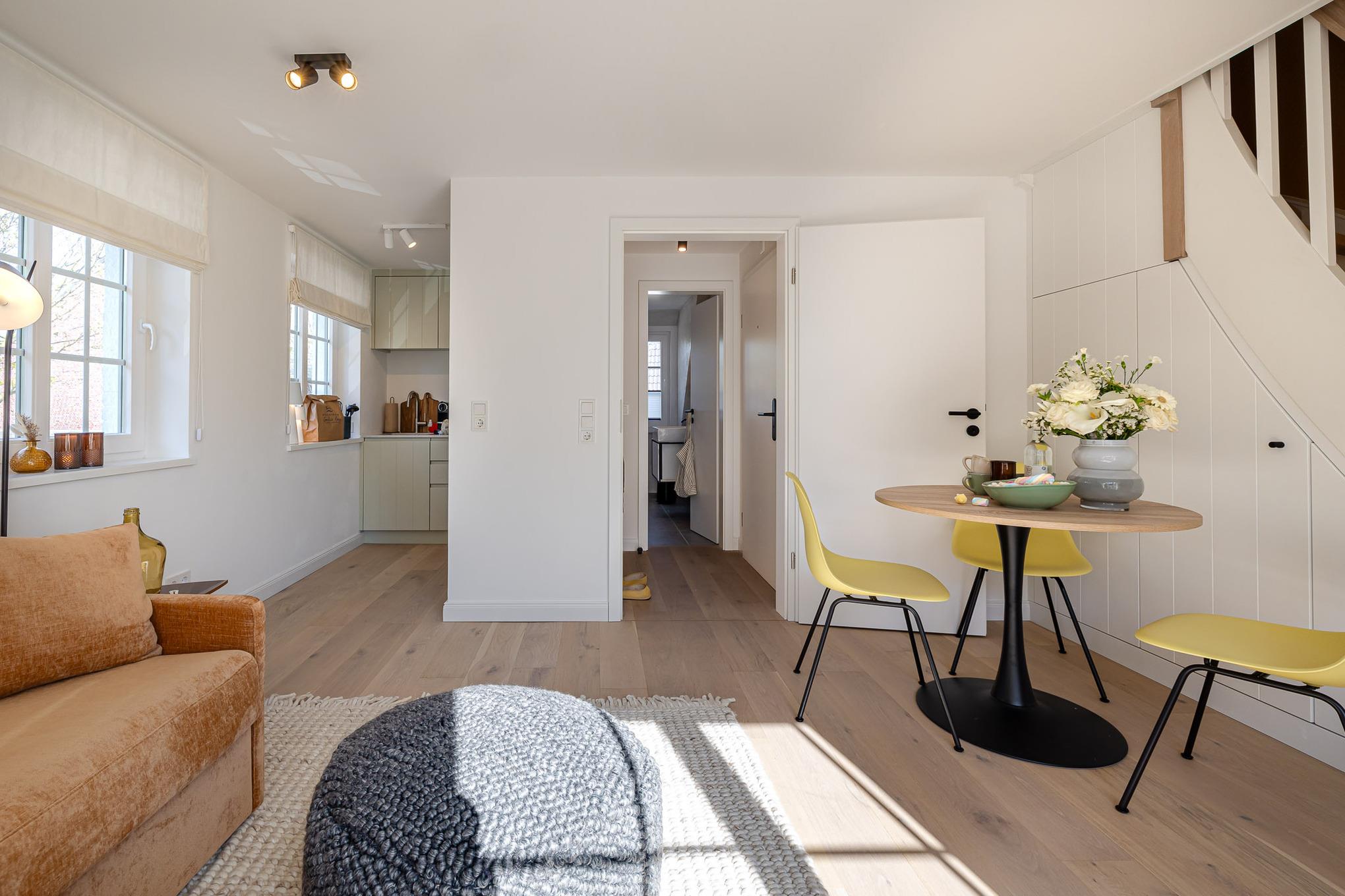 Schon beim Eintreten empfängt Sie eine helle, ruhige Atmosphäre: lichtdurchflutete Räume, edles Sylter Eichenparkett und eine hochwertig abgestimmte Einrichtung schaffen sofort dieses besondere Inselgefühl. Der Wohn- und Essbereich lädt zum Entspannen, Lesen oder gemütlichen Beisammensein ein. Hier steht auch ein bequemes Schlafsofa, das sich bei Bedarf in eine zusätzliche Schlafgelegenheit verwandeln lässt.