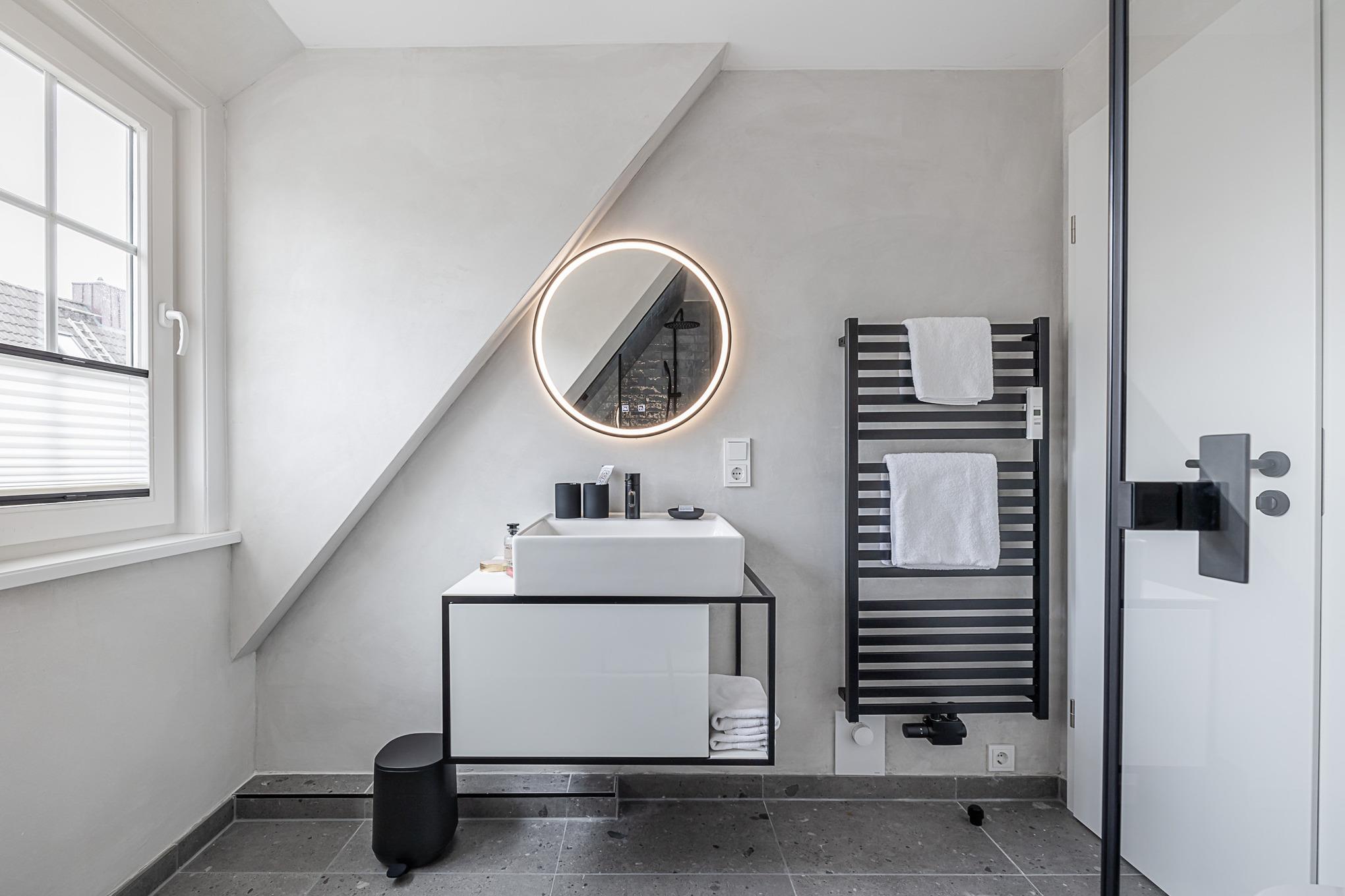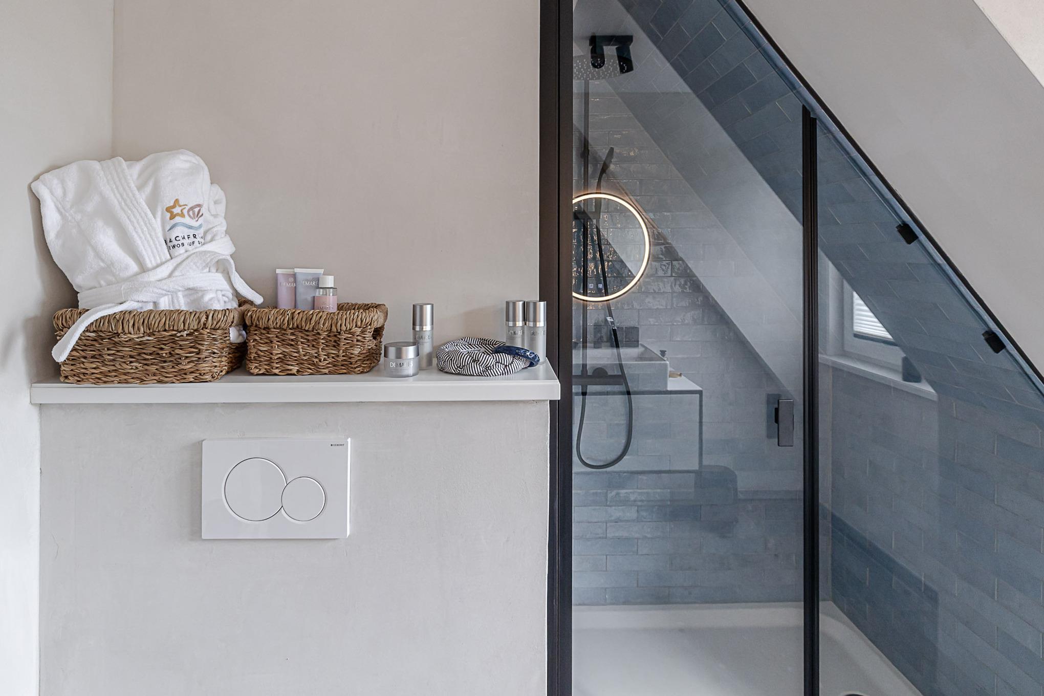 Das stilvolle Bad in Meerblau- und Sandtönen verfügt über eine großzügige Regendusche, Fußbodenheizung und einen Handtuchwärmer – ideal für entspannte Wohlfühlmomente nach einem Tag am Meer.