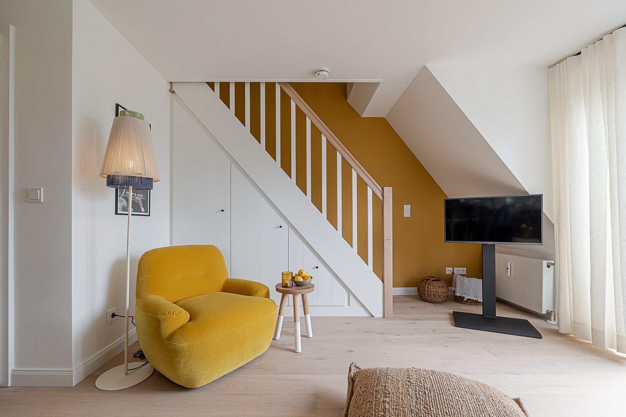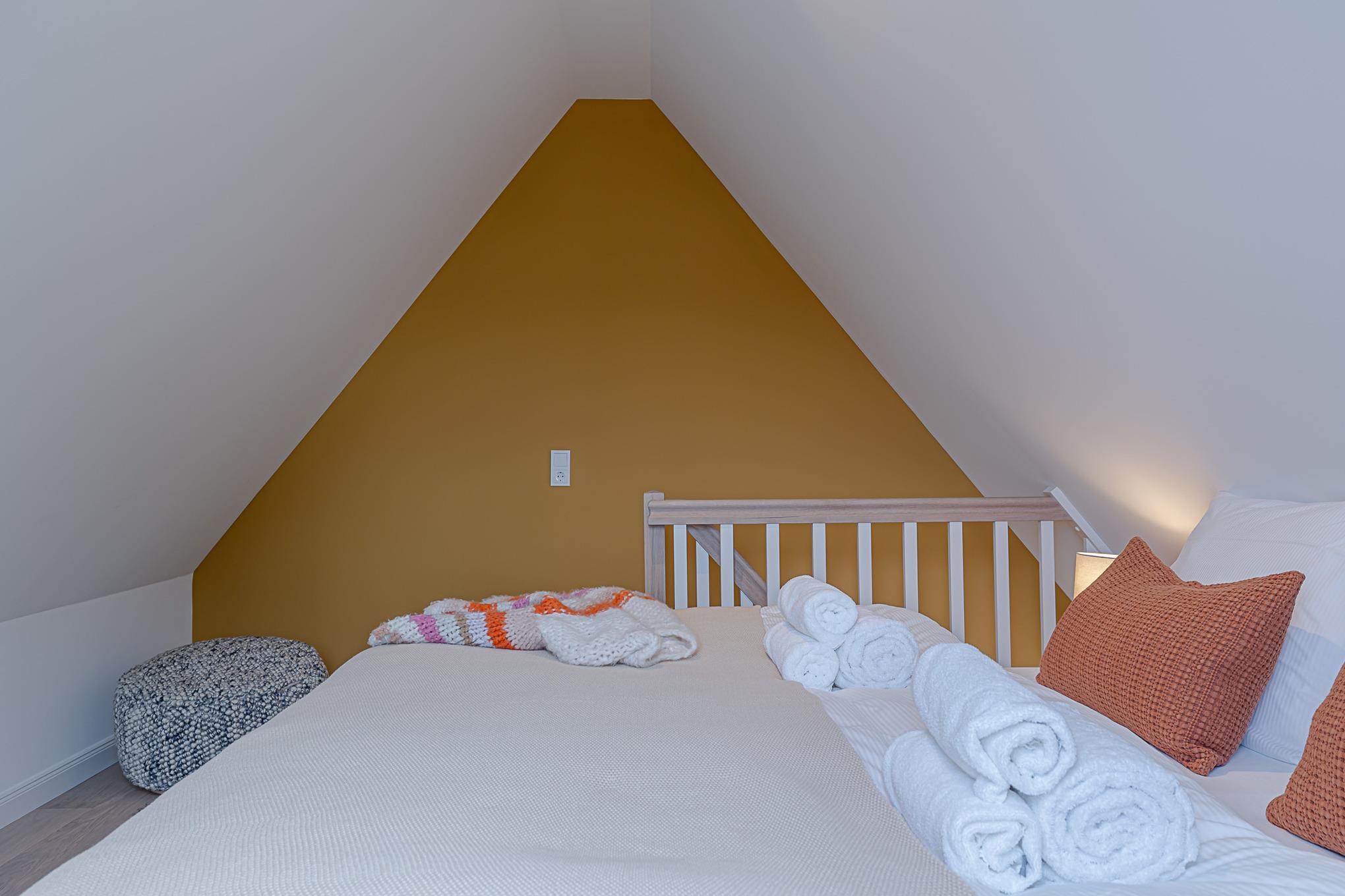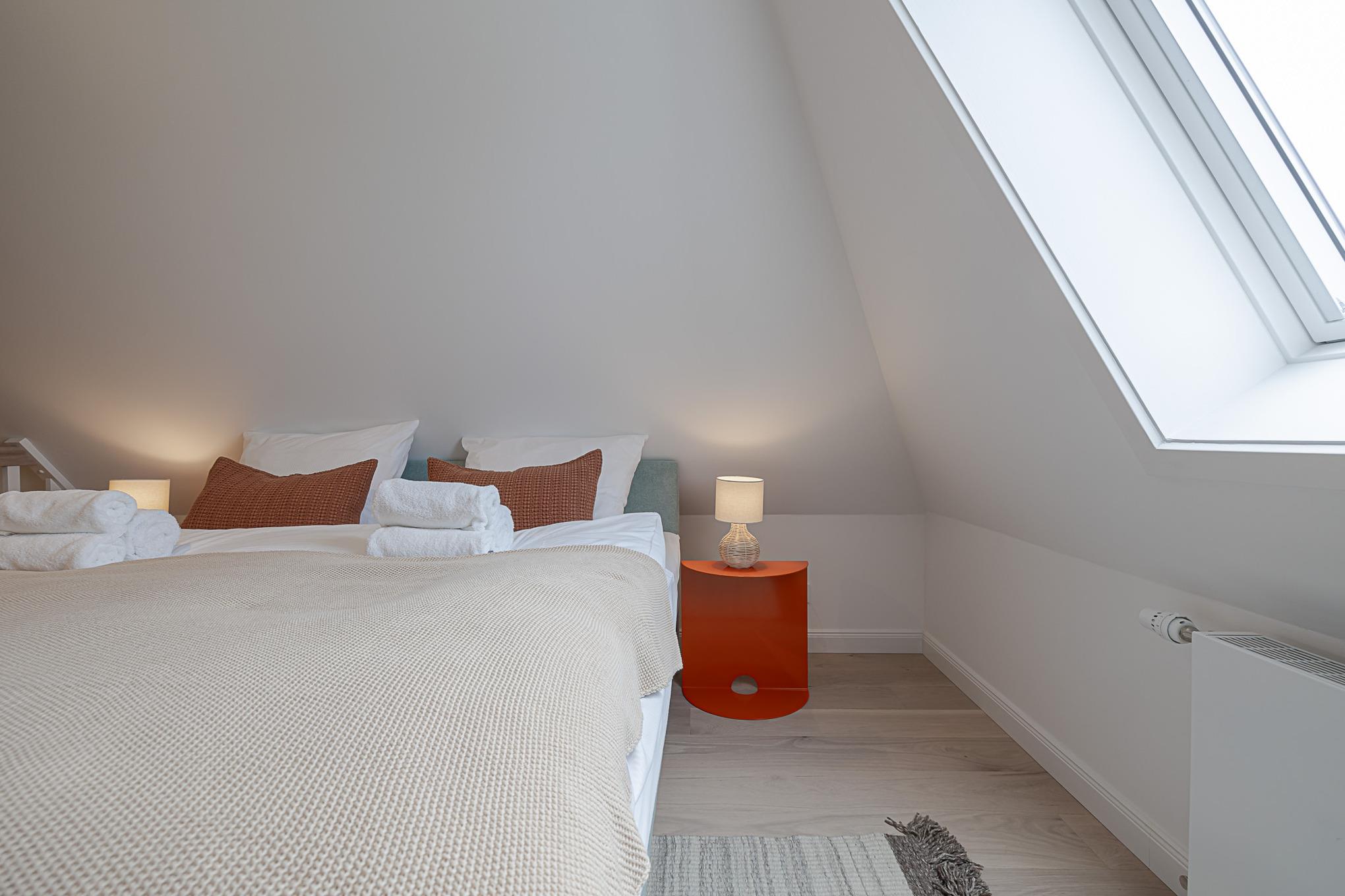 Über eine Treppe erreichen Sie den oberen Bereich der Wohnung mit dem Schlafzimmer, in dem ein komfortables Boxspringbett für ruhige und erholsame Nächte sorgt.