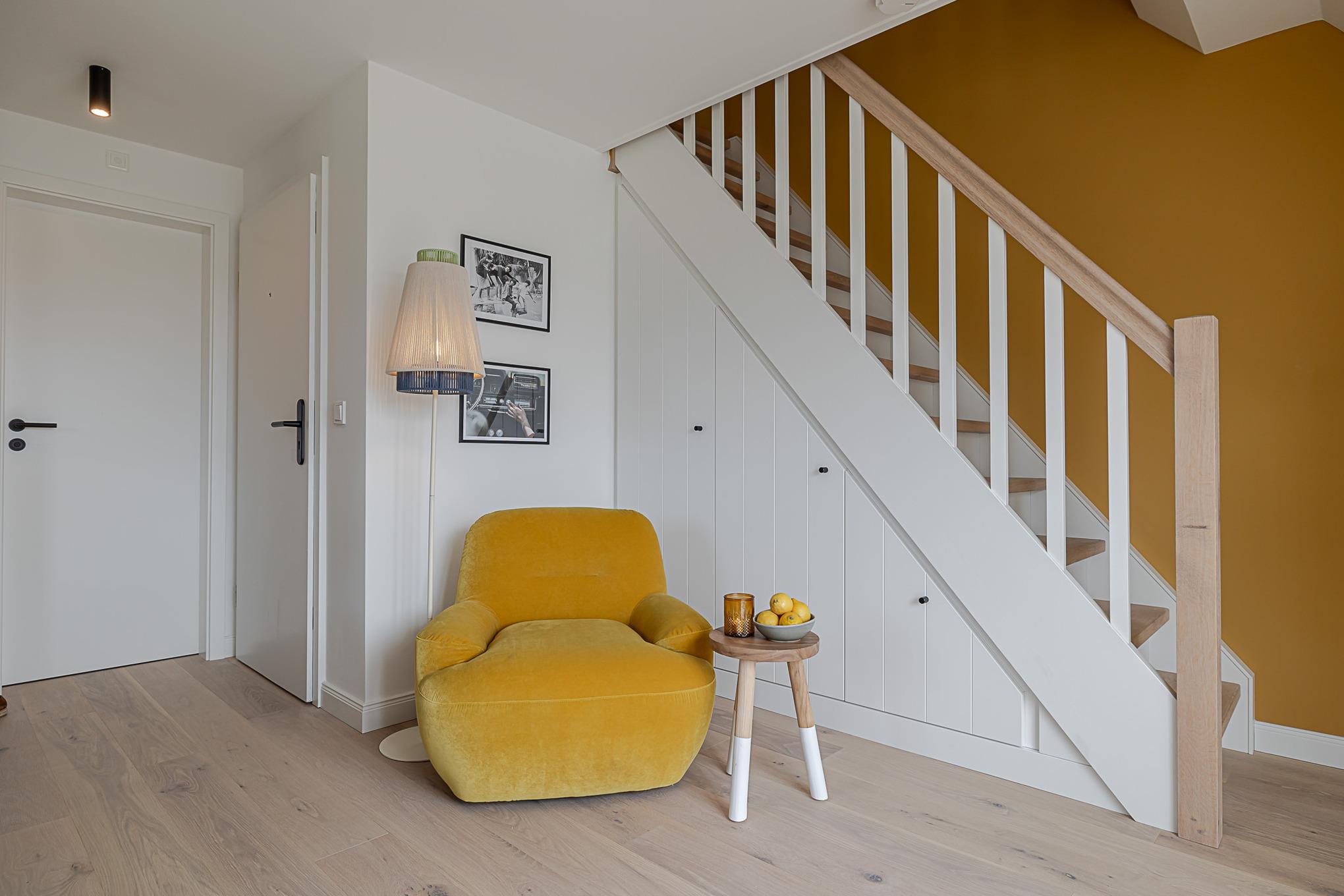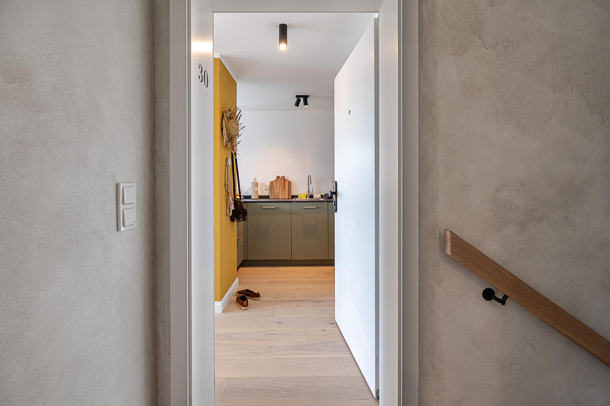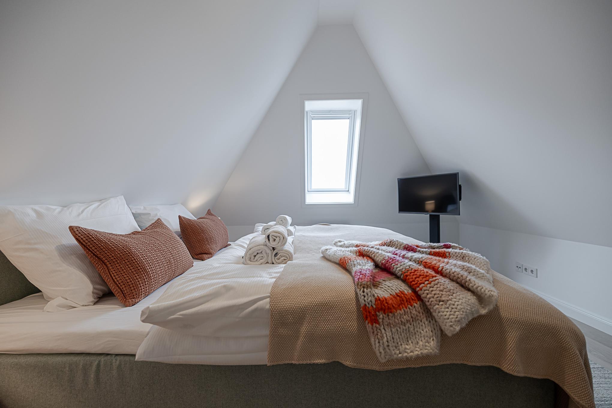 Über eine Treppe erreichen Sie den oberen Bereich der Wohnung mit dem Schlafzimmer, in dem ein komfortables Boxspringbett für ruhige und erholsame Nächte sorgt.