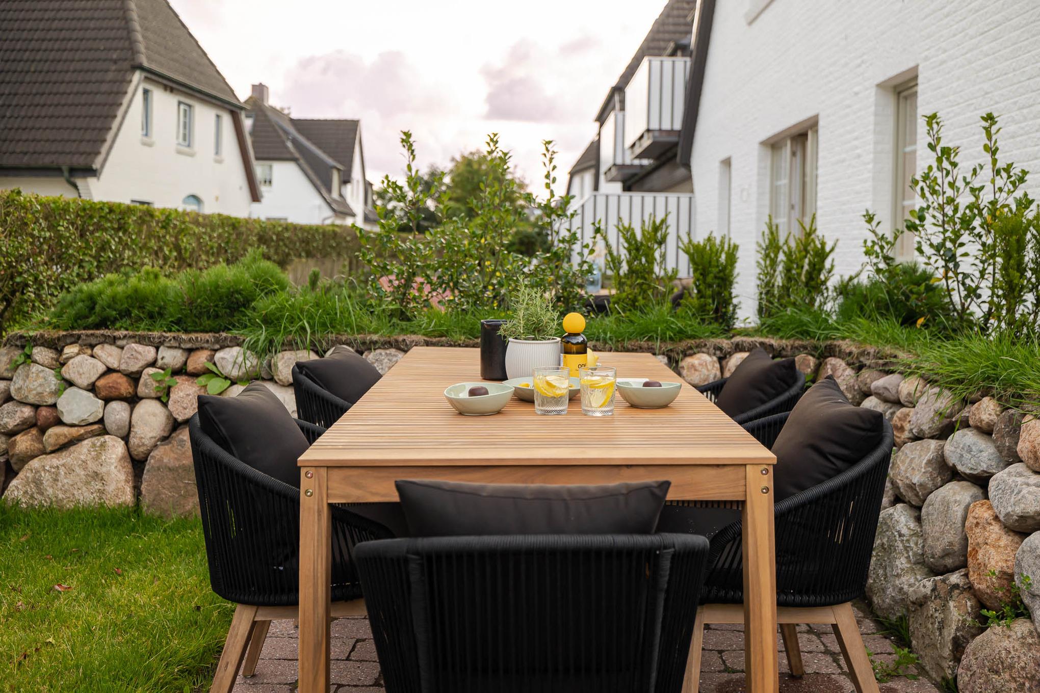 Auf dem Mitteldeck befindet sich der großzügige Wohn und Essbereich mit voll ausgestatteter Designküche mit Geräten von Siemens sowie ein gemütlicher Wohnbereich mit vollwertigem Schlafsofa. Hier wird gemeinsam gekocht gelacht und entspannt. Ebenfalls auf dieser Ebene liegt ein Schlafzimmer mit hochwertigem Schramm Boxspringbett sowie das elegante Bad mit Regendusche Fußbodenheizung und Handtuchwärmer. Ihre kleine private Wellnessoase. Über die Treppe erreichen Sie das Oberdeck mit zwei weiteren Schlafzimmern ausgestattet mit einem Boxspringbett sowie zwei Einzelbetten und maßgefertigten Einbauschränken für maximalen Komfort. Ein besonderes Plus ist der eigene kleine Gartenbereich hinter Dock 6a der von Mai bis Oktober mit Loungemöbeln zum Sonnen Lesen und Durchatmen einlädt.