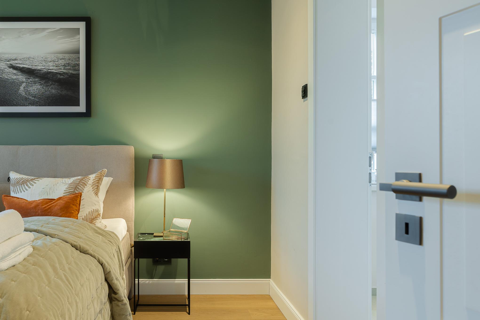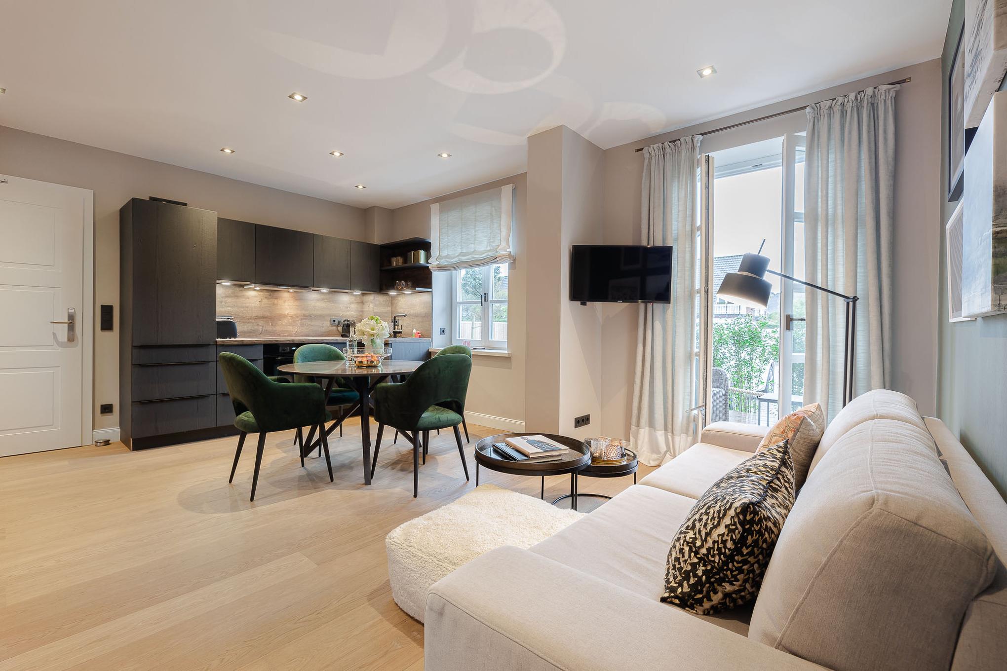 Schon beim Ankommen empfängt Sie eine helle, großzügige Atmosphäre: hohe Decken, viel Tageslicht und eine modern-elegante Einrichtung schaffen ein echtes Wohlfühlambiente. Der offene Wohn- und Essbereich ist das Herz der Wohnung. Ein komfortables Schlafsofa ergänzt den Raum und bietet bei Bedarf eine zusätzliche Schlafgelegenheit.