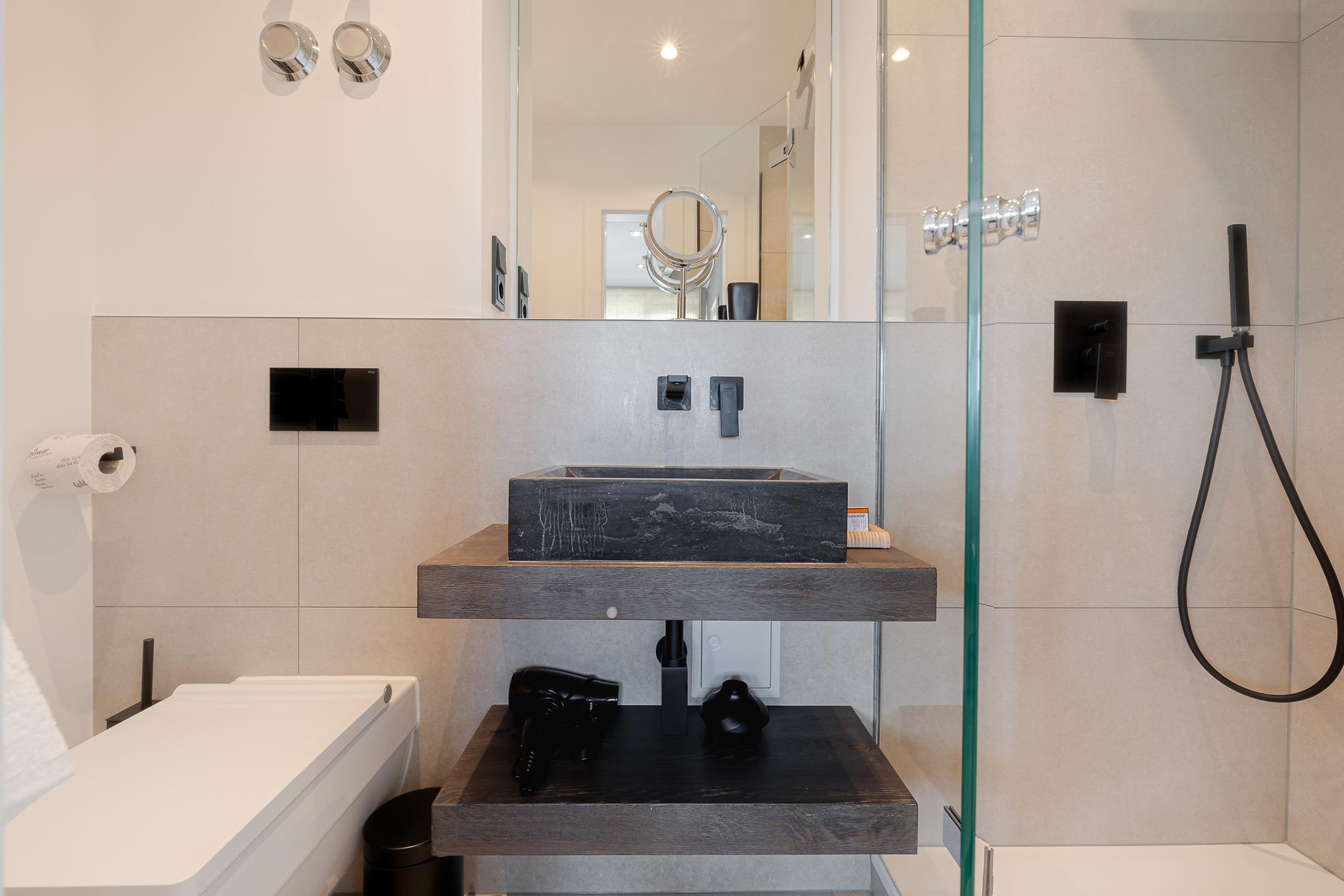 Die Küche ist hochwertig eingerichtet und vollständig ausgestattet mit Geräten von Gaggenau und Miele. Für erholsame Nächte sorgt das gemütliche Boxspringbett im Schlafzimmer, während das moderne Badezimmer mit einer großzügigen Regendusche überzeugt. Ein Starterpaket für Küche und Bad ist inklusive.