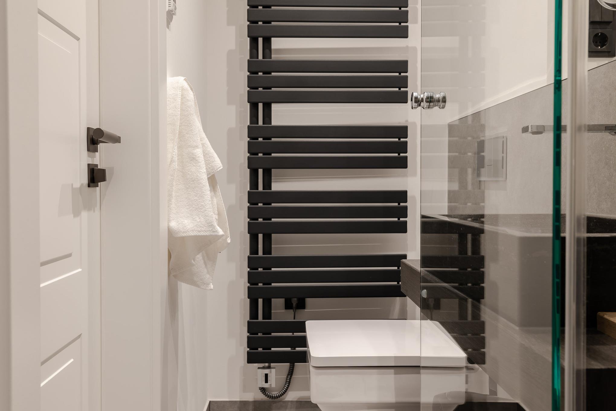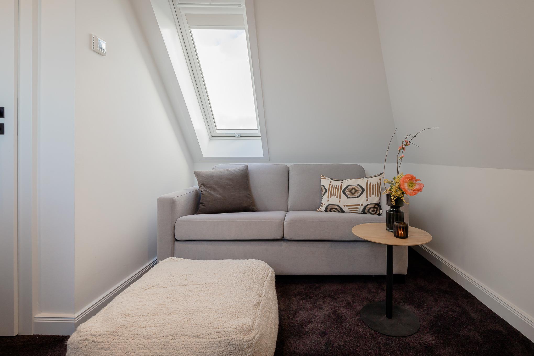 Auf der oberen Etage der Maisonette befindet sich ein zusätzlicher Wohn- und Arbeitsbereich mit Schreibtisch und Sofa sowie ein weiteres WC-Badezimmer. In der gesamten Wohnung sorgt Fußbodenheizung auch im Winter für eine angenehme Wohlfühltemperatur.