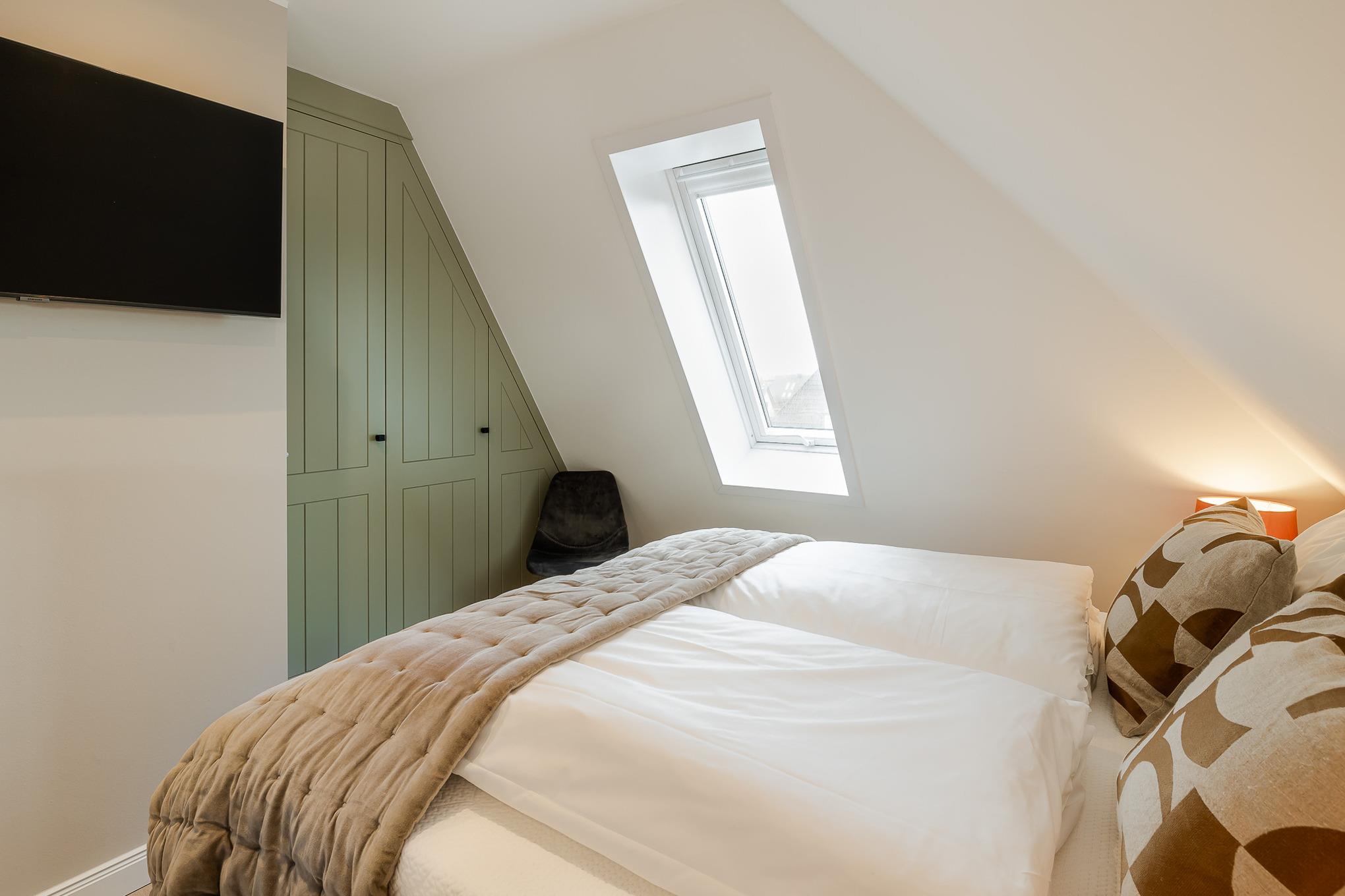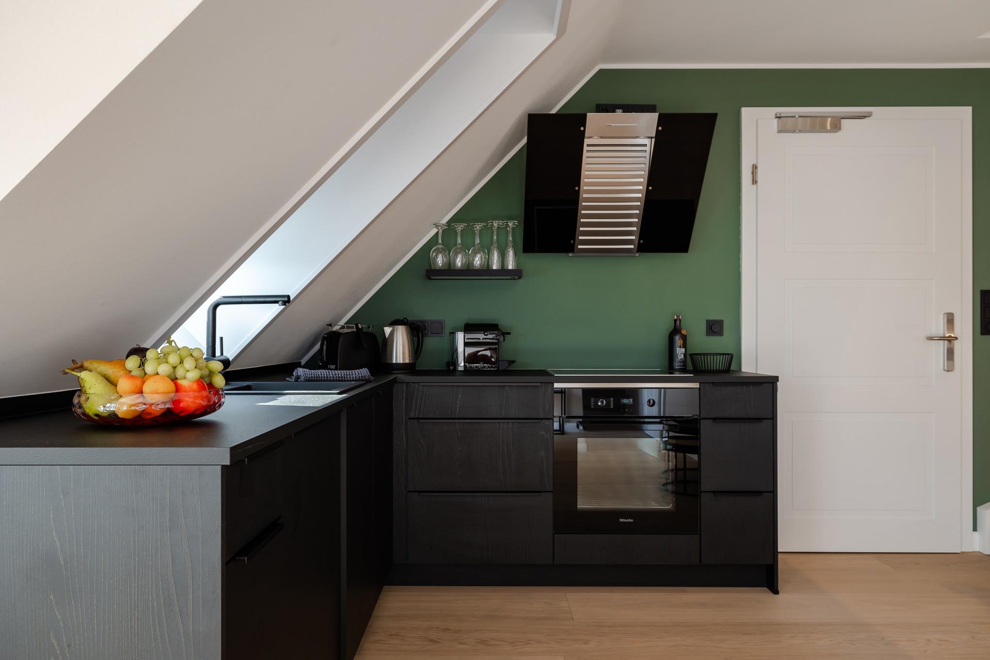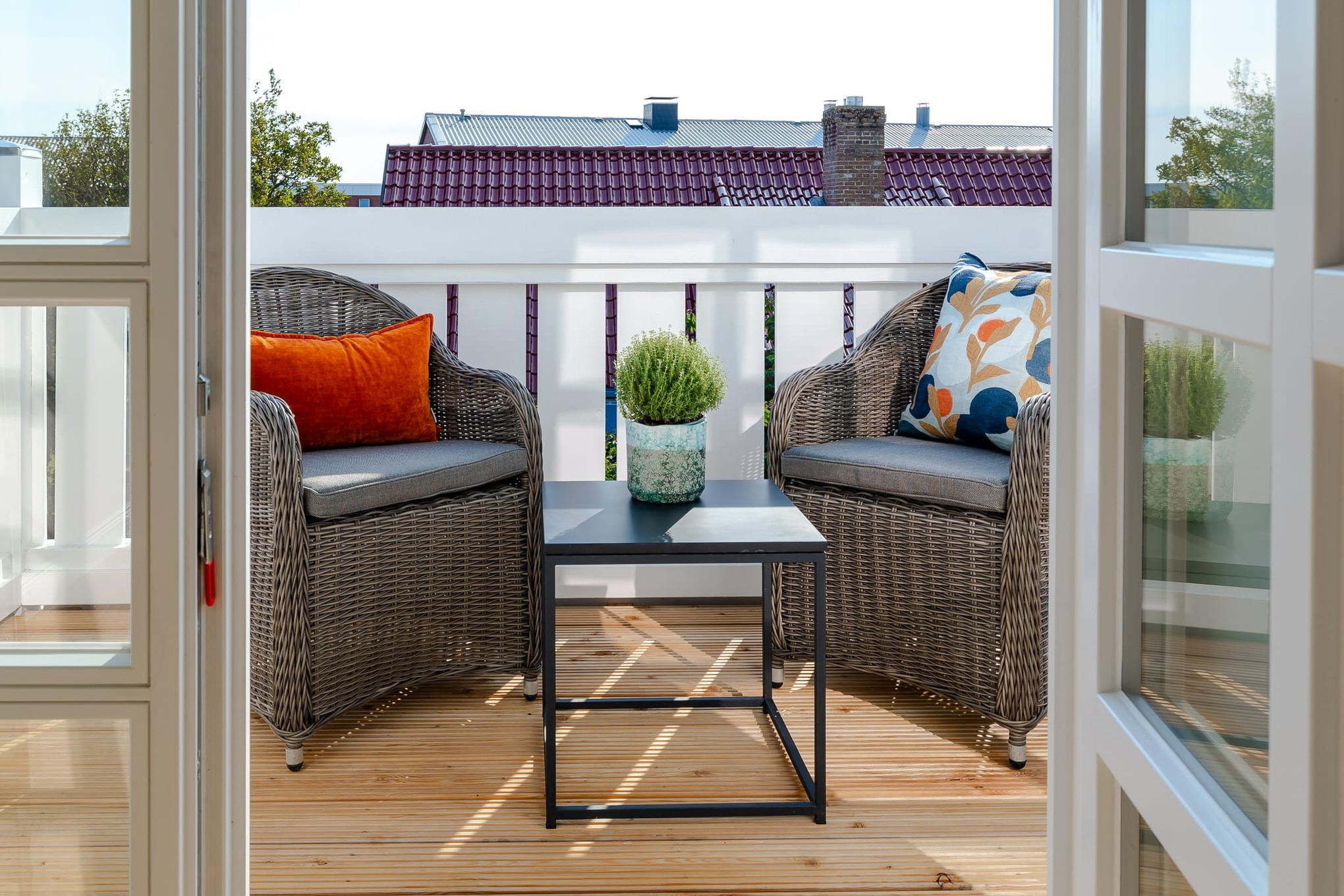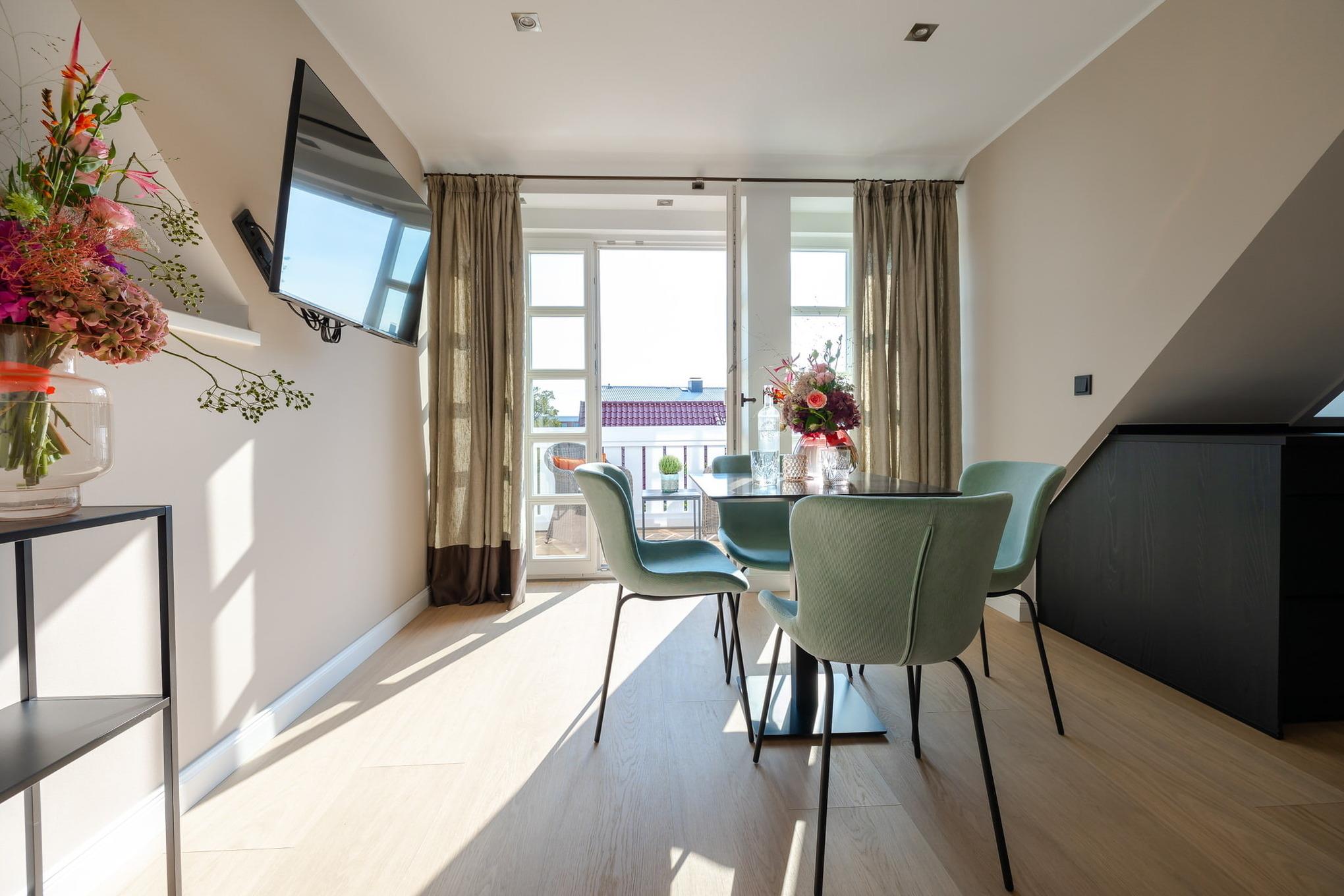 Die 3-Zimmer-Maisonette ist eine kleine Wohlfühl-Oase: hohe Decken, lichtdurchflutete Räume und eine stylische, moderne Ausstattung machen Ihren Aufenthalt besonders angenehm. Der großzügige Wohn- und Essbereich ist mit einem Schlafsofa ausgestattet und bietet Zugang zum Balkon in Richtung Osten – ideal für einen Kaffee im Licht des Sonnenaufgangs.