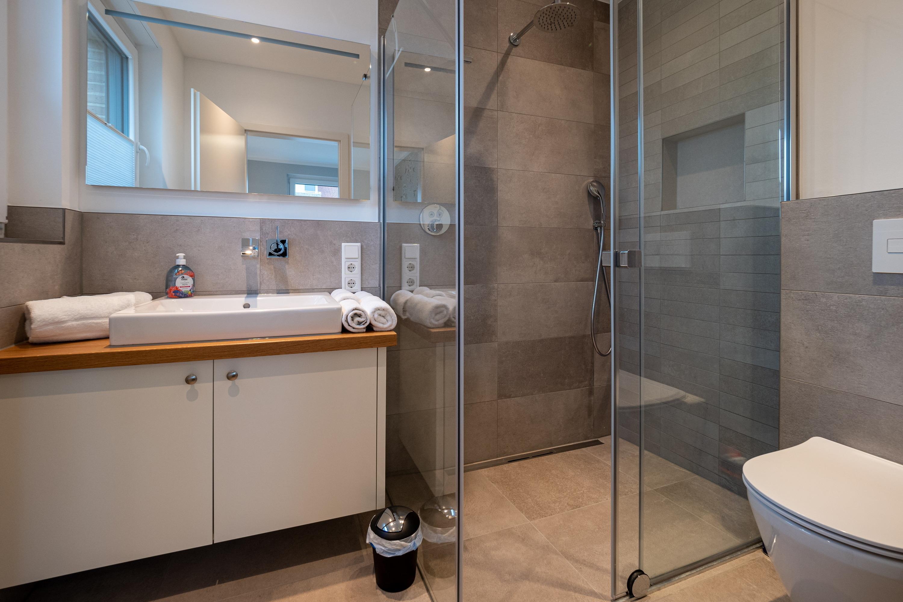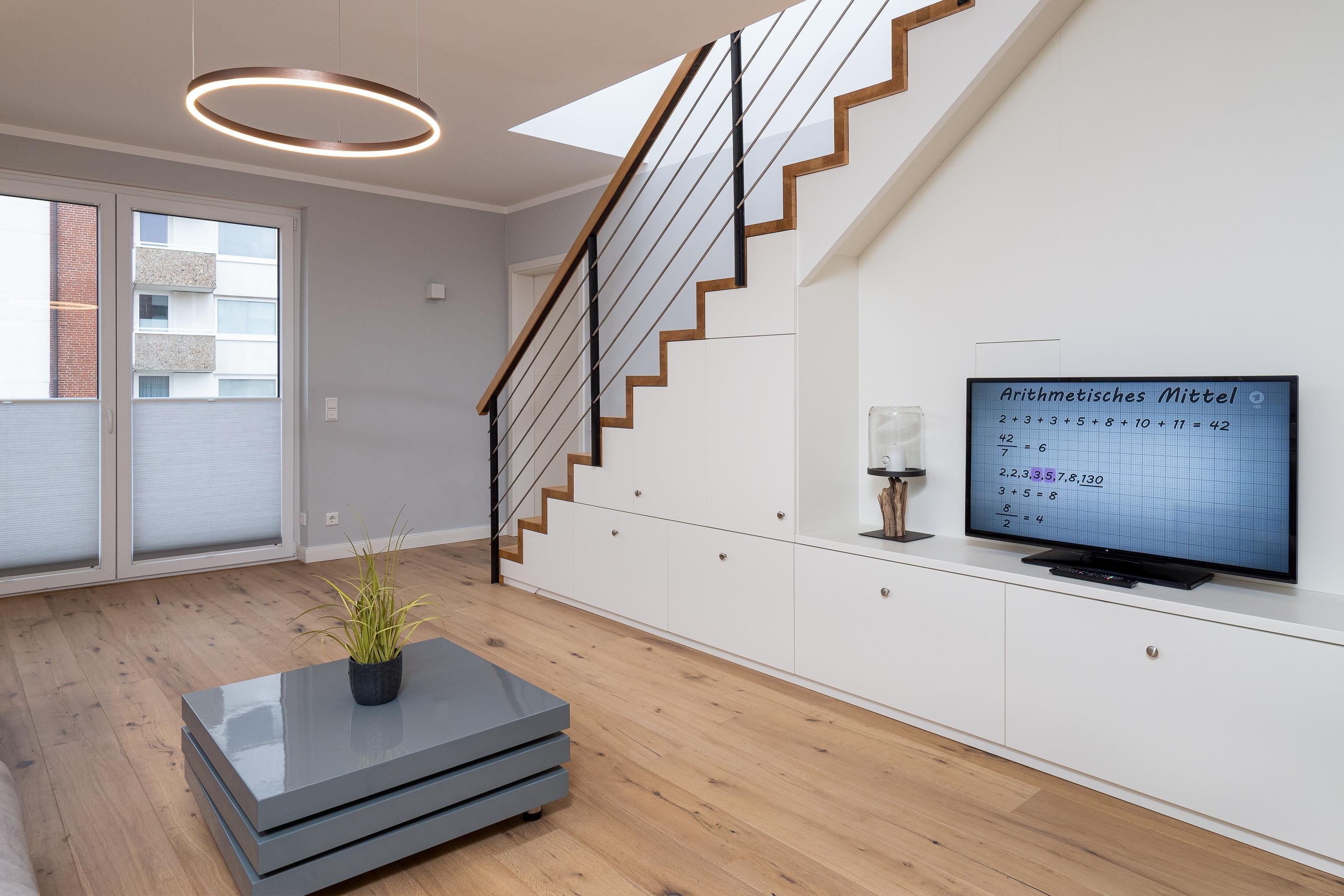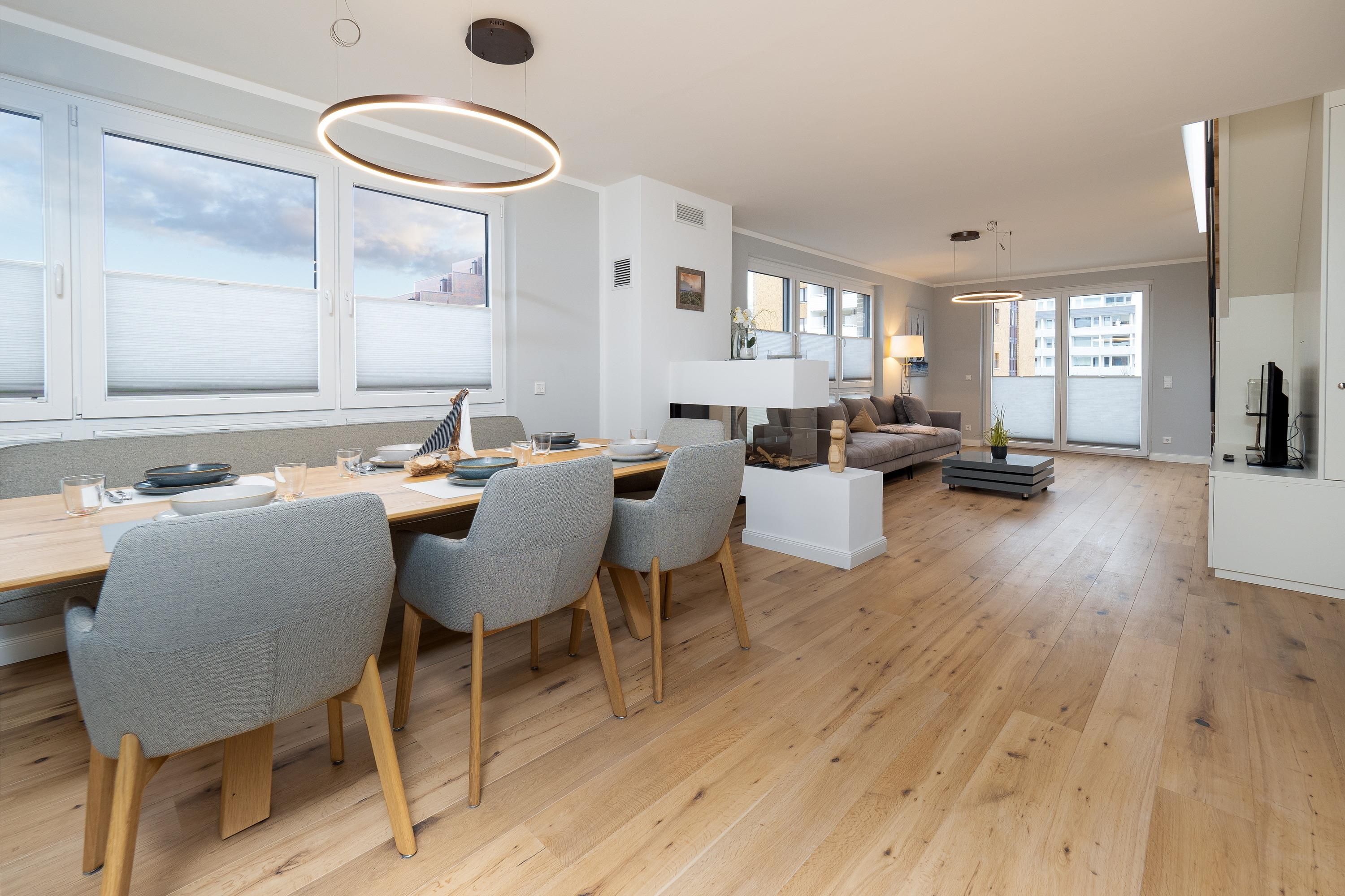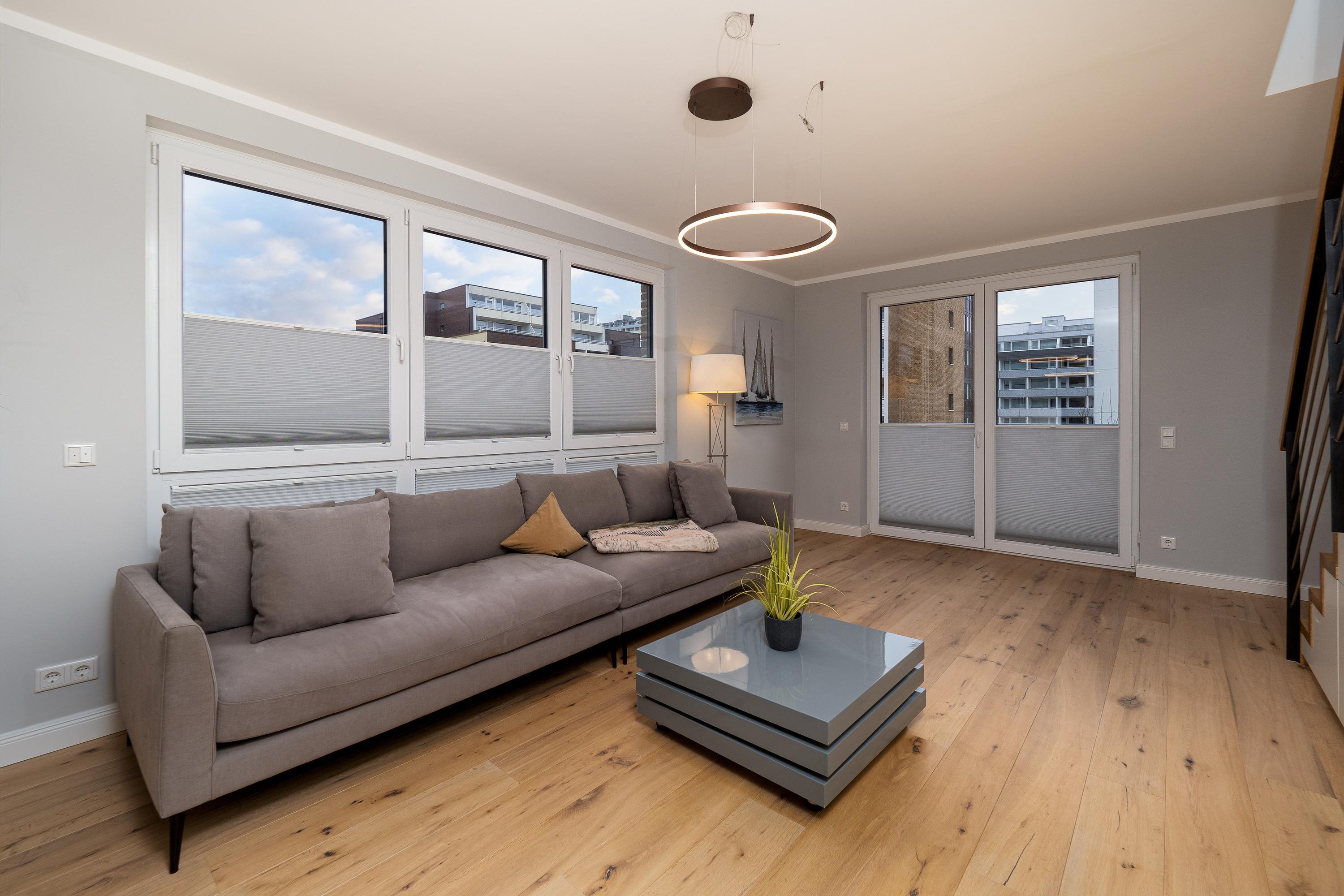 Unser Penthouse bietet Ihnen Platz für bis zu 4 Personen. Alle Räume sind gefliest z.T. in warmer Holzoptik. 2 Schlafzimmer mit Boxspringbetten 180×200, jeweils mit Einbauschrank, Kommode und TV ausgestattet, lassen Sich durch elektr. Rollläden auch perfekt verdunkeln. Zusätzlich zu 2 Duschbädern, steht ein separates Gäste-WC zur Verfügung. Der Wohn-Essbereich wurde mit einer interessanten Küche zum Familienmittelpunkt gestaltet! Auf der großzügigen Terrasse lässt sich das Freiluftfrühstück oder der Sundowner gut genießen.