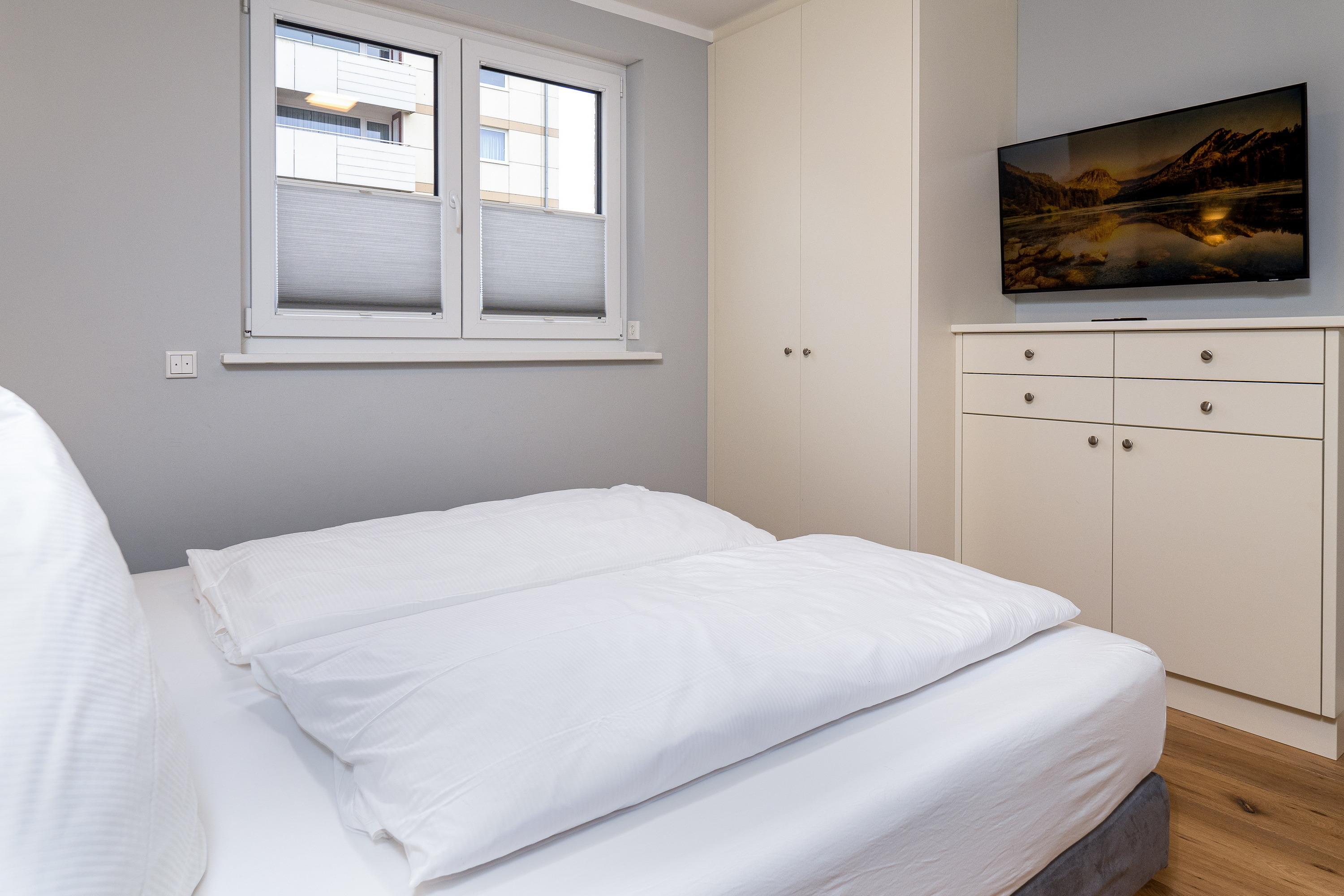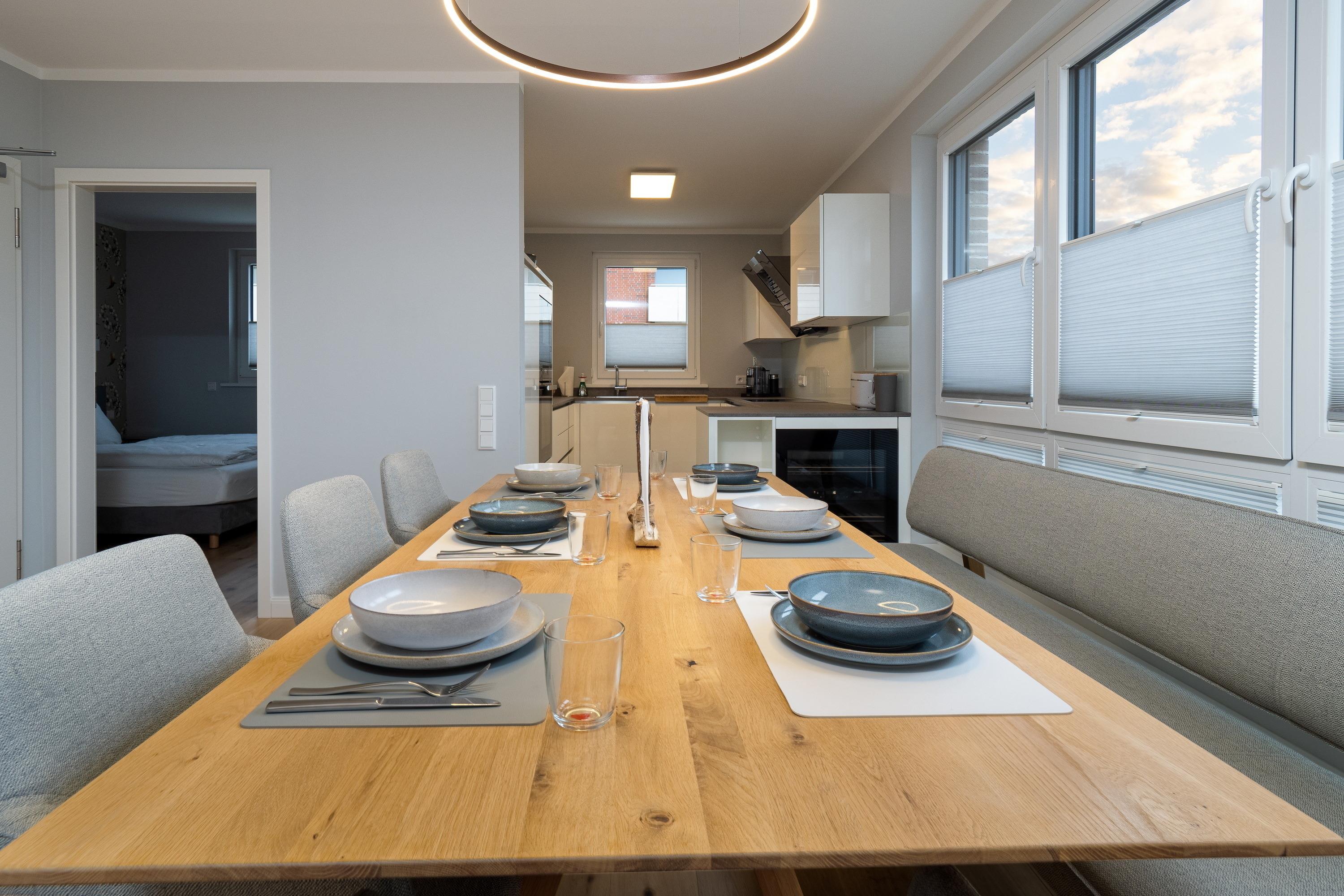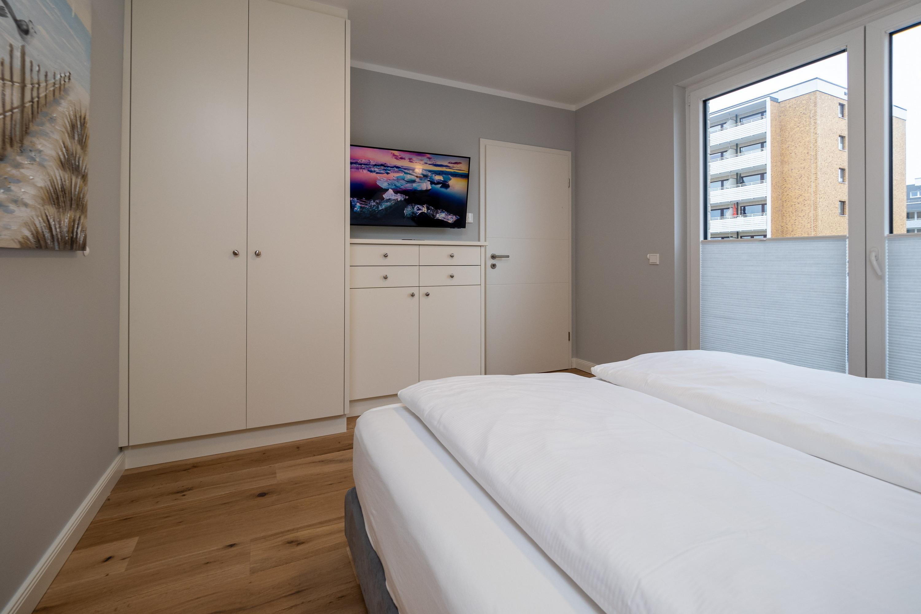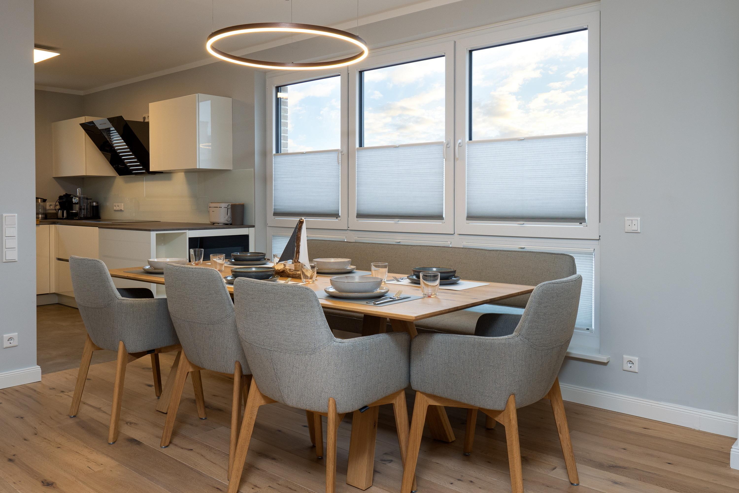 Unser Penthouse bietet Ihnen Platz für bis zu 4 Personen. Alle Räume sind gefliest z.T. in warmer Holzoptik. 2 Schlafzimmer mit Boxspringbetten 180×200, jeweils mit Einbauschrank, Kommode und TV ausgestattet, lassen Sich durch elektr. Rollläden auch perfekt verdunkeln. Zusätzlich zu 2 Duschbädern, steht ein separates Gäste-WC zur Verfügung. Der Wohn-Essbereich wurde mit einer interessanten Küche zum Familienmittelpunkt gestaltet! Auf der großzügigen Terrasse lässt sich das Freiluftfrühstück oder der Sundowner gut genießen.