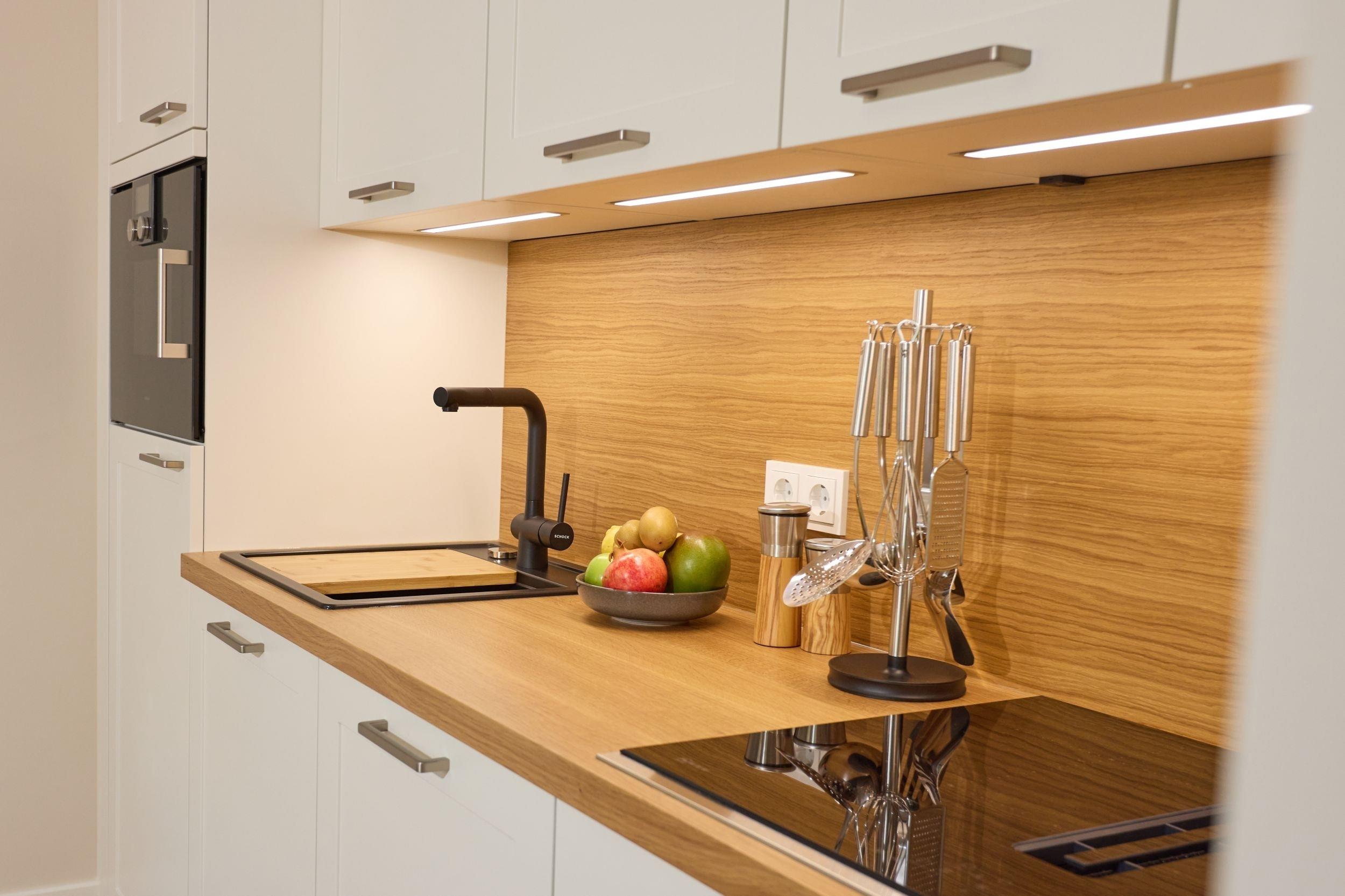 Die Küchenzeile ist mit modernen Elektrogeräten und Inventar ausgestattet und lässt auch was Ästhetik angeht keine Wünsche offen. Ein Esstisch mit 4 Stühlen sowie ein großes Sofa und eine kleine Leseecke mit Sessel runden diese schöne Wohnküche ab.