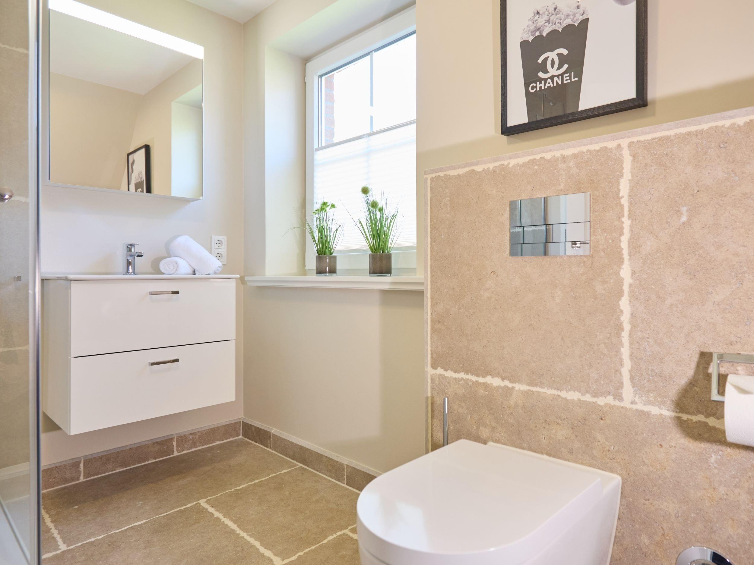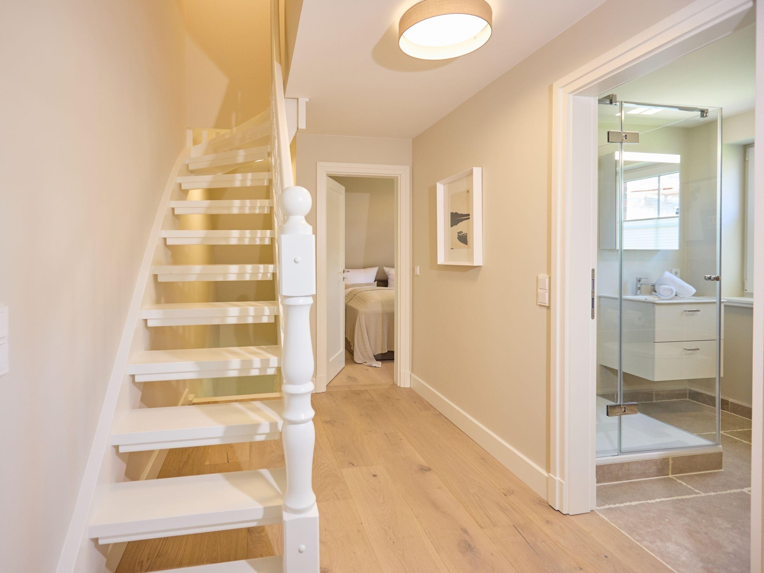Folgen Sie nun der Treppe ins 1.OG erblicken Sie ein helles, modern ausgestattetes Duschbad sowie ein Schlafzimmer mit Doppelbett und ausreichend Stauraum, falls es ein längerer Aufenthalt sein soll. Folgen Sie der Treppe nun ein weiteres Stockwerk nach oben gelangen Sie in einen lichtdurchfluteten Spitzboden. Hier erwartet Sie ein zweites Schlafzimmer mit zwei Einzelbetten.