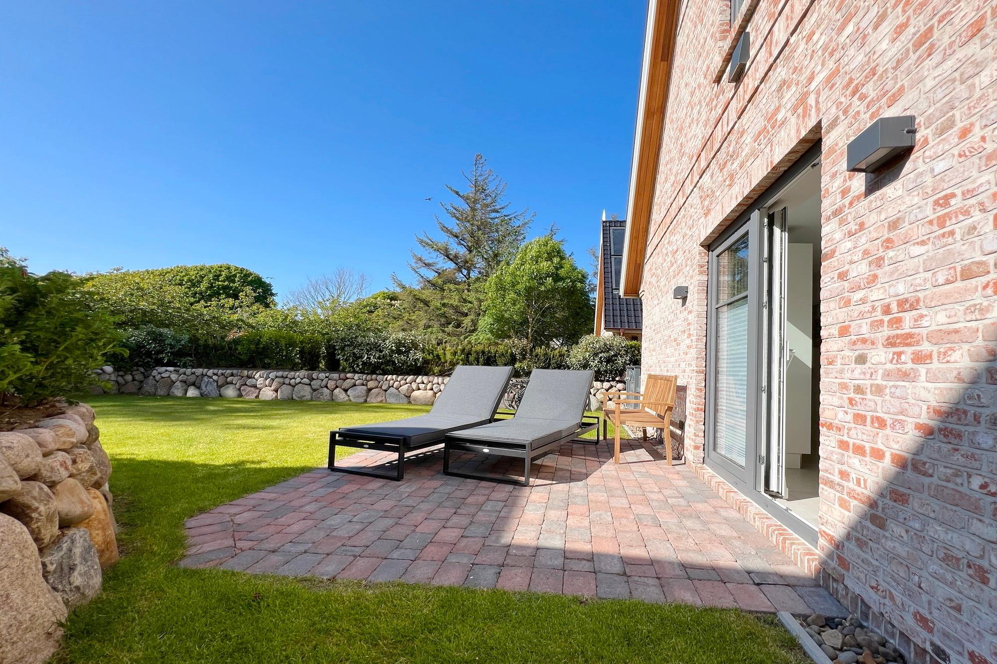 Zwei Terrassen ( Süden und Westen ) mit bequemen Gartenmöbeln und Saisonstrandkorb bieten an sonnigen warmen Tagen genug Platz, um den Urlaub auch im Garten zu genießen.