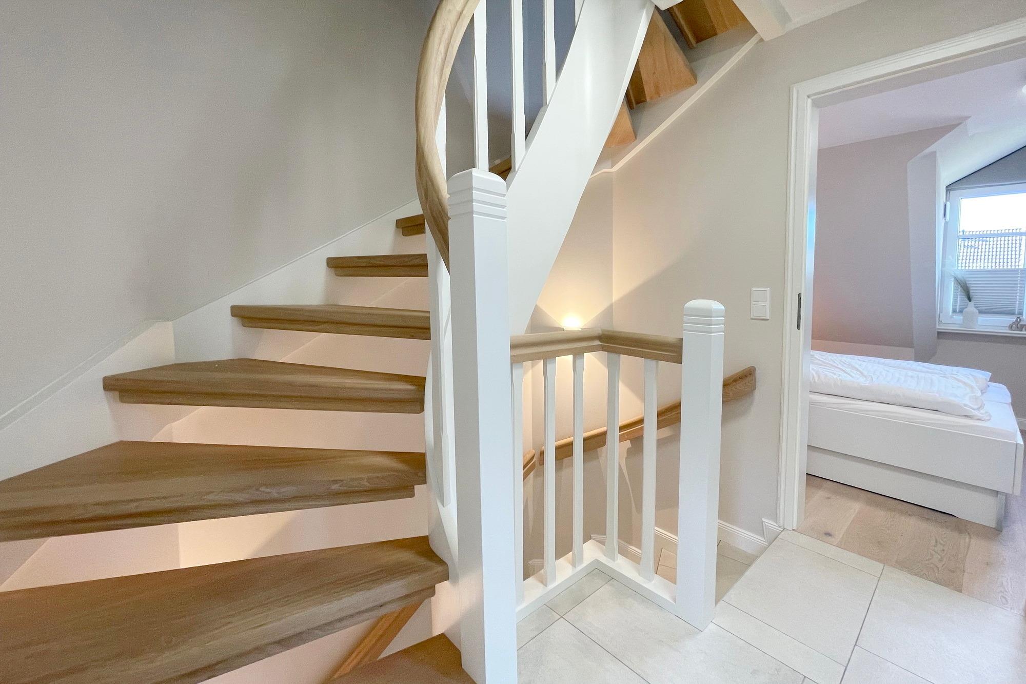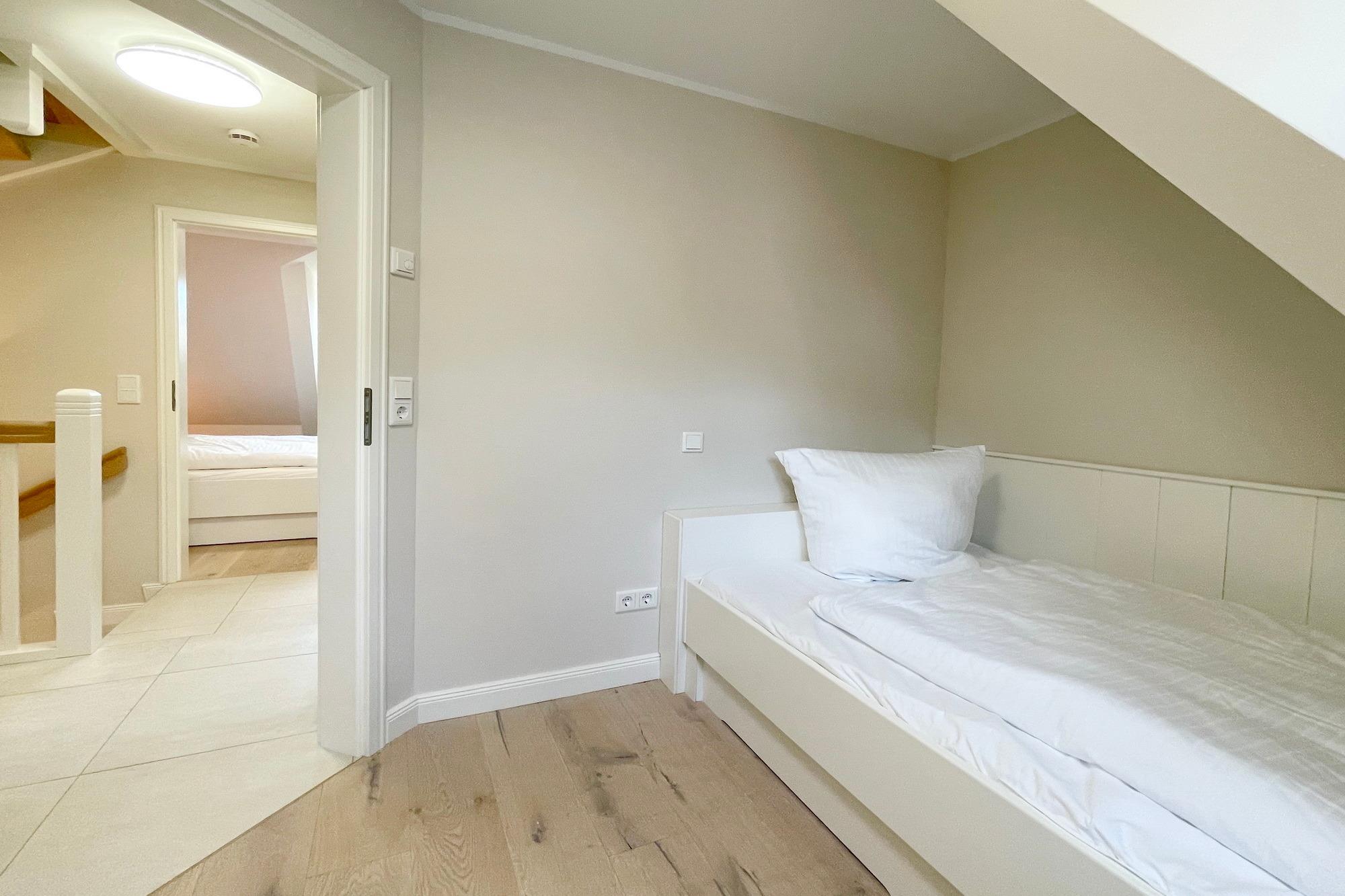 OG: 1 Schlafzimmer mit Doppelbett, 1 Schlafzimmer mit Einzelbett und ein modernes Duschbad. Zusätzlicher Raum im SB mit weiterer Schlafmöglichkeit.