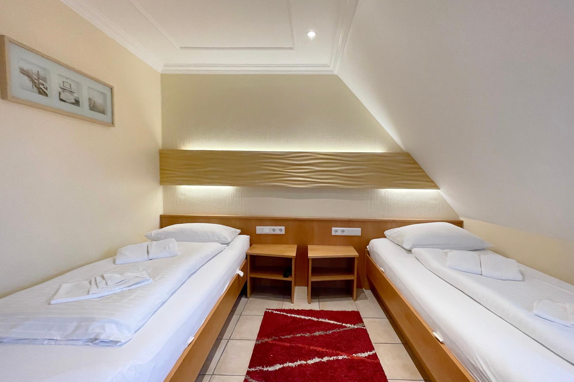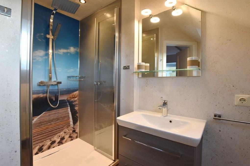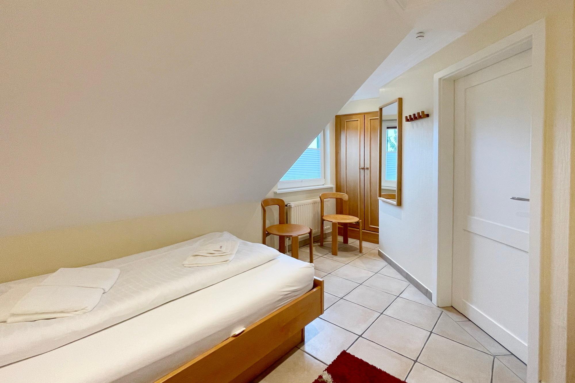 Moderne Ferienwohnung ( OG / DG )mit Balkon, Wohnzimmer mit gemütlicher Sitzgruppe und Eßecke, offene Küche mit Cerankochfeld, und Geschirrspüler, Smart-TV, 2 Schlafzimmer für je 2 Personen ( 1x Doppelbetten, 2x Einzelbetten ) mit jeweils eigenem Badezimmer mit Dusche WC und Waschbecken, im UG befinden sich für die Gäste des Hauses Waschmaschine und Trockner gegen Gebühr. 1 PKW-Stellplatz auf dem Grundstück. Für die Gäste im Ruusenhüs steht ein gemeinschaftlich genutztes Gartenhaus für Fahrräder zur Verfügung. Gerne dürfen Sie hier ein gut erzogenes Haustier mitbringen. Dafür wird dann eine einmalige Haustiergebühr berechnet.
