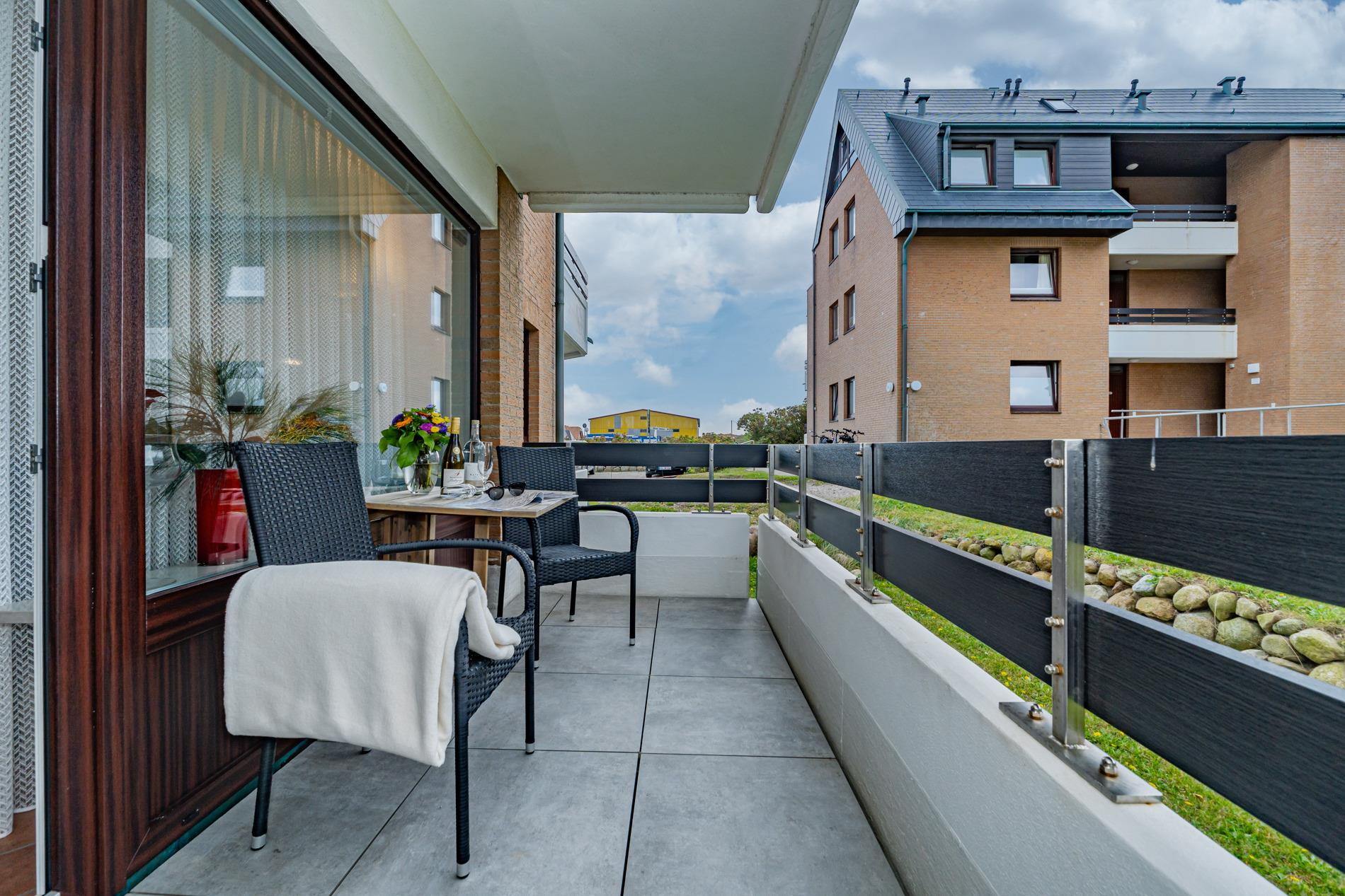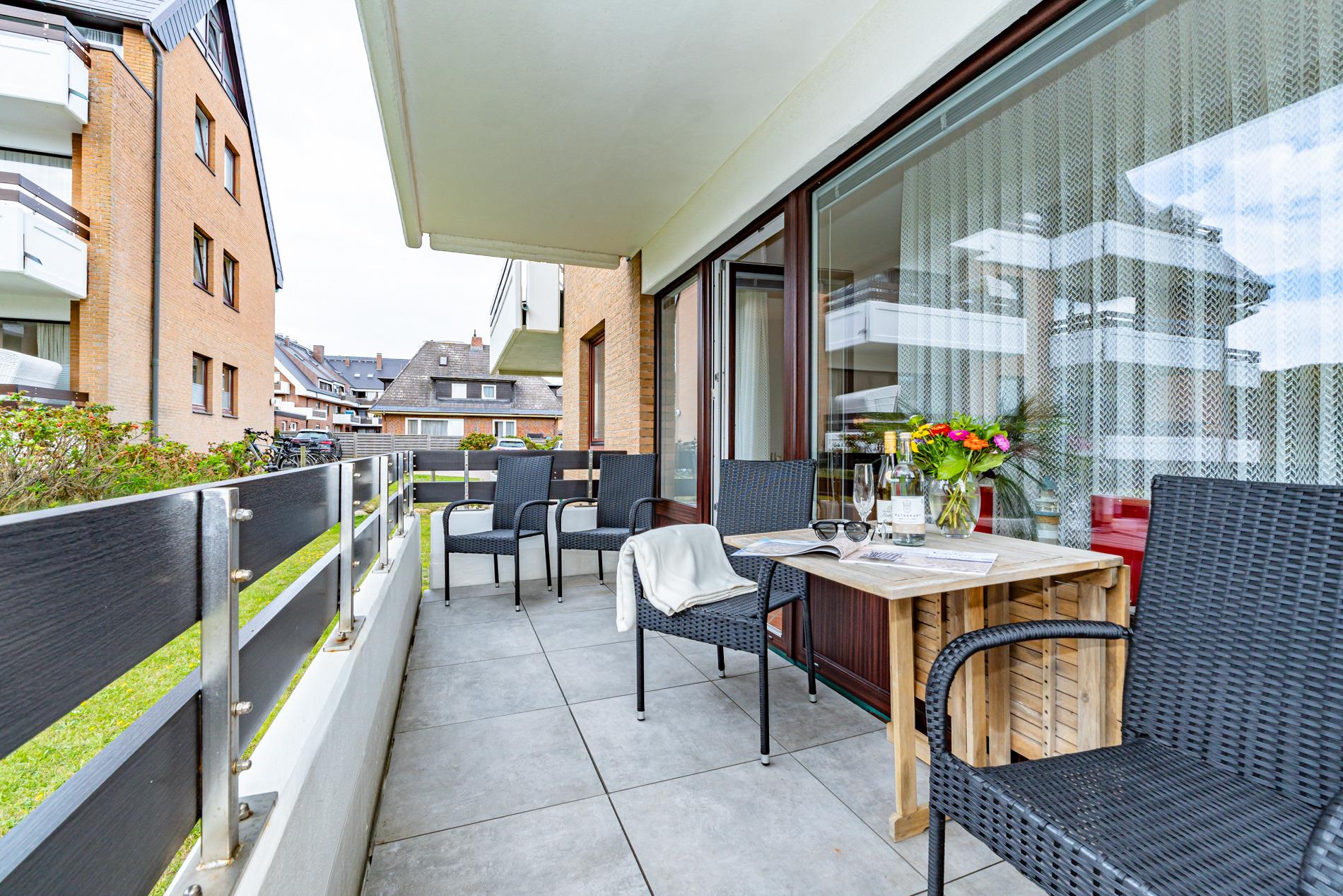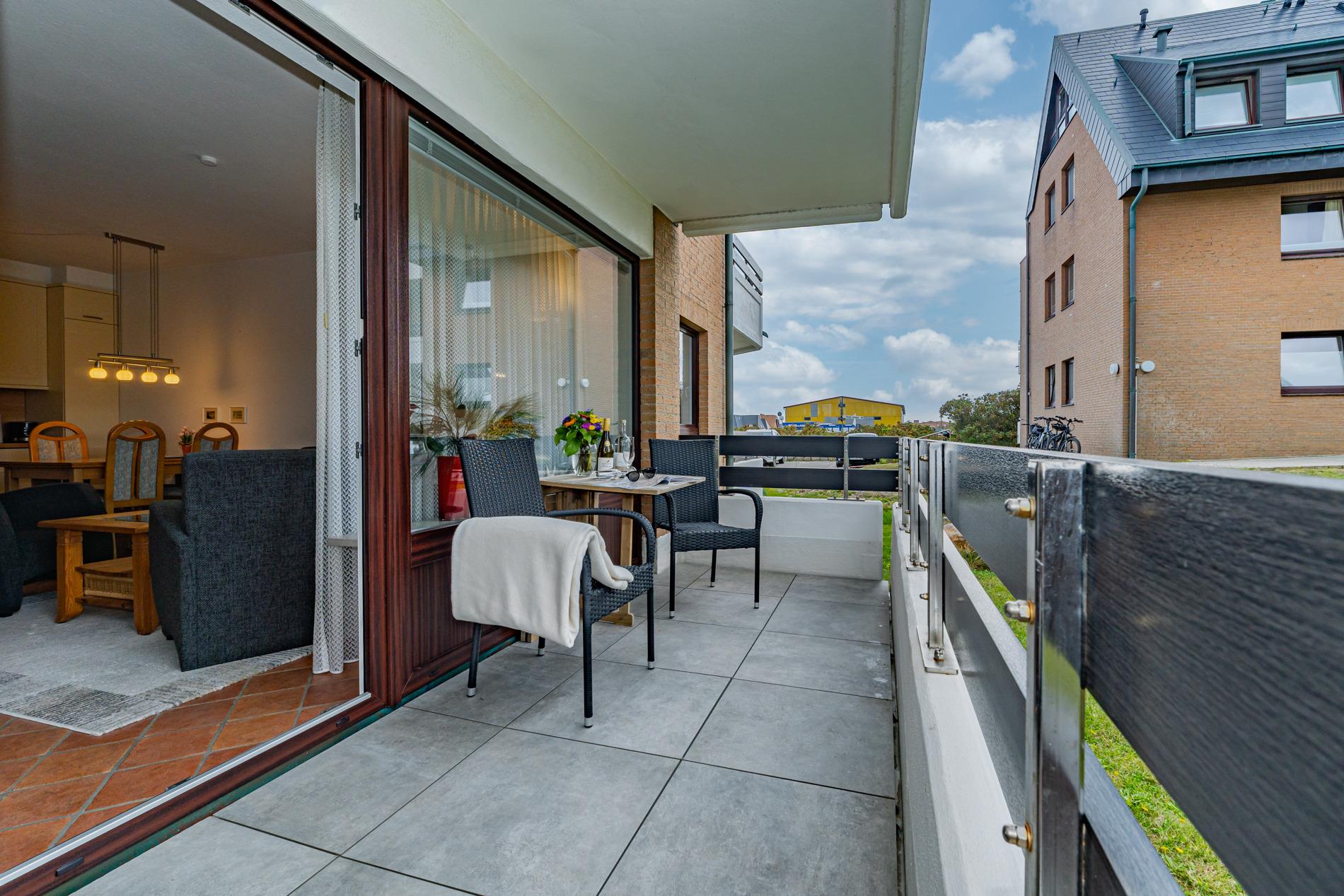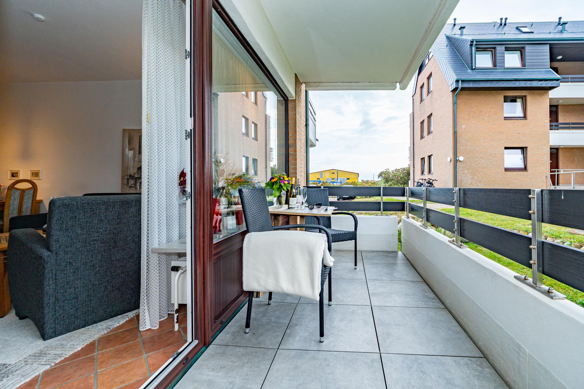 Erwartet Sie diese komplett geflieste 2-Zimmer-Nichtraucher-Ferienwohnung im Parterre zur Westseite. Mit ca. 45 m² Wohnfläche und einem Westbalkon, der in der Nachmittagssonne mit komfortablen Balkonmöbeln und Auflagen zum Entspannen einlädt, bietet die Wohnung Platz für maximal 4 Personen.