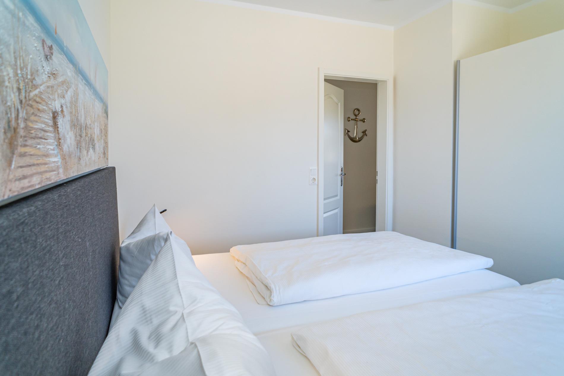Im Schlafzimmer sorgt ein hochwertiges, neues Boxspring-Doppelbett mit Einzelmatratzen (180 x 200 cm) für optimalen Schlafkomfort. Zwei praktische Nachttische sowie ein großer Einbau-Kleiderschrank runden diesen Raum ab.