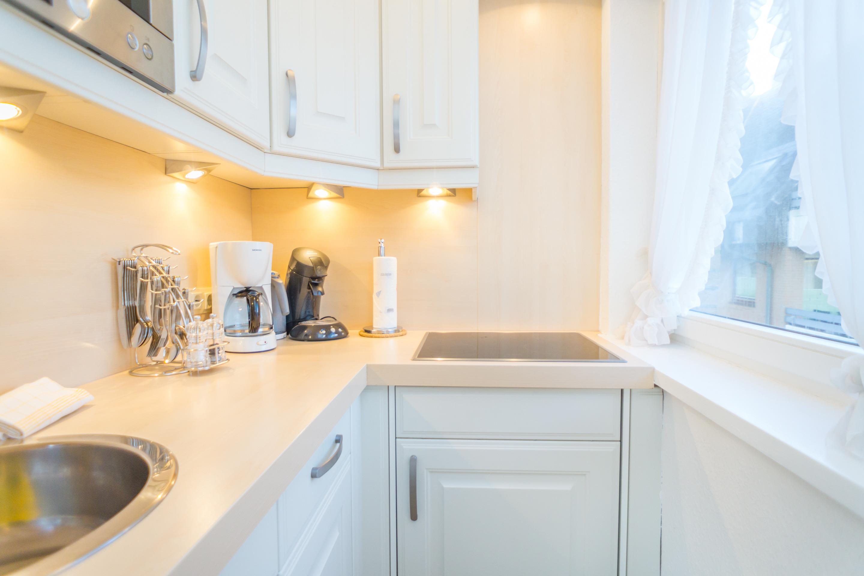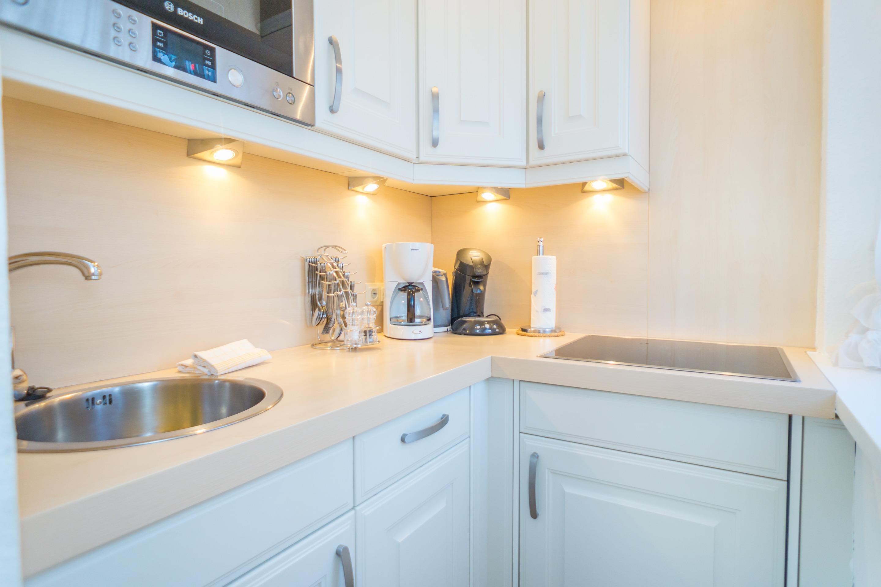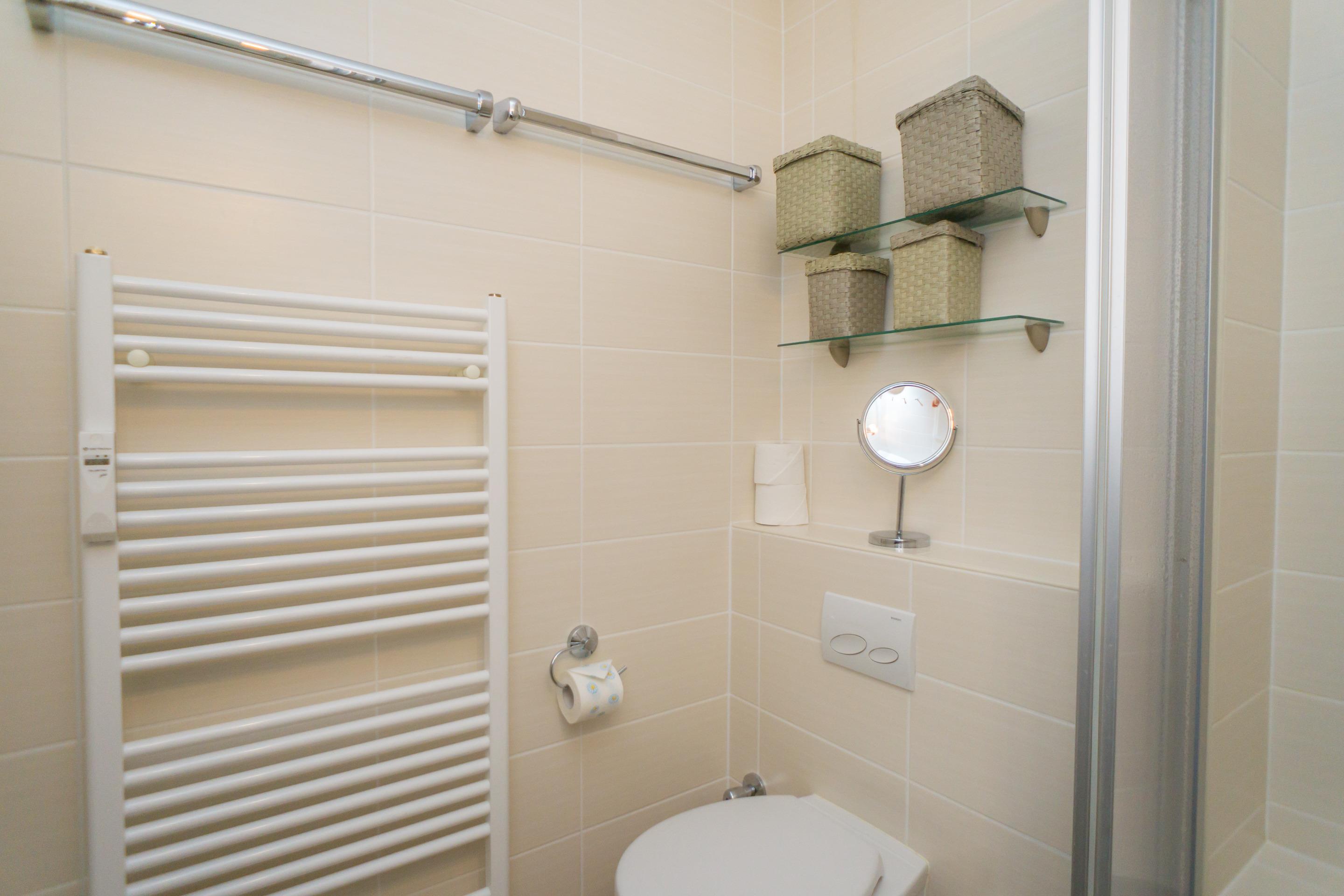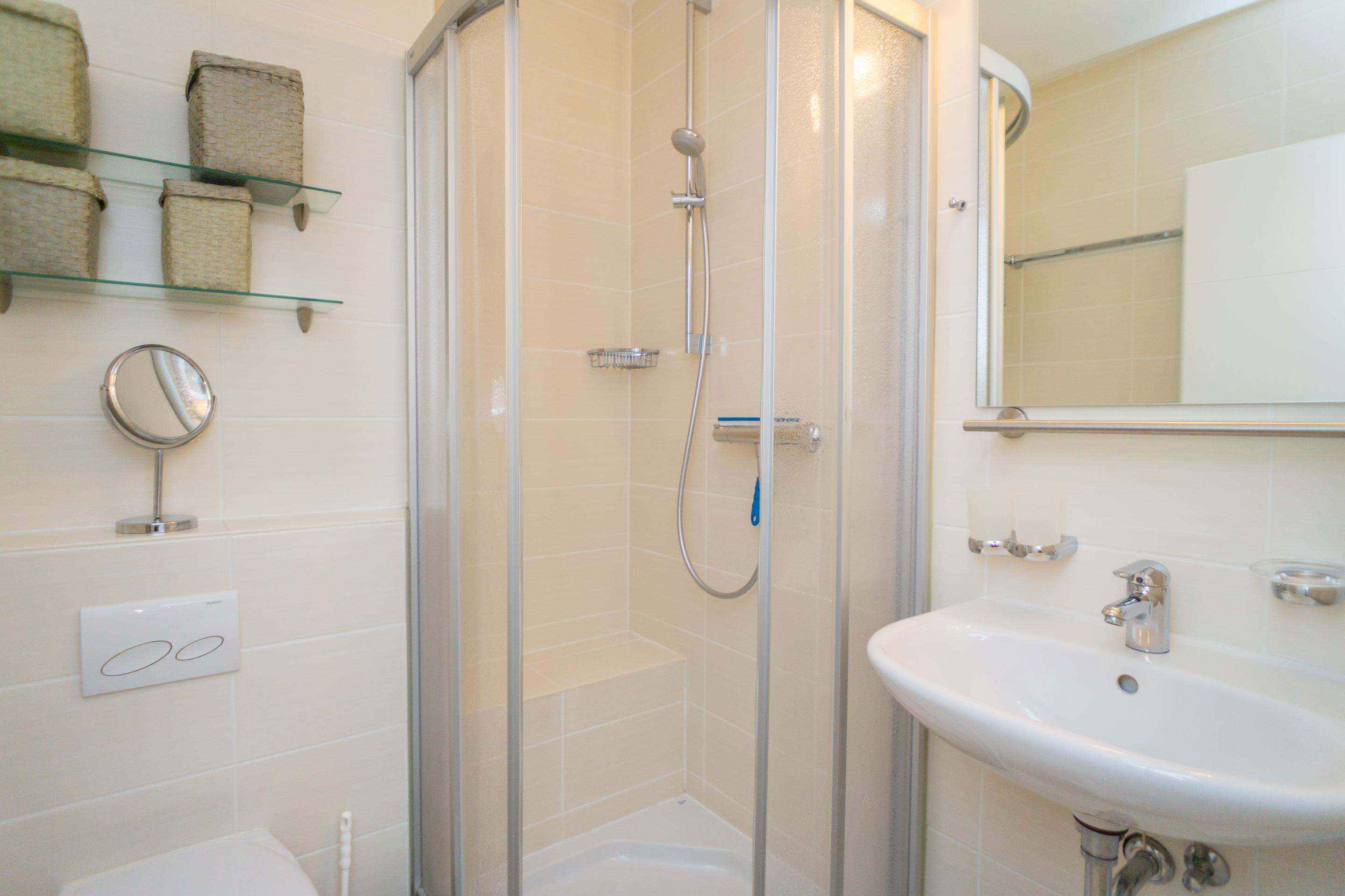 Die moderne Kochnische verfügt über eine Mikrowelle, einen Geschirrspüler, ein Cerankochfeld und hat ein Fenster. Kaffeemaschine, Wasserkocher und Toaster gehören selbstverständlich zur Grundausstattung. Das separate Schlafzimmer ist mit einem feststehenden Doppelbett ausgestattet, das aus zwei Einzelmatratzen (86 x 200 cm) besteht. Das helle Duschbad/WC bietet eine Dusche, ein WC und einen Waschtisch.